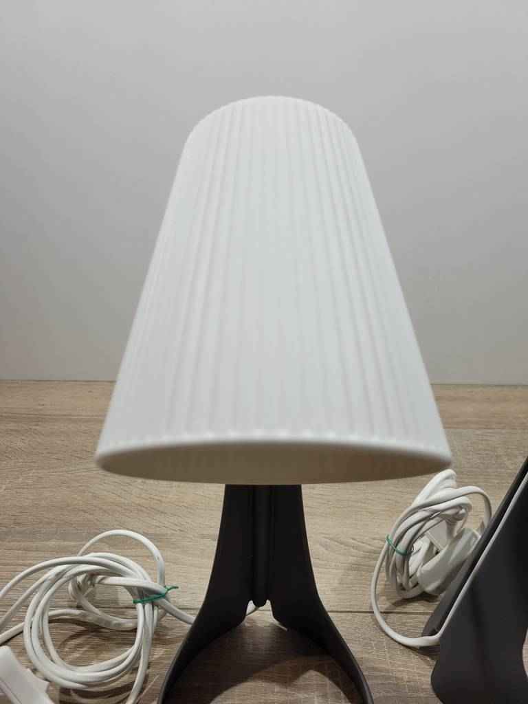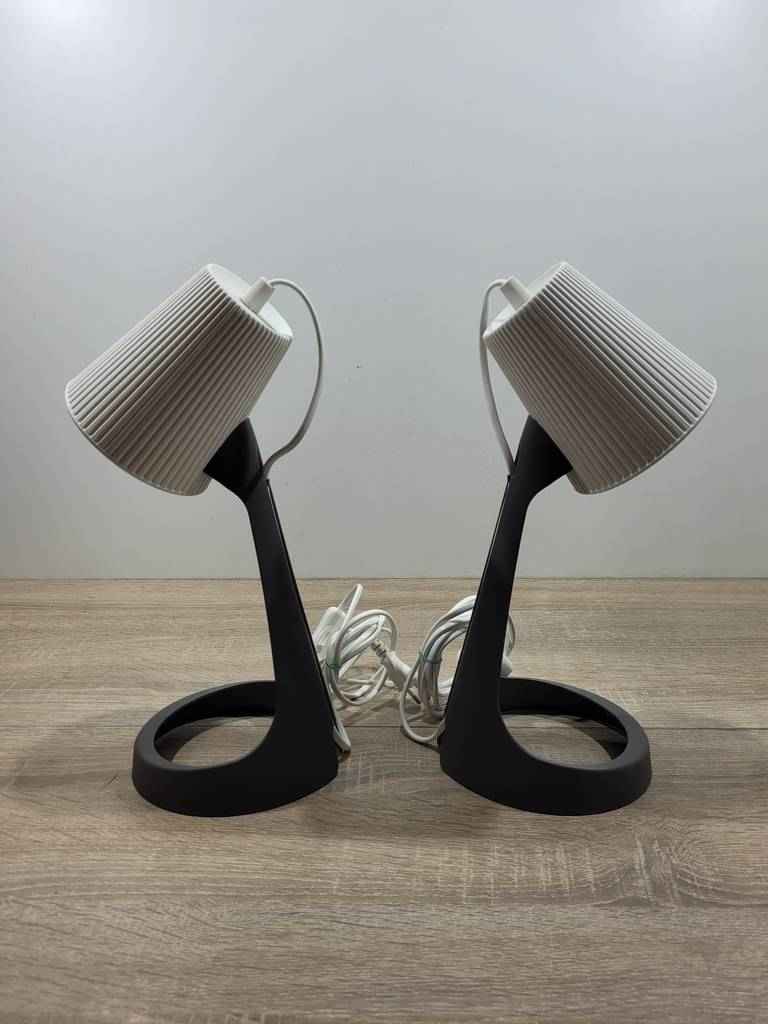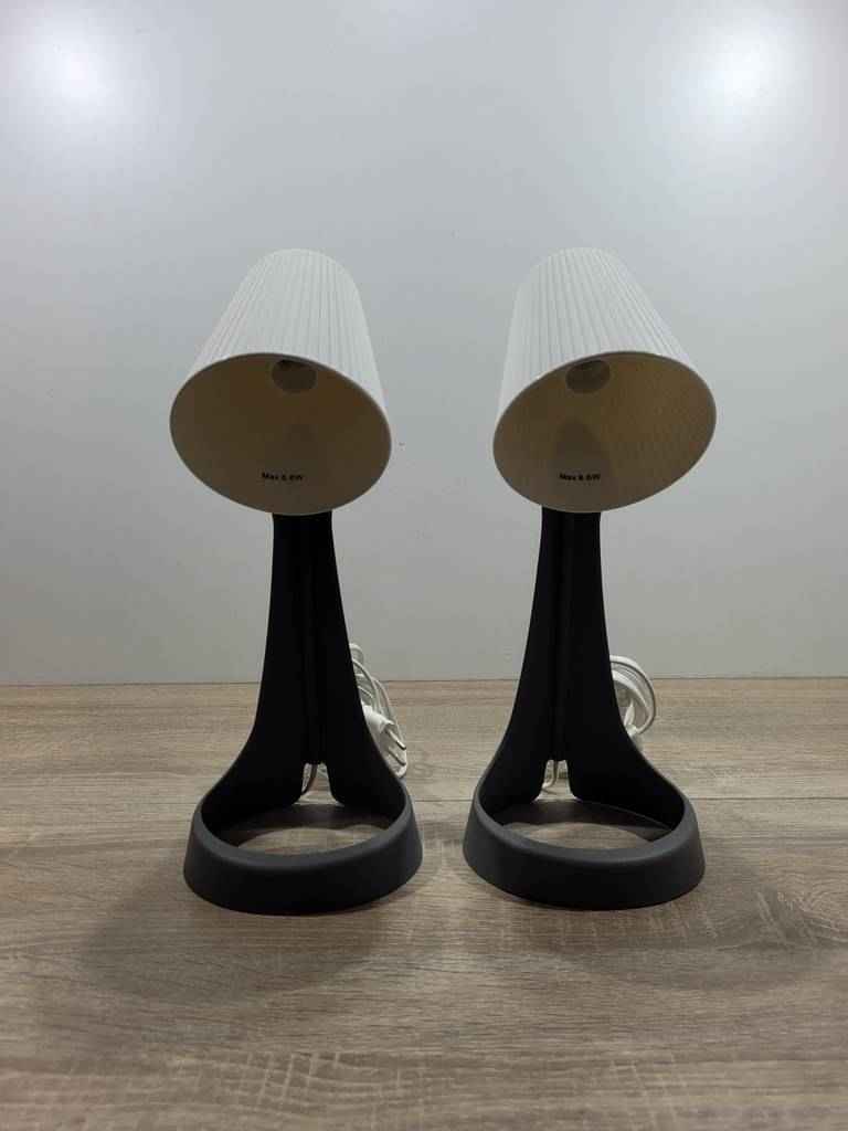 Juego de dos lámparas de plástico con una base muy original en color negro y en la parte superior con un punto de luz rodeado por una tulipa blanca. Se trata de unas lámparas ideales para colocar en un dormitorio encima de unas bonitas mesitas al lado de nuestra cama. Como podemos observar en las fotografías se encuentran en buenas condiciones.