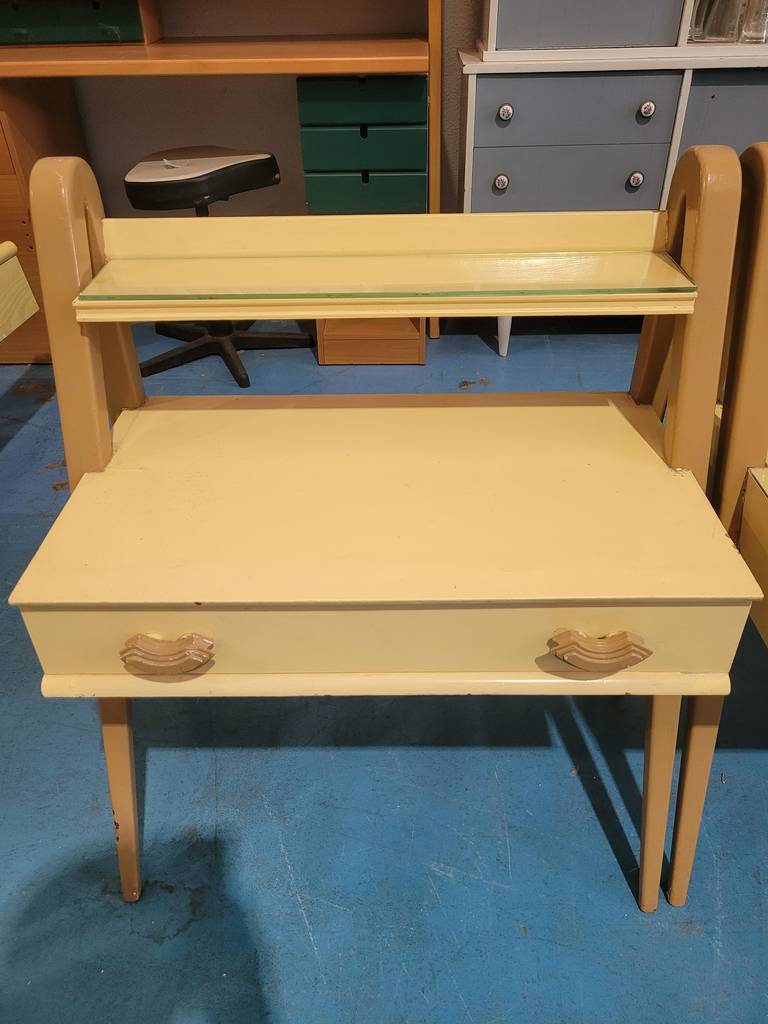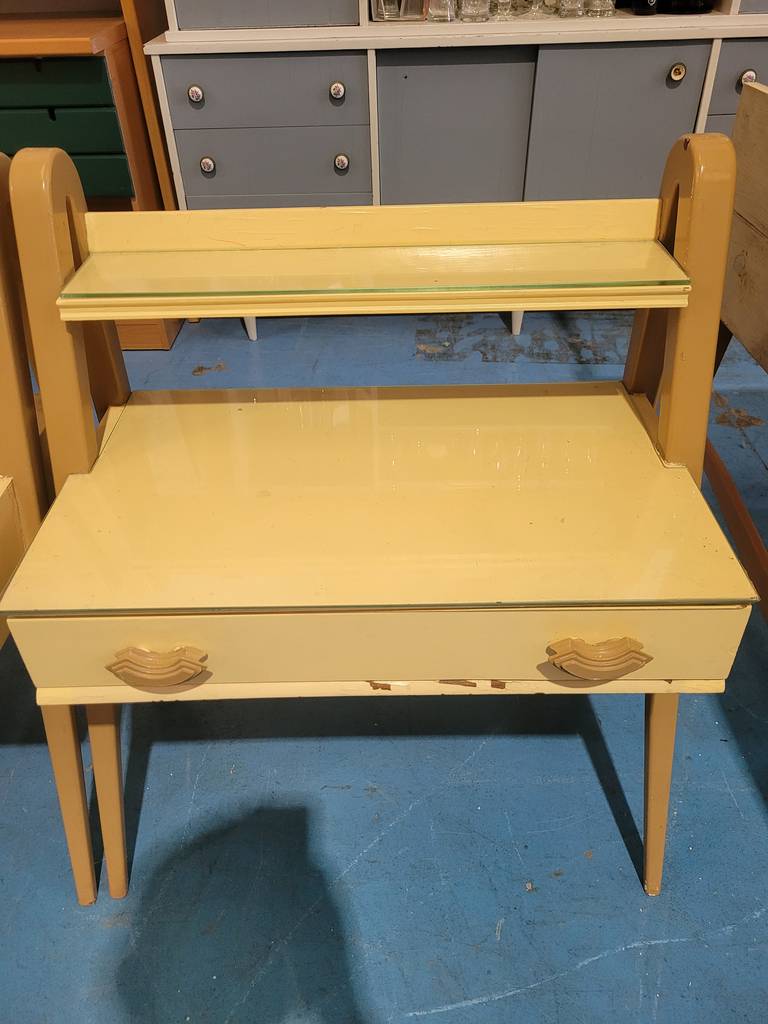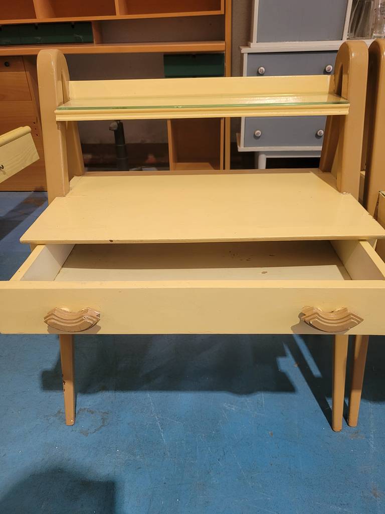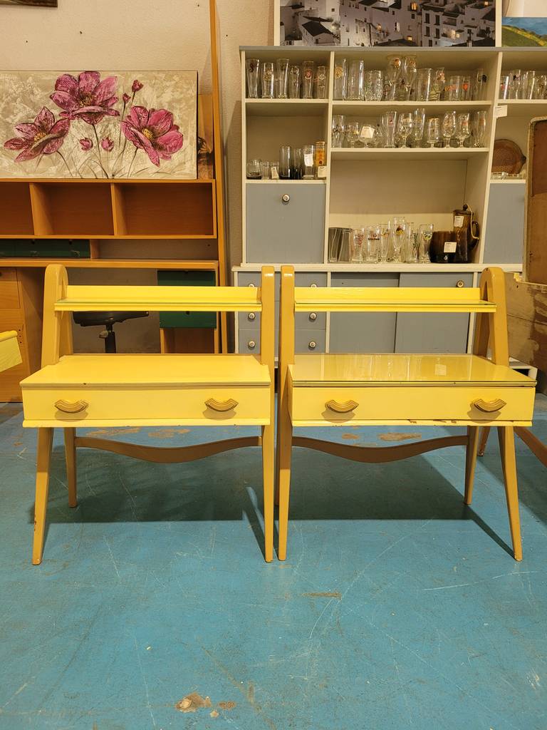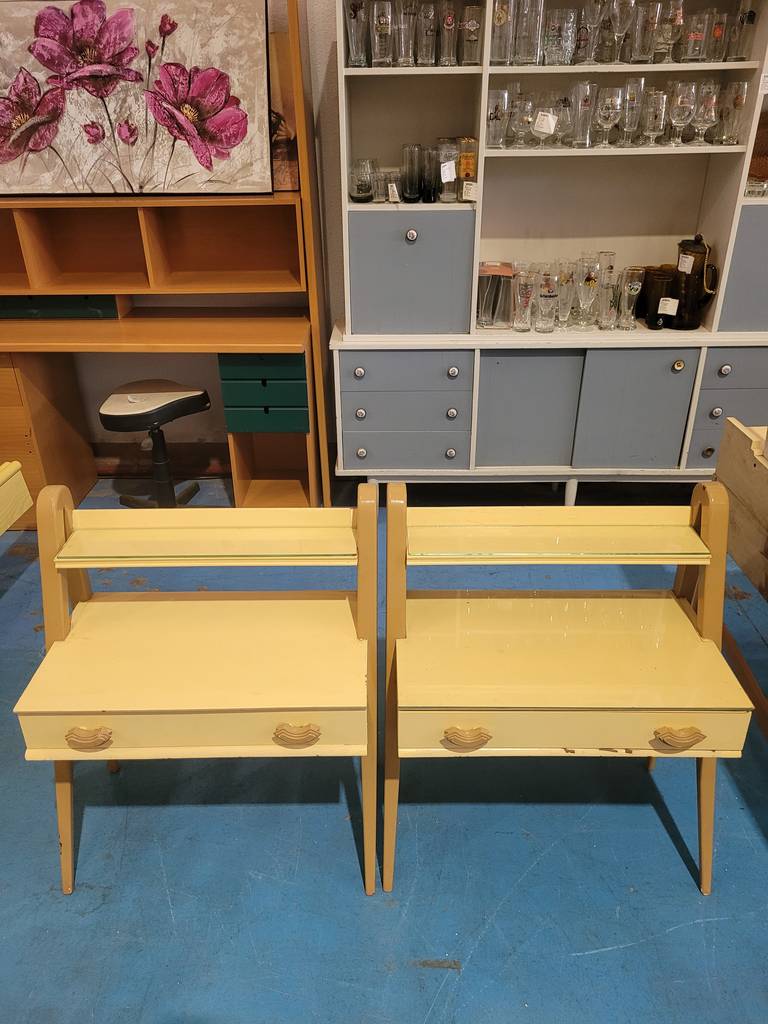 Conjunto de mesitas de estilo clásico muy bonitas y con un diseño muy original que han sido fabricadas con madera de buena calidad y robusta. Se componen de una parte frontal con un amplio cajón con doble tirador incorporado. Son ideales para colocar en un dormitorio al lado de nuestra cama. Como podemos observar en las fotografías se encuentran en buenas condiciones.