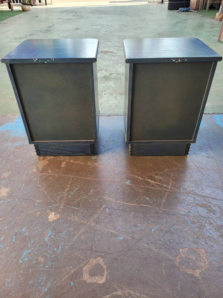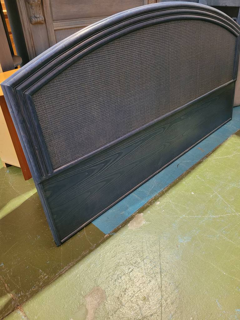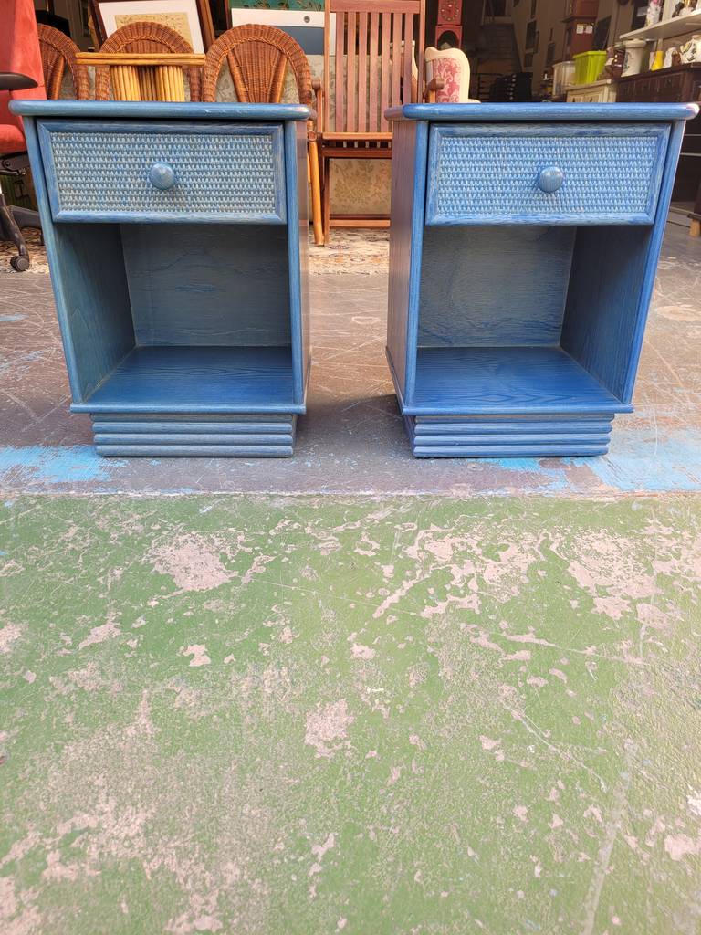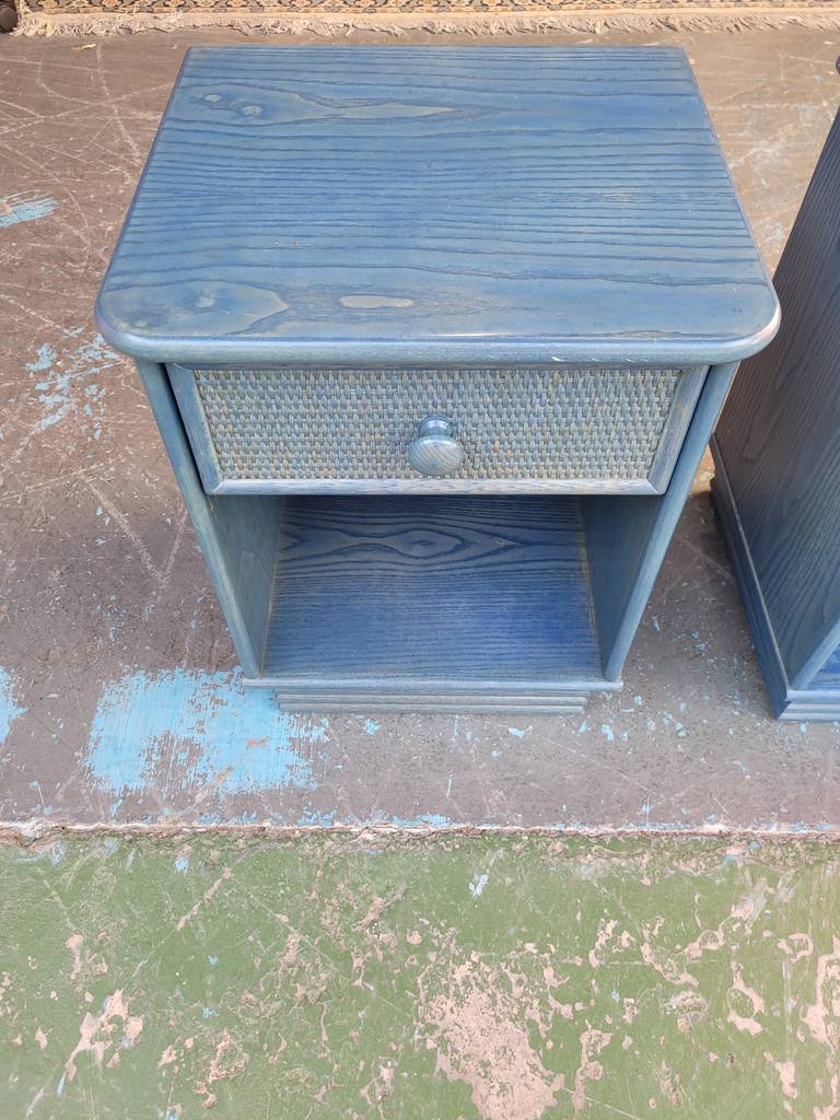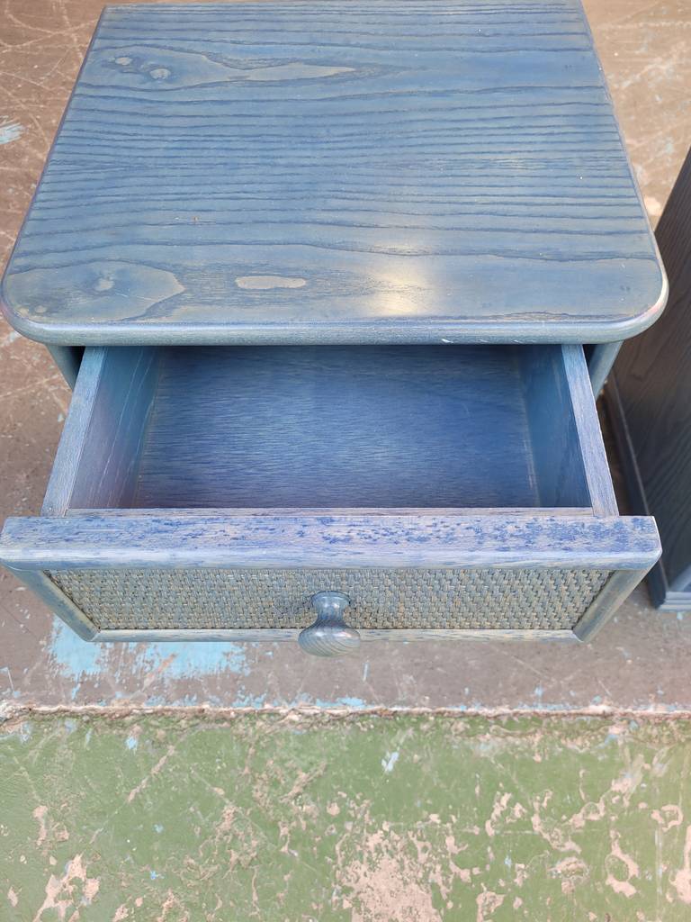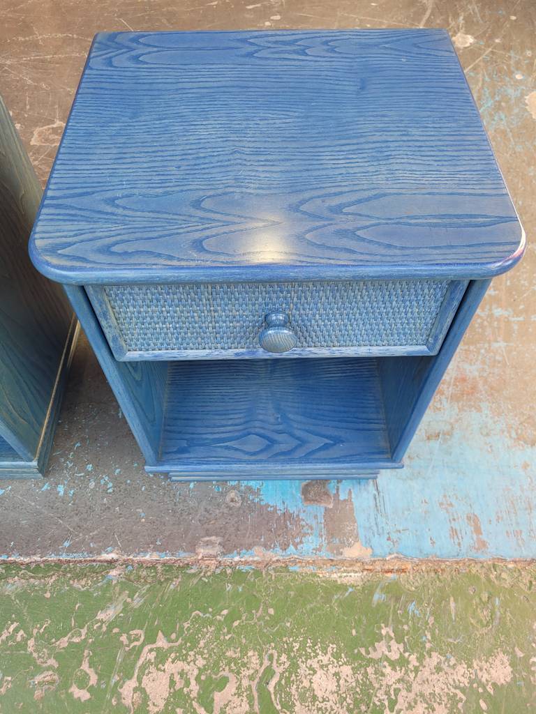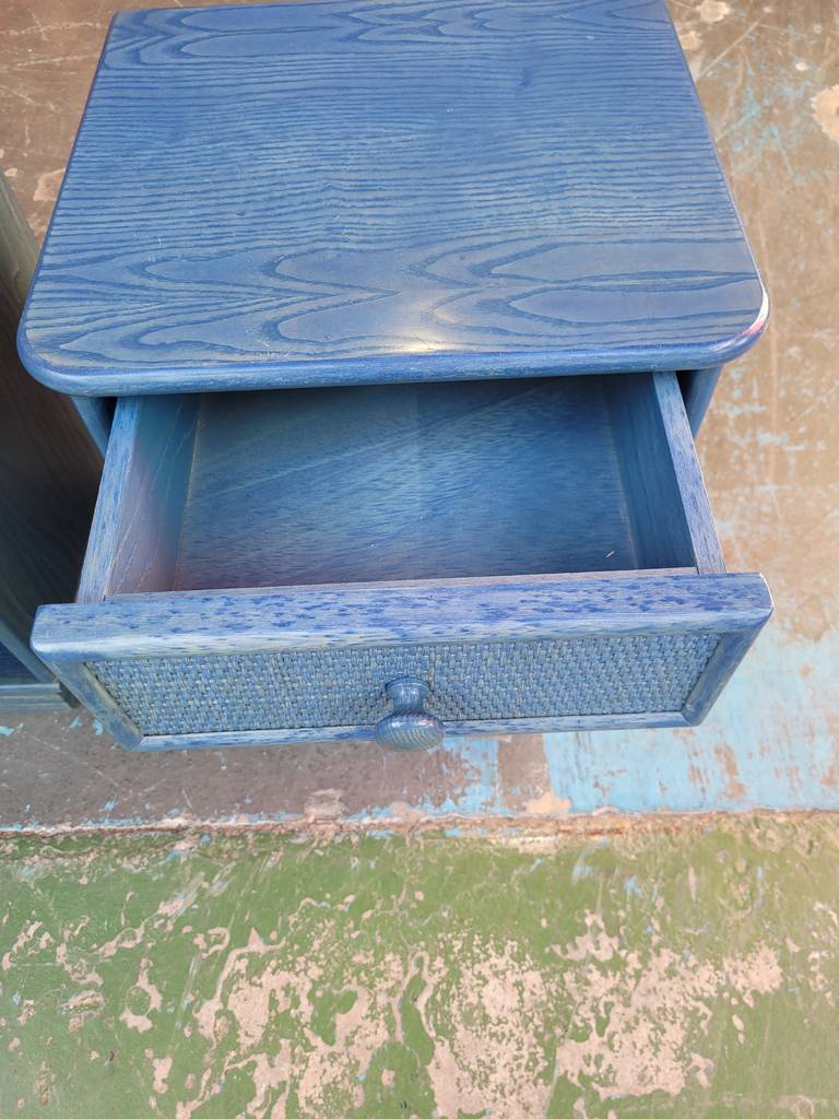 Conjunto formado por dos mesitas de noche y un cabezal fabricado en madera de buena calidad de color azul. Se trata de dos mesitas de noche que cuentan con un cajón con un tirador esférico cada una y un habitáculo que van acompañadas de un cabezal para una cama de matrimonio. Es un conjunto ideal para colocarlo en un dormitorio de matrimonio. Como se puede observar en las fotografías se encuentran en buenas condiciones.