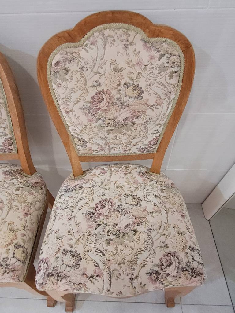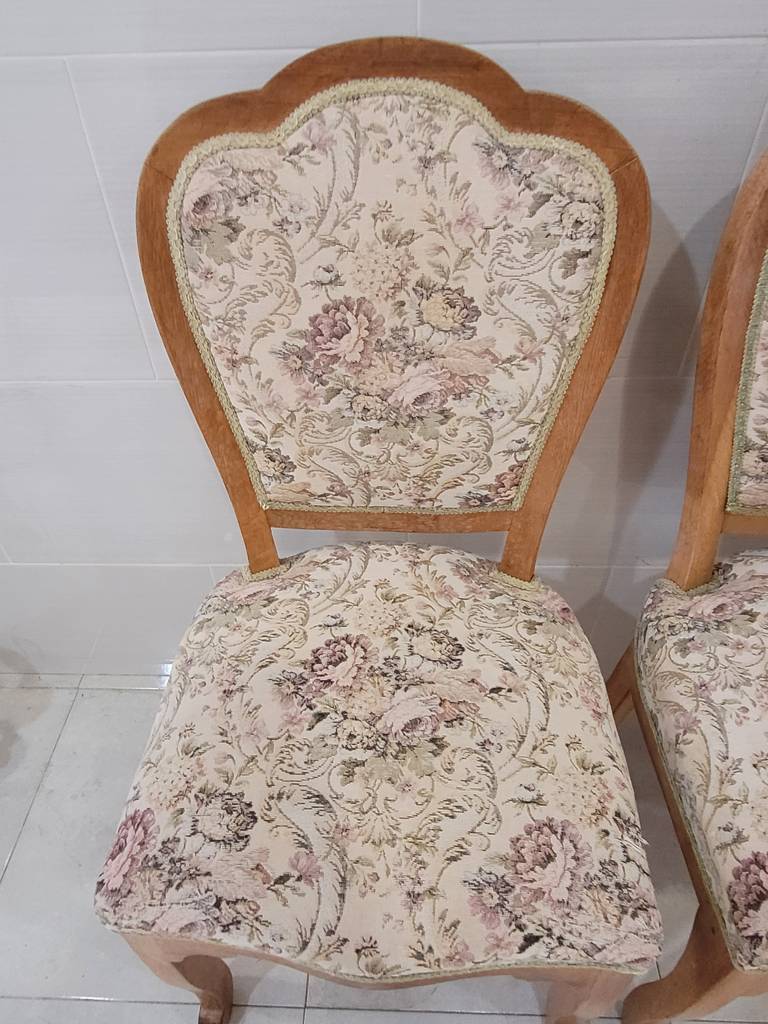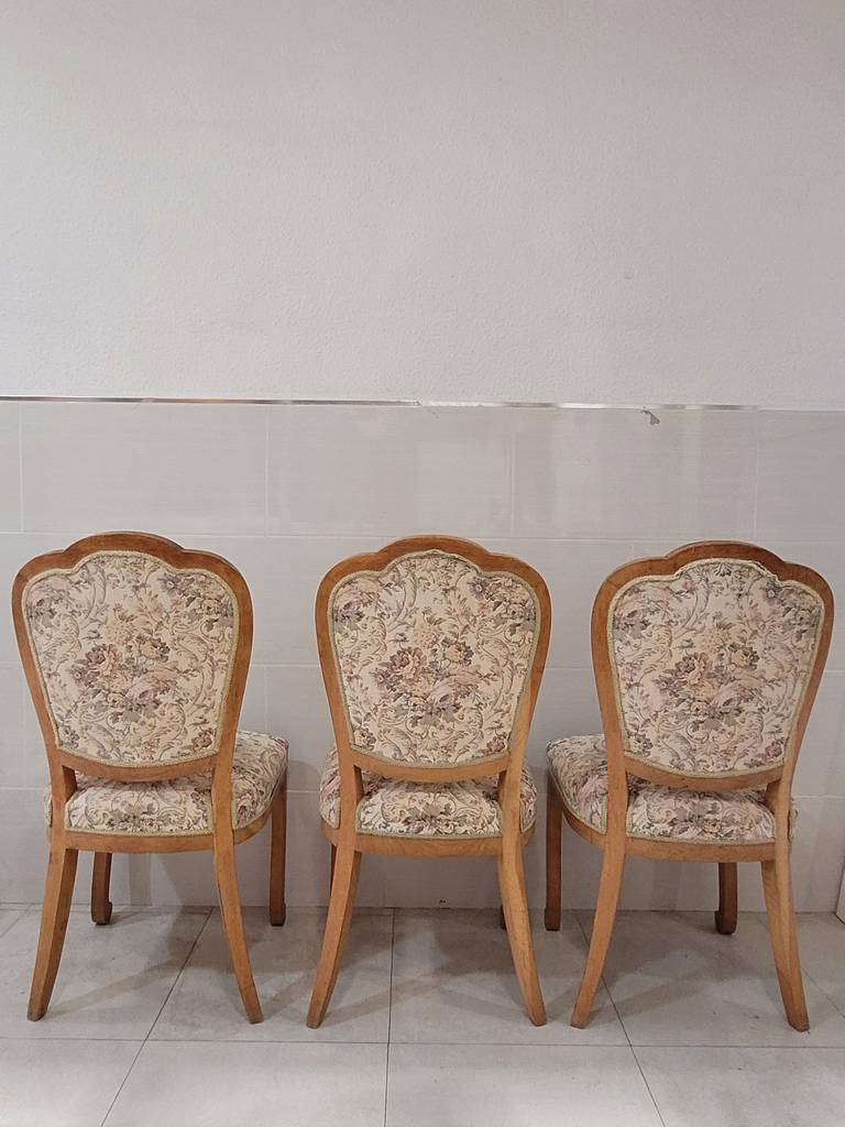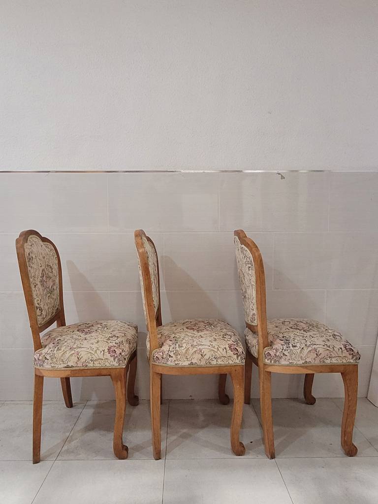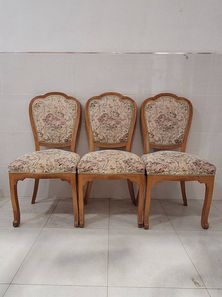 Conjunto formado por tres sillas de estilo clásico cuya estructura está fabricada en madera de buena calidad de color marrón. Se trata de tres sillas que tienen un asiento y un respaldo tapizados con una bonita tela con estampados de flores en tonos beige. Son unas sillas ideales para amueblar un salón comedor de estilo clásico y vintage. Como se puede observar en las fotografías se encuentra en buenas condiciones.
