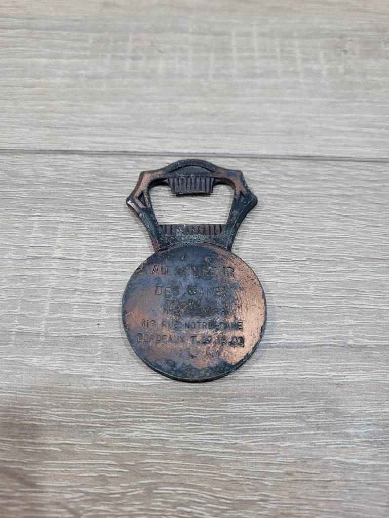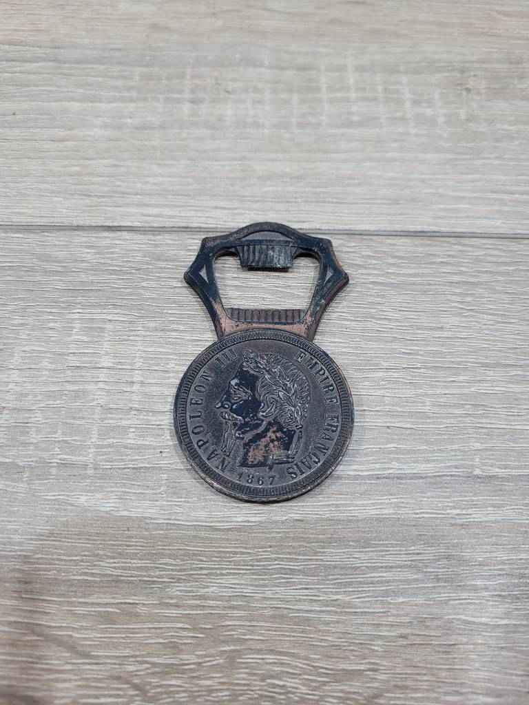Abridor de botellas fabricado en cobre que lleva troquelada la cara del conquistador Napoleón tercero y está fabricado en Francia. Este objeto es ideal para los coleccionistas de objetos de este personaje histórico o para decorar la estancia de cualquier hogar. Como se puede ver en las fotografías se encuentra en buenas condiciones para ser utilizado.