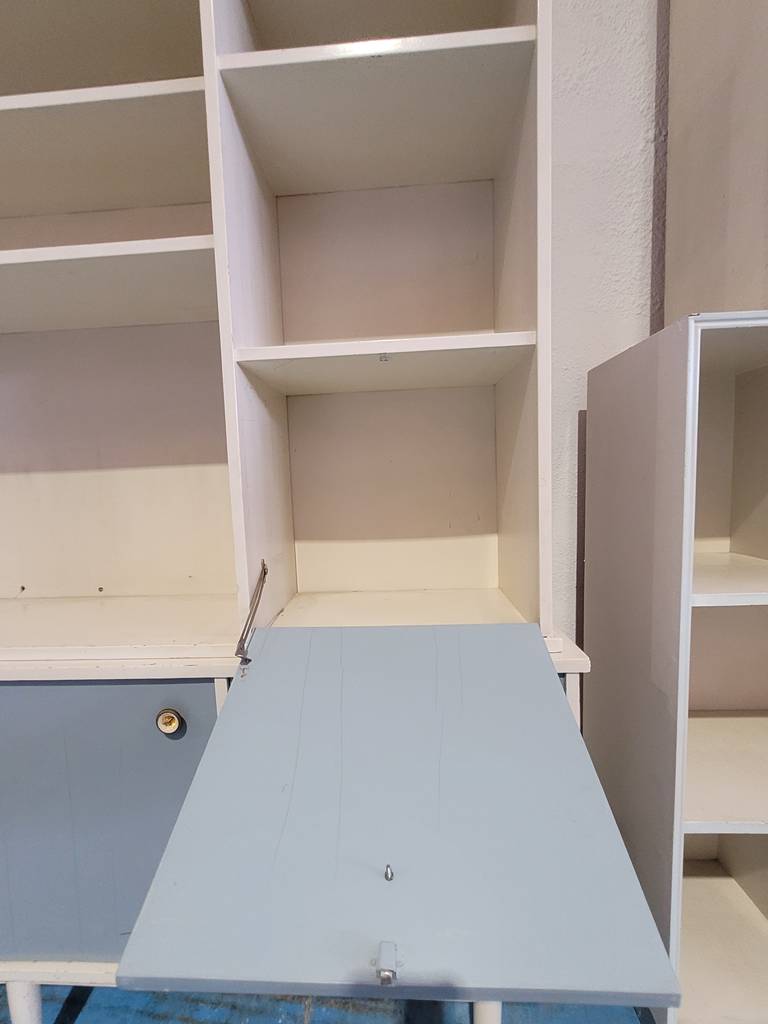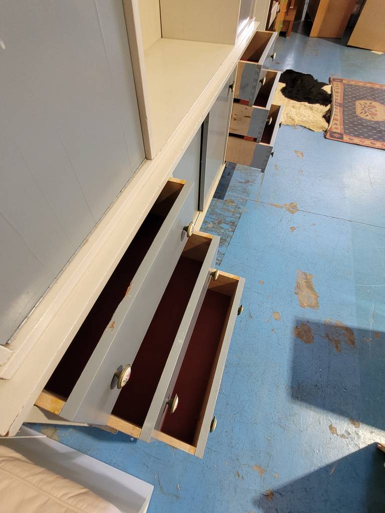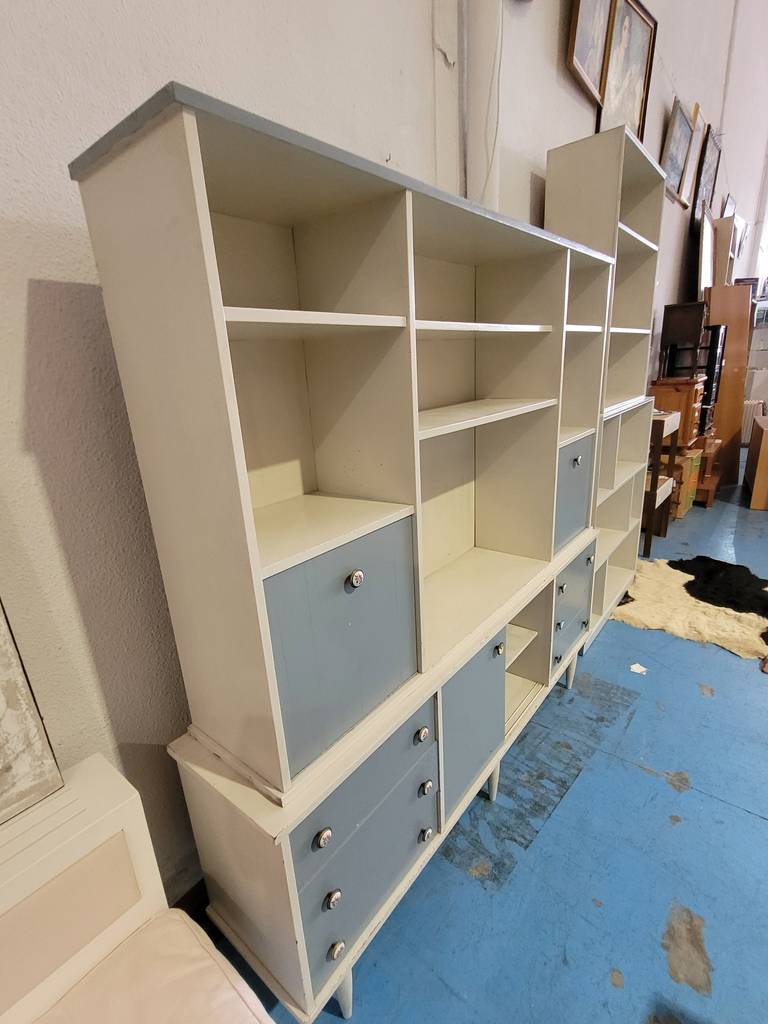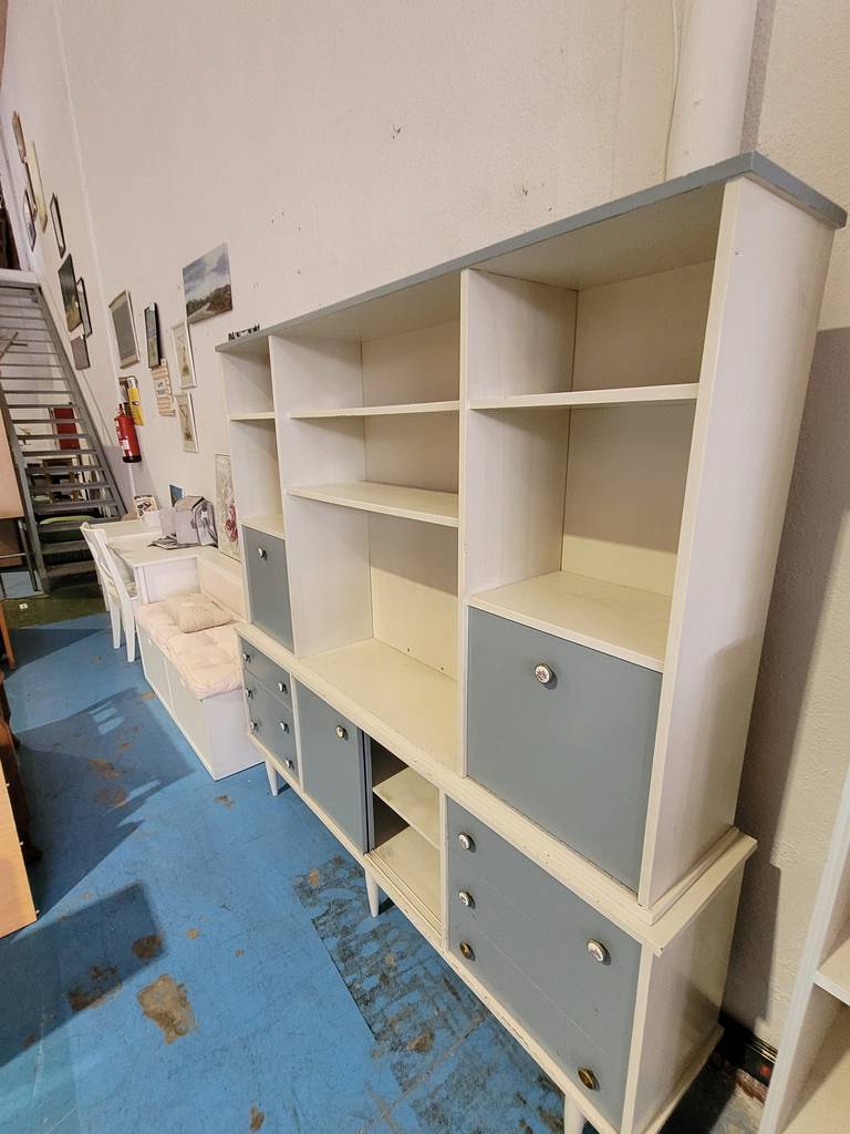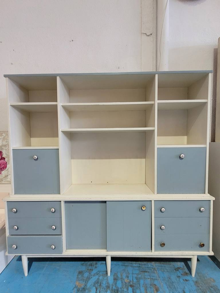 Alacena de estilo vintage de color blanco con detalles en azul fabricada en madera de buena calidad. Se trata de una alacena de gran tamaño que consta de varios cajones, puertas y habitáculos para colocar y guardar multitud de objetos y enseres. La alacena se puede colocar en un salón comedor amplio. Como se puede observar en las fotografías se encuentra en buenas condiciones.