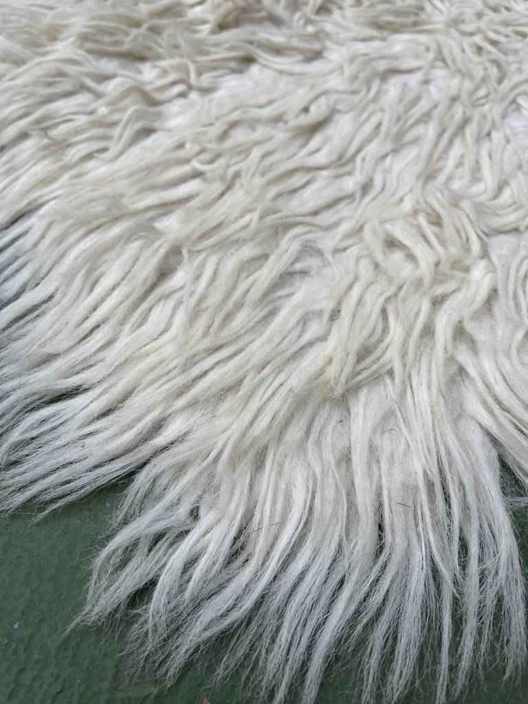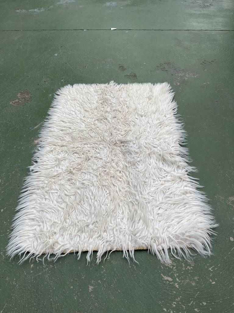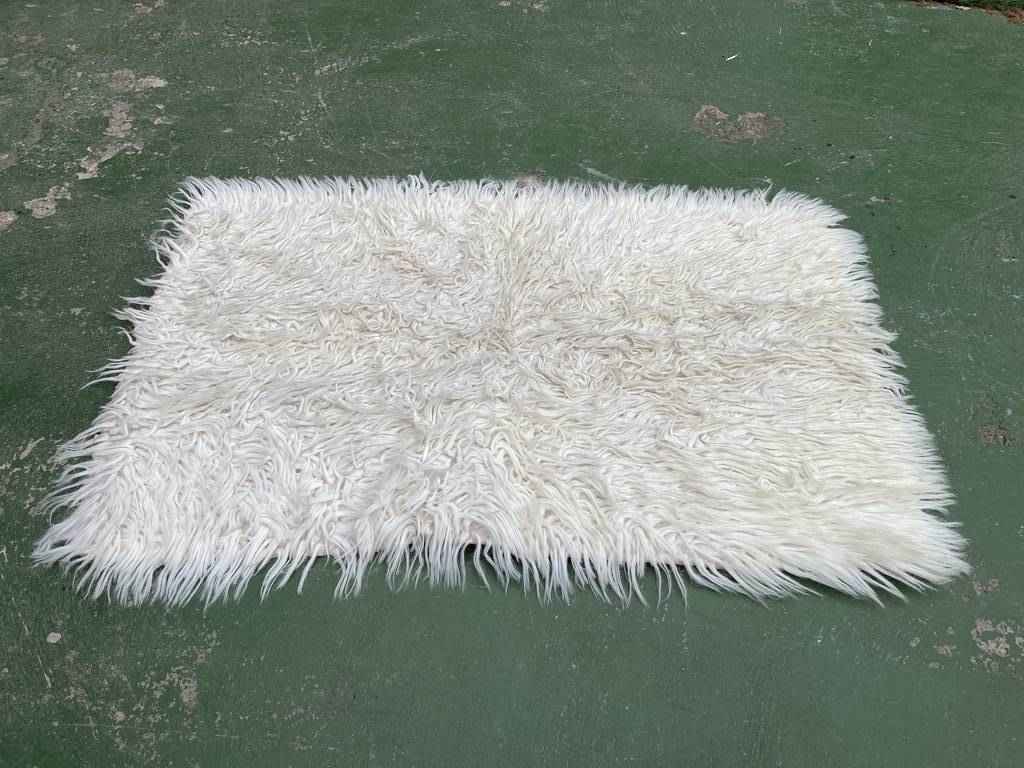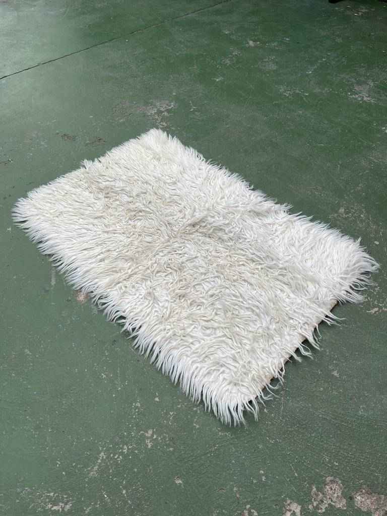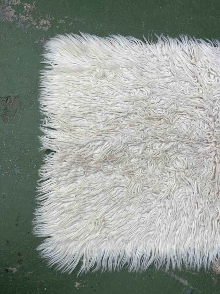 Alfombra de color blanco y con forma rectangular. Esta alfombra con una textura de pelo es muy suave y agradable al tacto. Es ideal para colocar al lado de nuestra cama o en un baño. Como podemos observar en las fotografías se encuentra en buen estado.