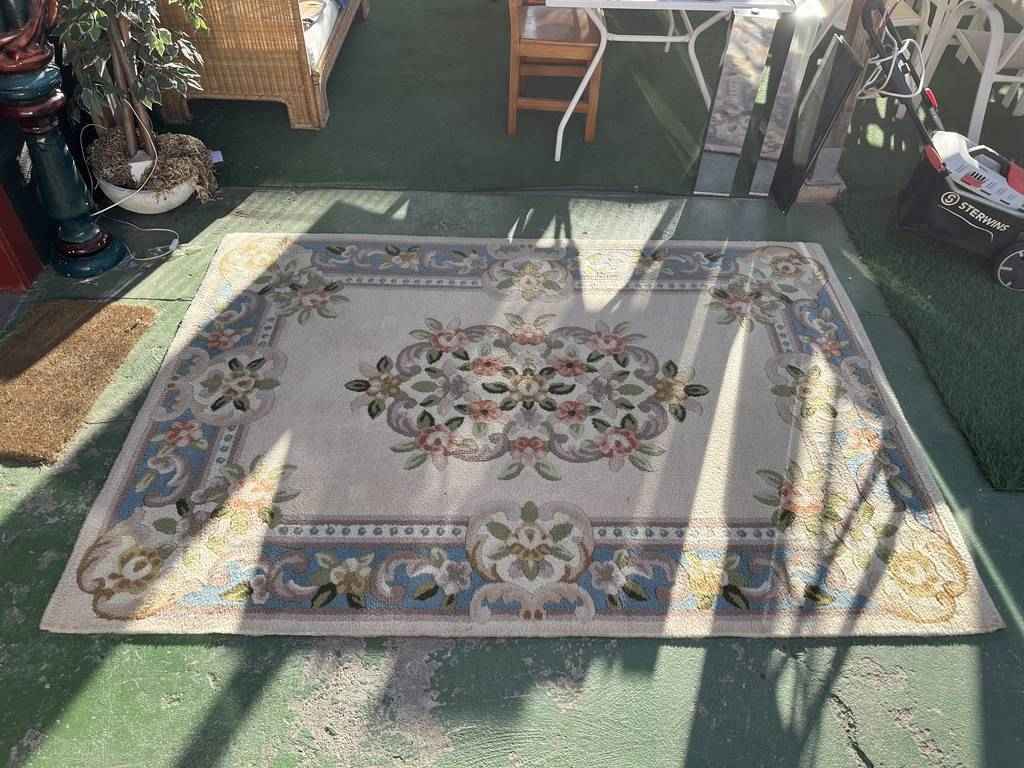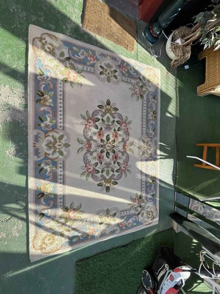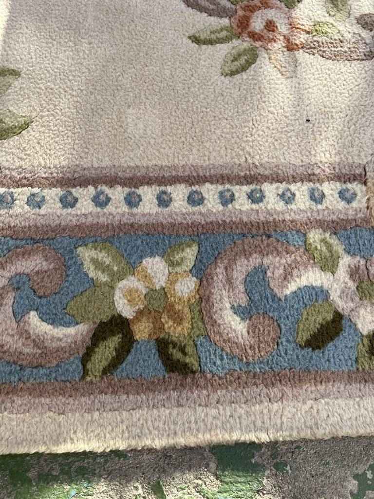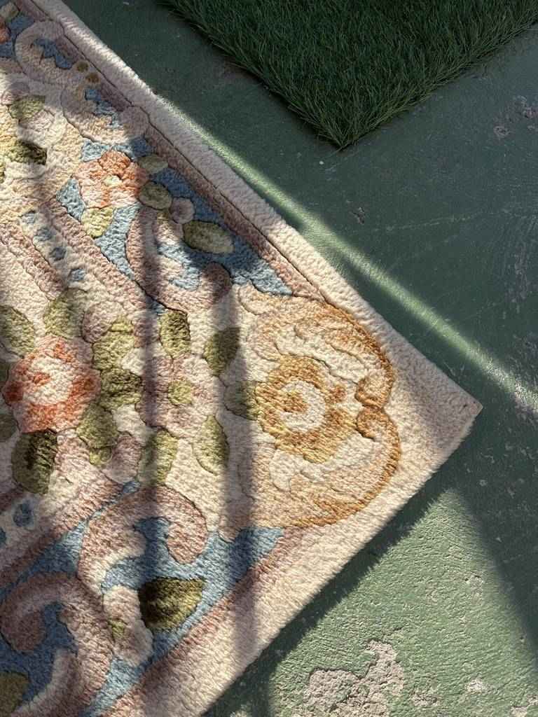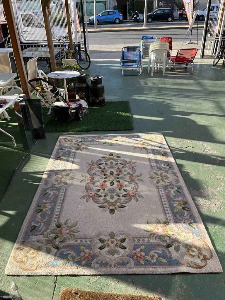 Alfombra de estilo moderno con un diseño muy original. Tiene toda la parte superior llena de dibujos de estilo floral multicolor, que llaman mucho la atención. Tiene forma rectangular y es perfecta para colocar en salas de estar, y darle con ella, un toque cálido y elegante al hogar. Se encuentra bien cuidada como se puede ver en las fotografías.