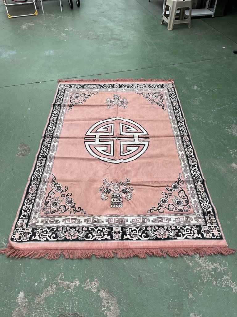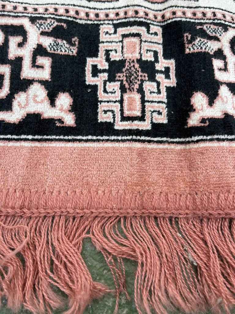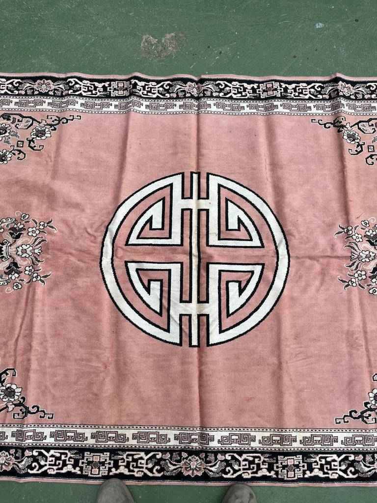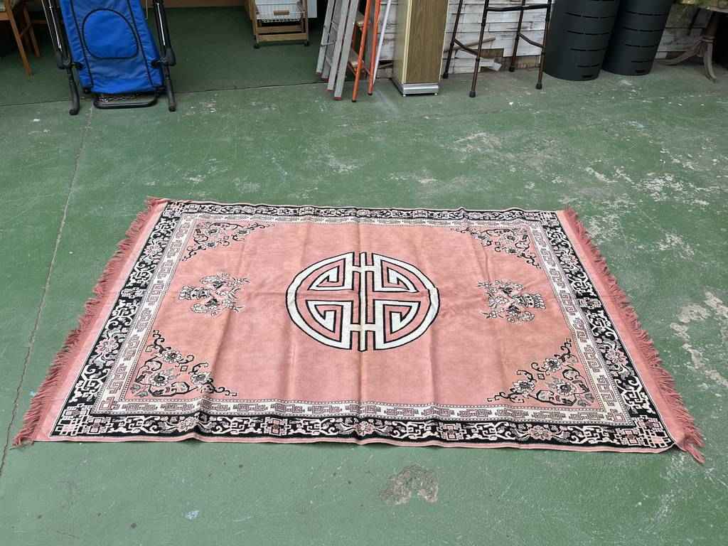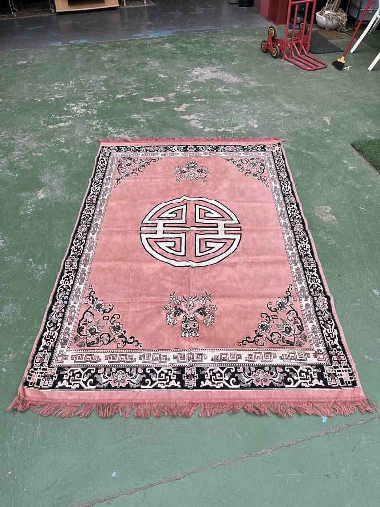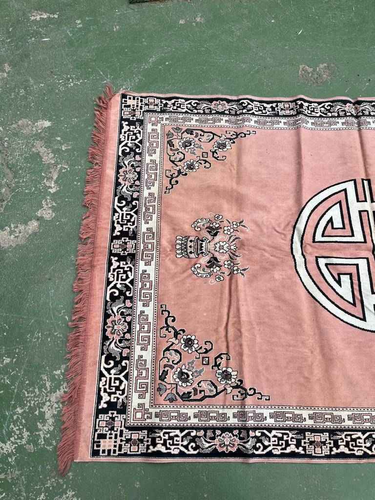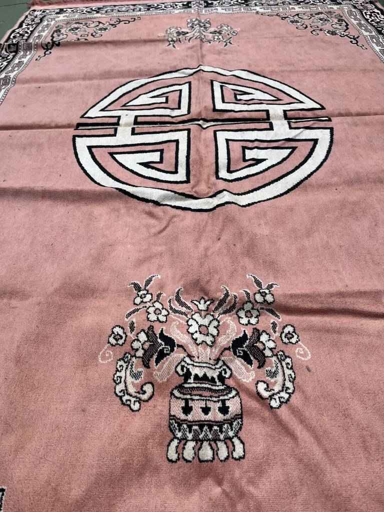 Alfombra de estilo vintage y con forma rectangular. Dispone de unos dibujos muy bonitos y original sobre un fondo de color rosa claro que la hace resaltar. Es una alfombra ideal para un salón comedor de tamaño medio. Como podemos observar en las fotografías se encuentra en buen estado.