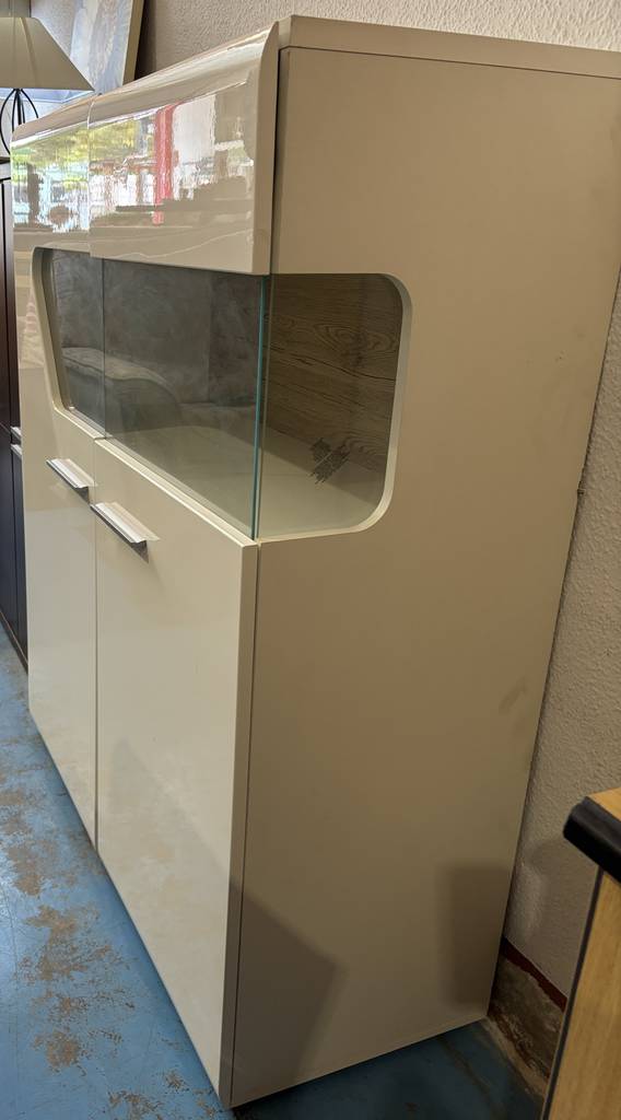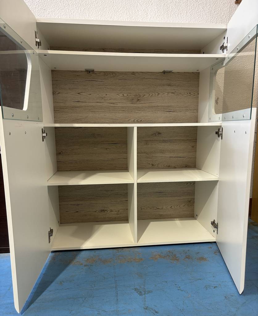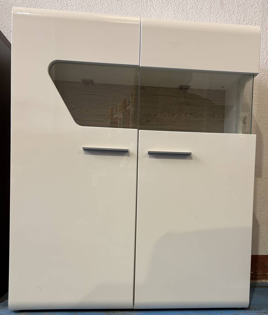 La parte superior cuenta con una vitrina con paneles de cristal, perfecta para exhibir objetos decorativos o colecciones, protegiéndolos del polvo mientras permanecen visibles. En la parte inferior, dispone de dos puertas cerradas que ofrecen un práctico espacio de almacenamiento para mantener el orden en la habitación.