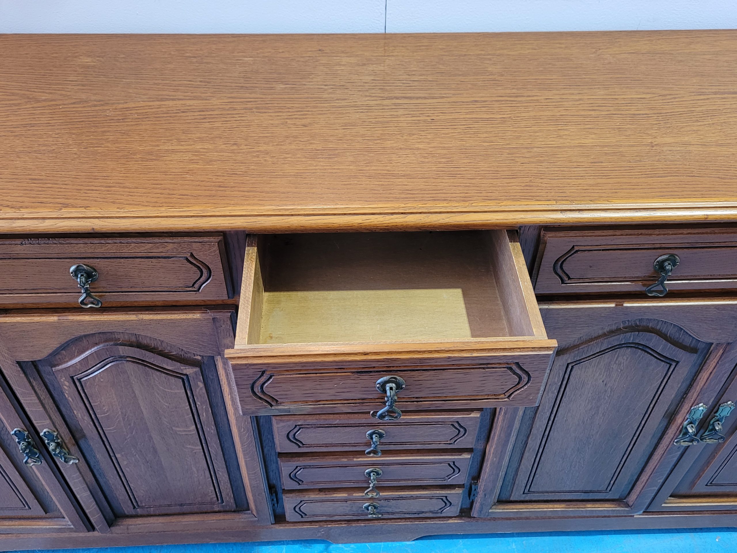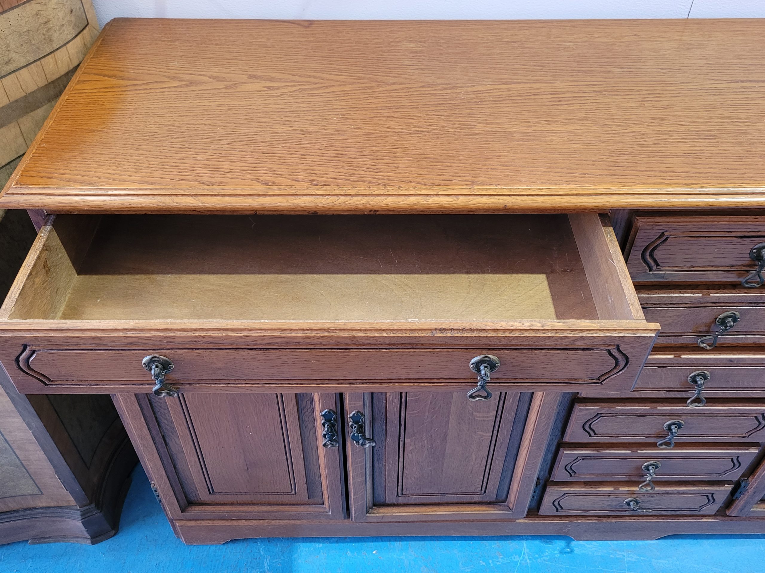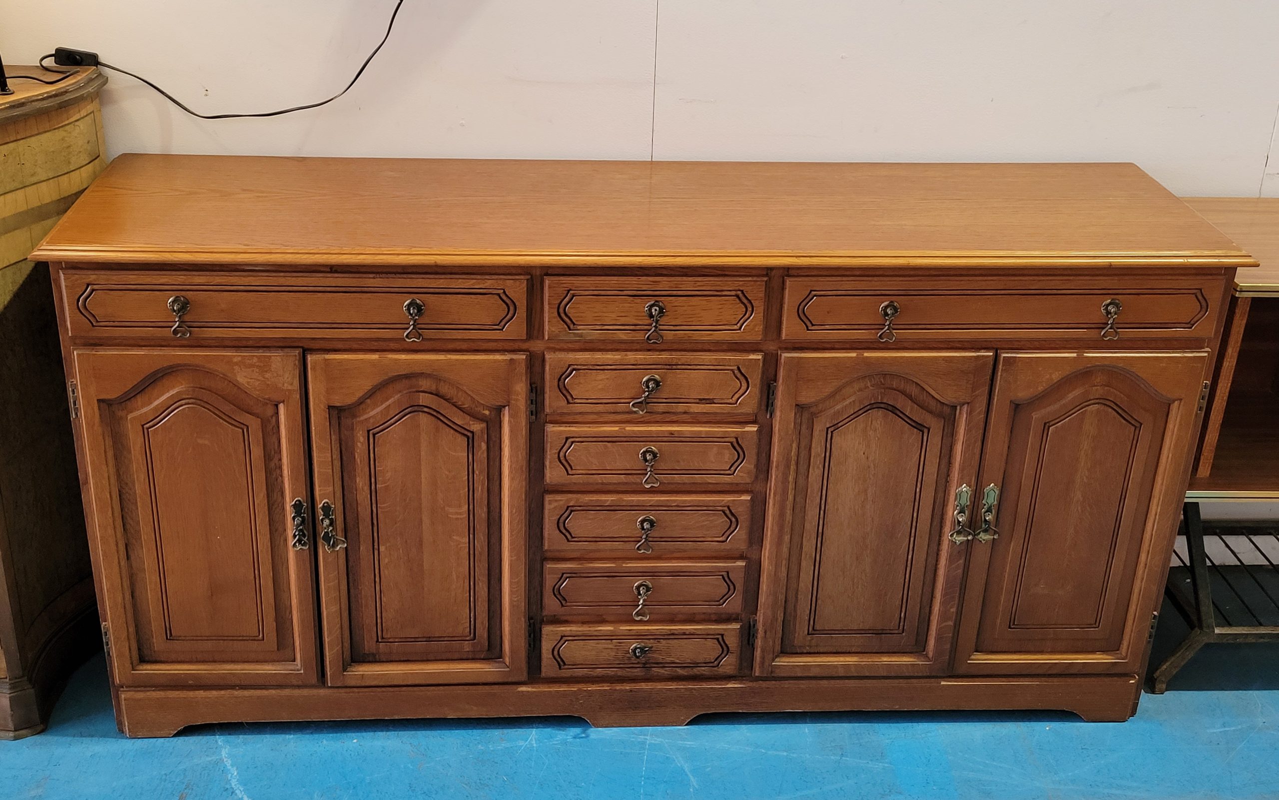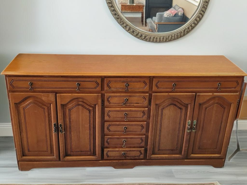 Ref. ✅ O9136 Este es un aparador de estilo provenzal o rústico clásico, valorado por su robustez y el toque cálido que aportan a salones o recibidores. Ofrece una gran capacidad de organización. Cuenta con 3 cajones superiores con tiradores metálicos de estilo antiguo. 4 puertas inferiores con paneles decorativos que ocultan un amplio espacio de almacenamiento. Una columna central de 6 cajones pequeños, ideal para cubertería o documentos.Se aprecia en buen estado general, conservando su brillo y estructura sólida.