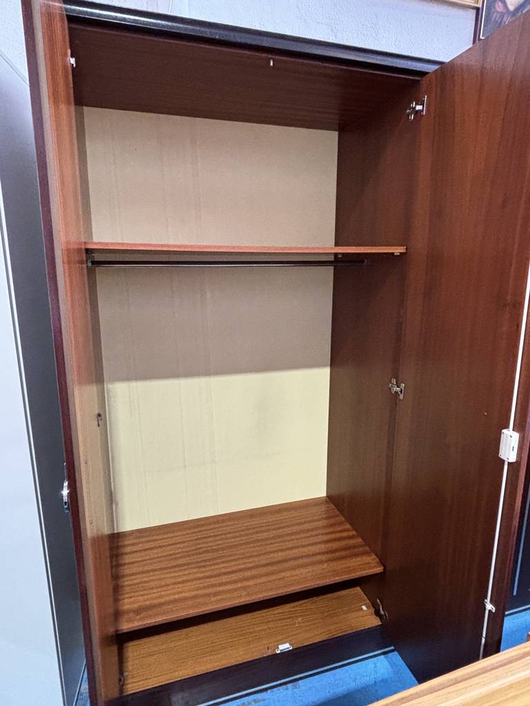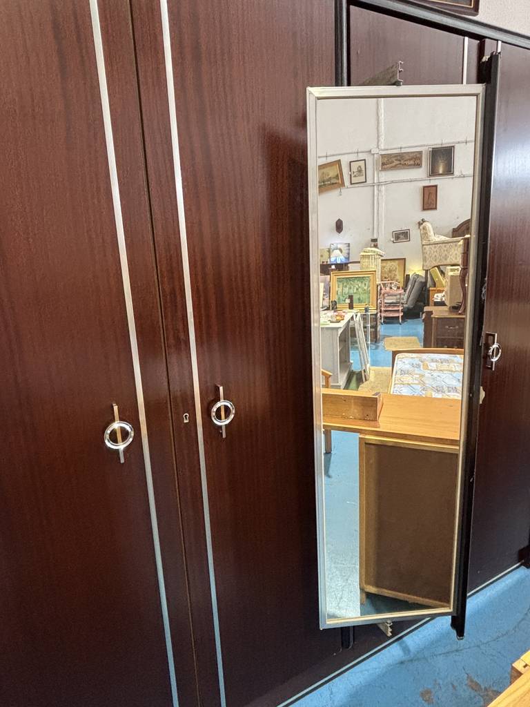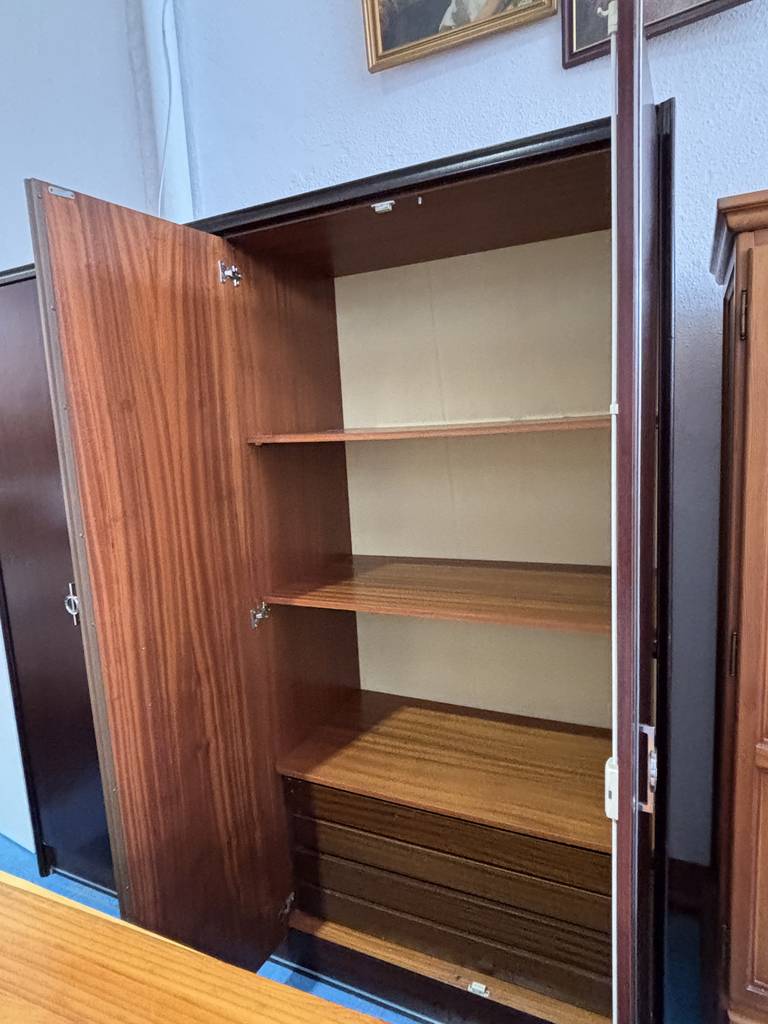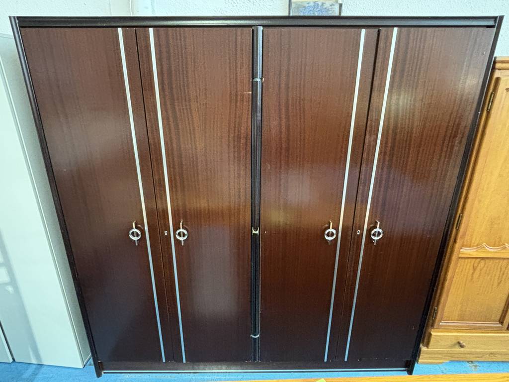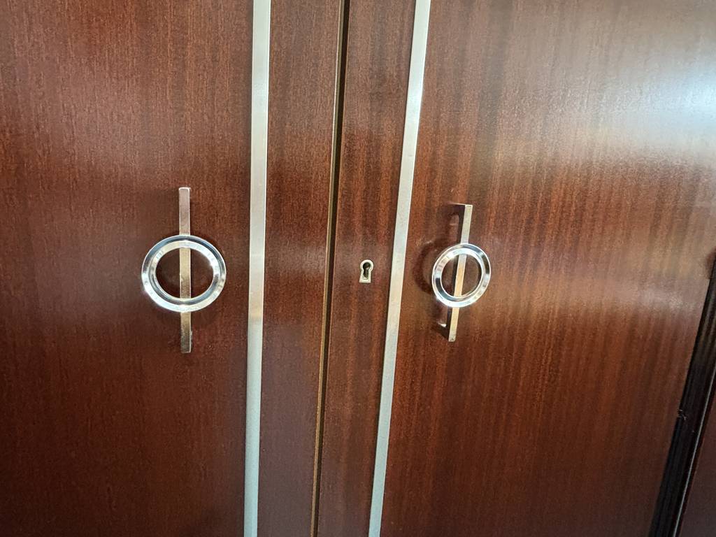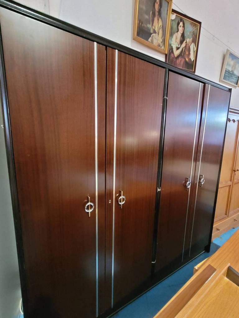 Ref. ✅ O8803 Este es un armario ropero de gran tamaño, con un diseño distintivo que sugiere el estilo Art Déco o vintage. Presenta un diseño de líneas rectas y limpias, típico de la época Art Déco, que valora la simplicidad geométrica. Consta de cuatro puertas batientes. Los tiradores y las molduras verticales son de metal pulido, lo que aporta un toque de brillo moderno y complementa el tono oscuro de la madera. Los pomos tienen un estilo circular elegante. Se encuentra en buen estado, listo para darle una segunda oportunidad.