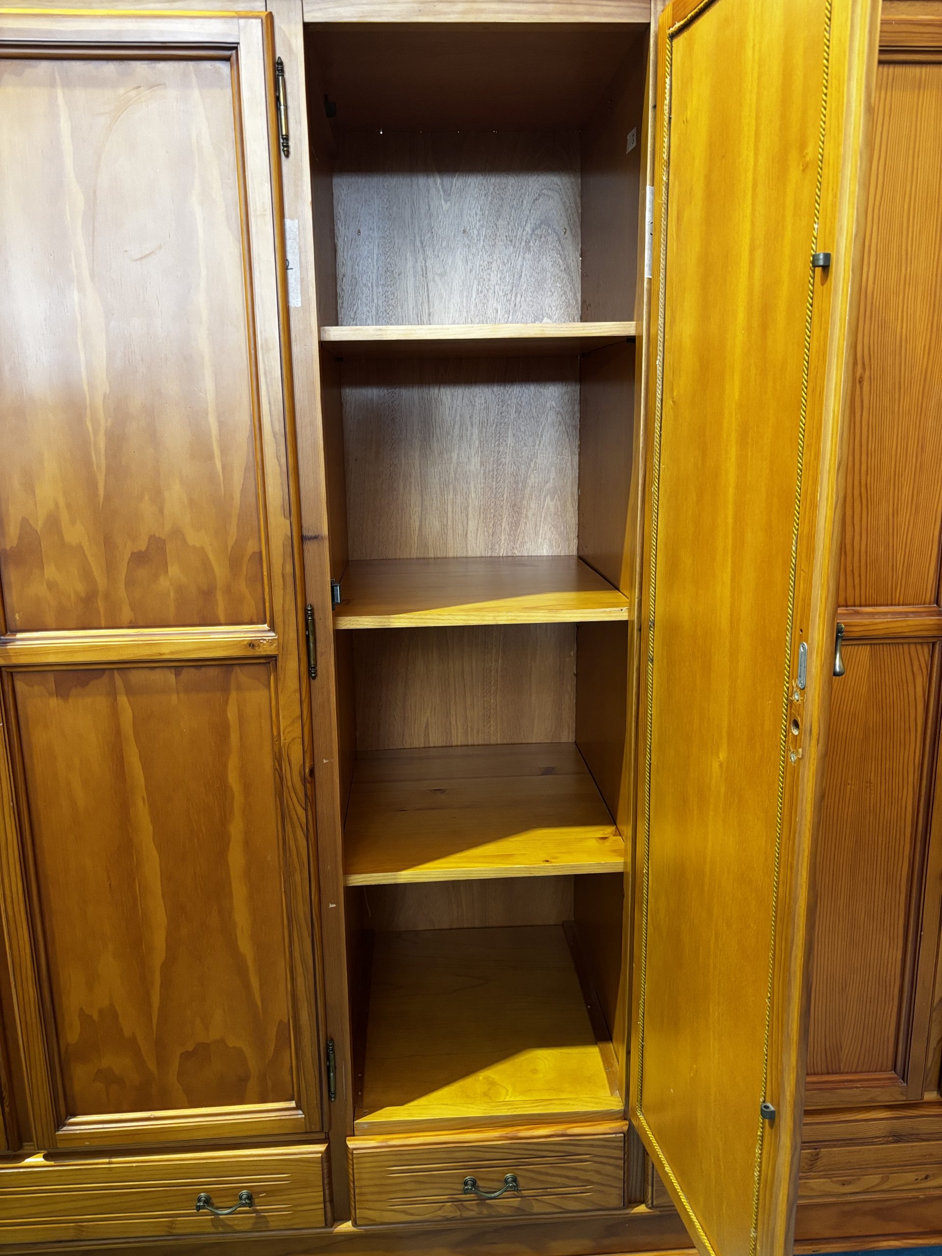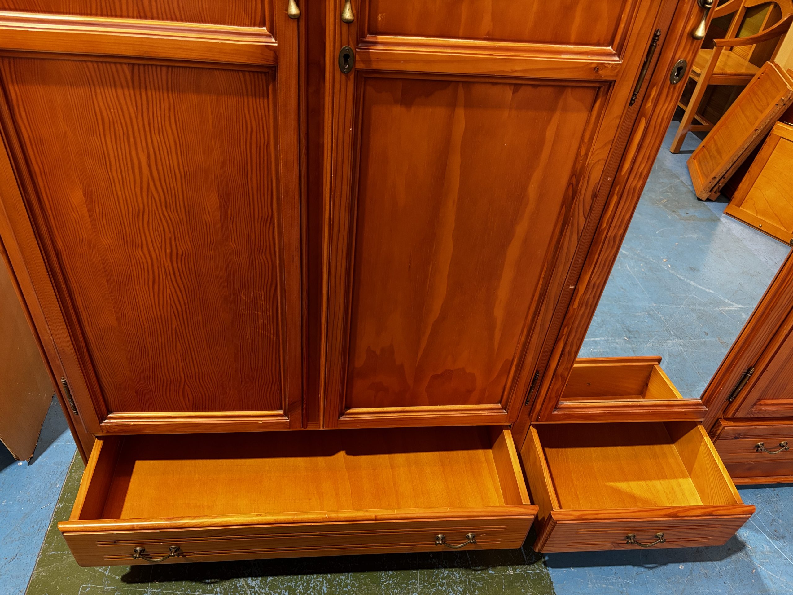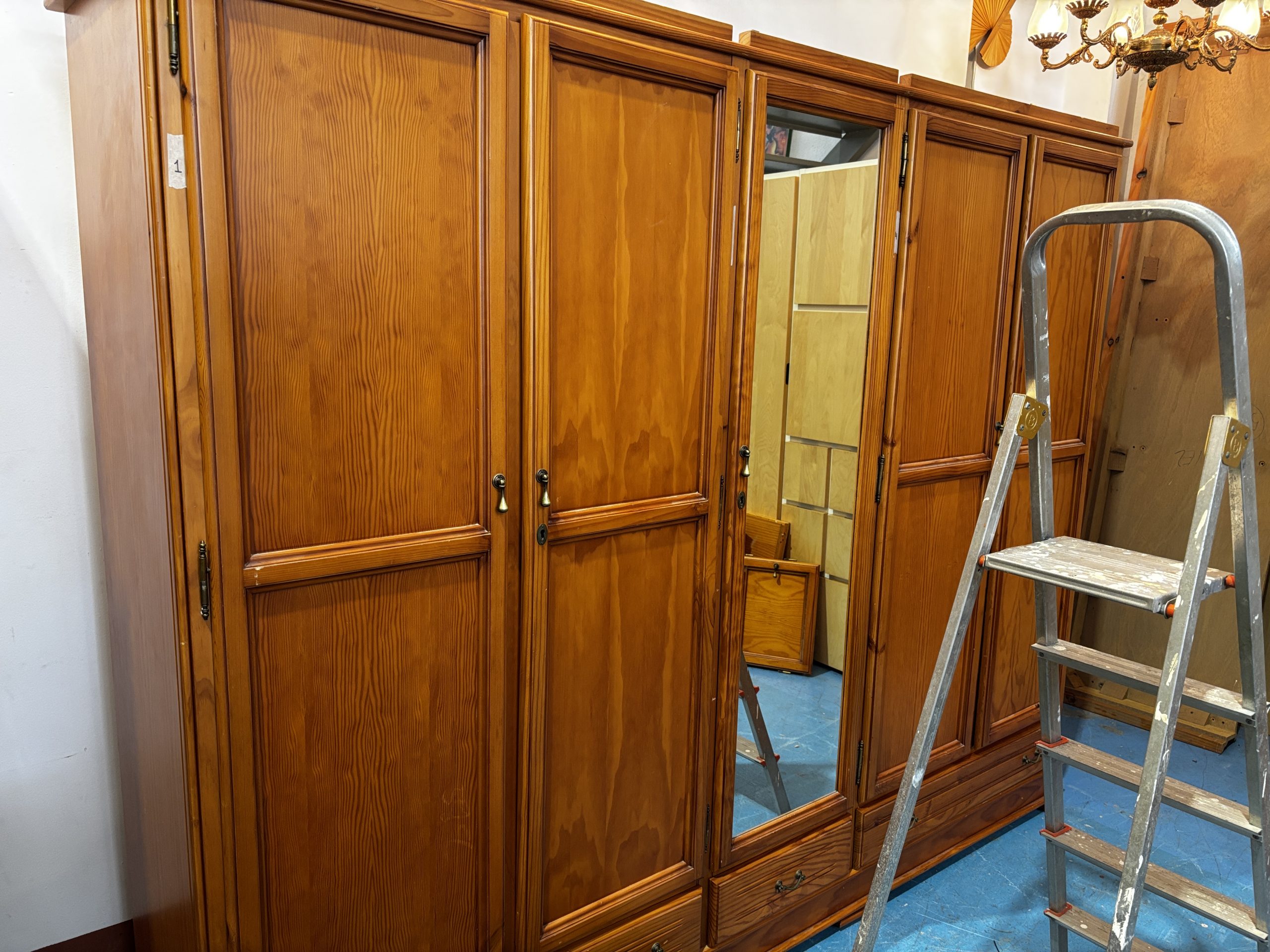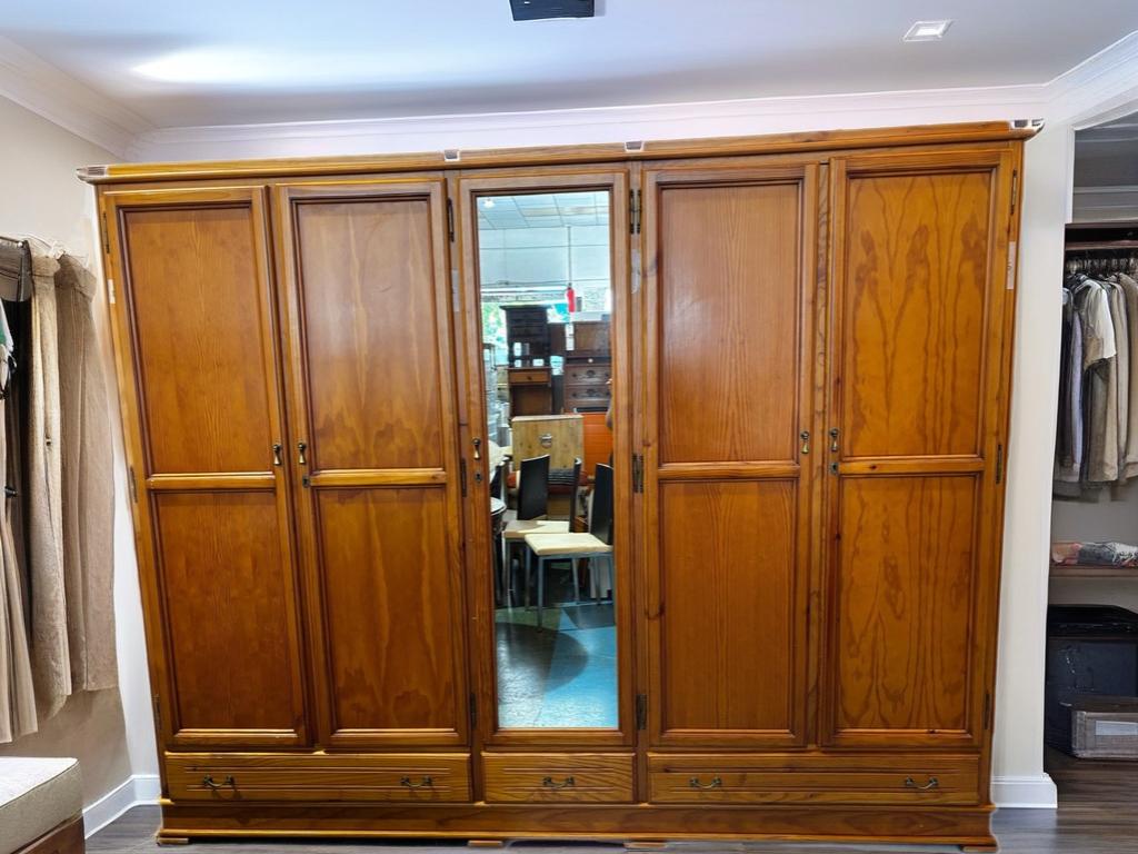 Ref. ✅ O8826 Armario ropero de madera maciza con un diseño clásico. Fabricado en madera maciza, lo que le otorga gran durabilidad y resistencia. Presenta un estilo clásico con un acabado en tono marrón cálido o color natural. Cuenta con un total de seis puertas batientes: cuatro puertas de madera y dos puertas centrales con espejo integrado. En la parte inferior, dispone de varios cajones para almacenamiento adicional. Incluye tiradores metálicos, posiblemente dorados, y detalles de molduras en los paneles de las puertas.