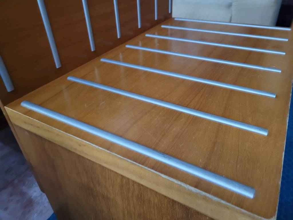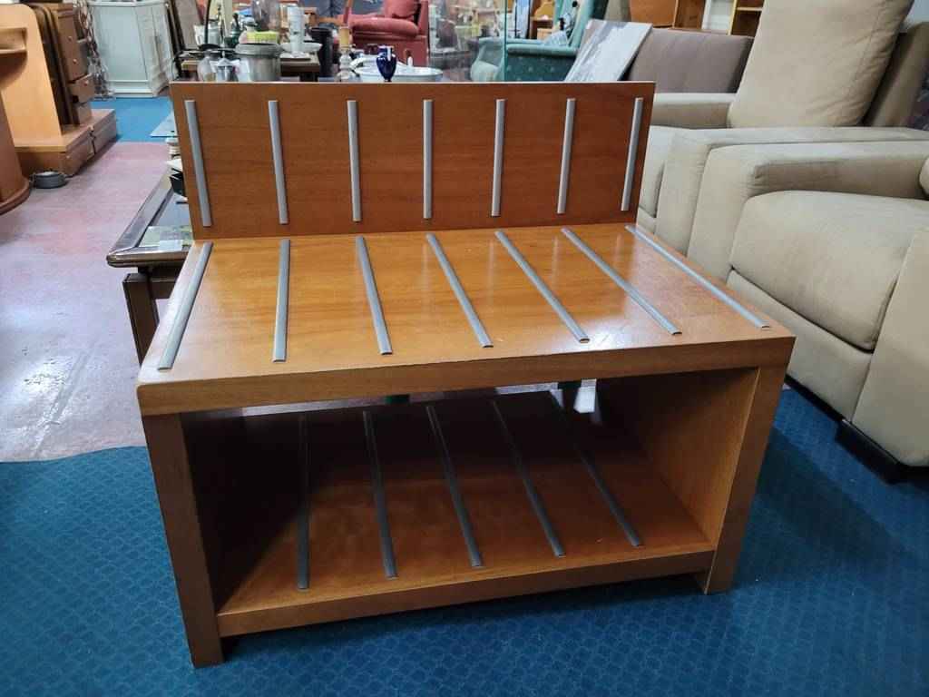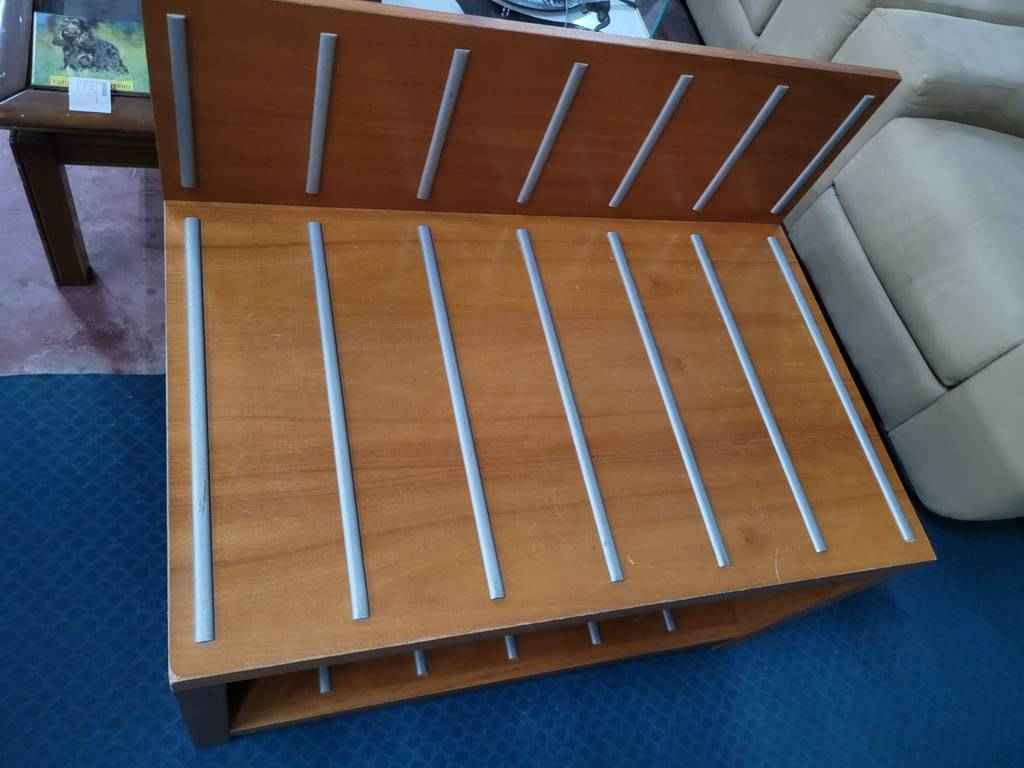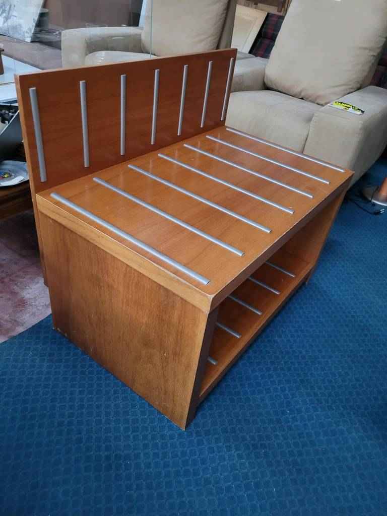 Banco multifuncional que puede servir como descalzador así como de porta maletas. Este banco ha sido realizado con madera de buena calidad y robusta. Dispone de finos listones metálicos y en la parte inferior de un gran habitáculo para guardar zapatos o maletas. Como podemos observar en las fotografías se encuentra con algunos rasguños.