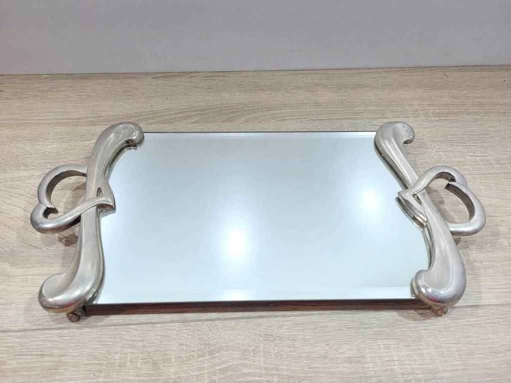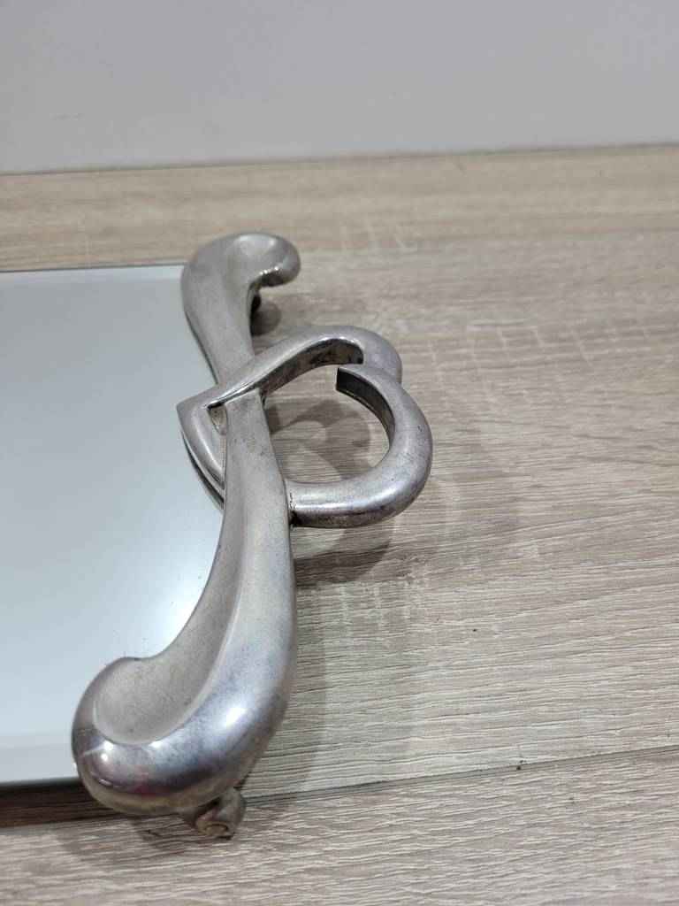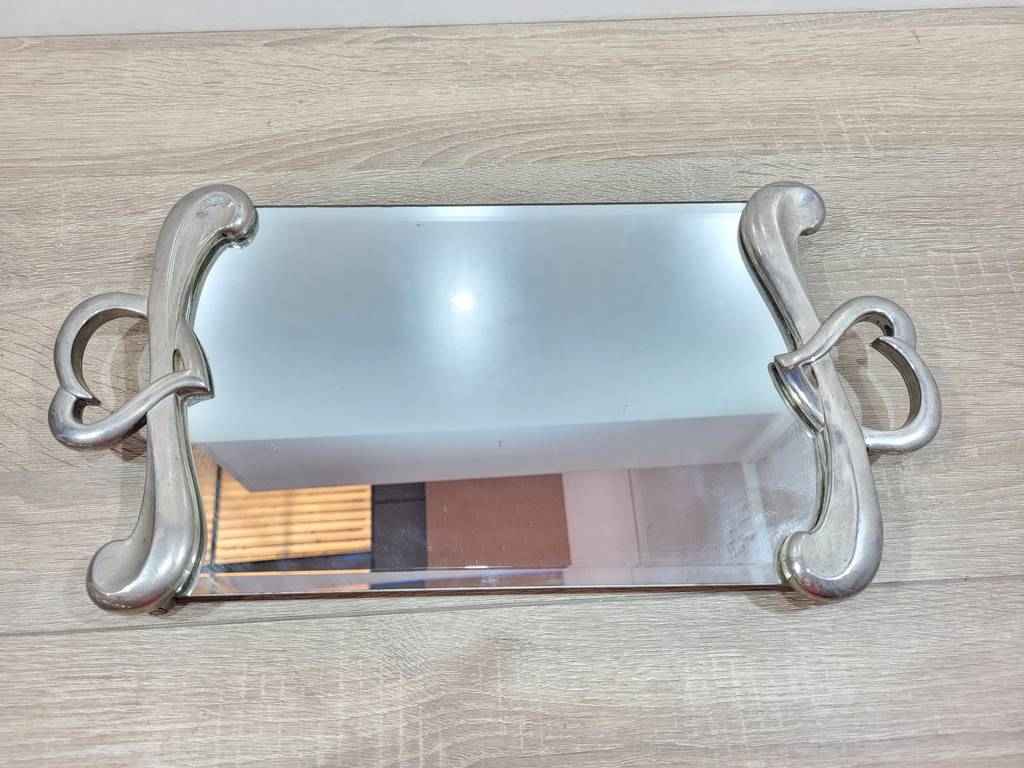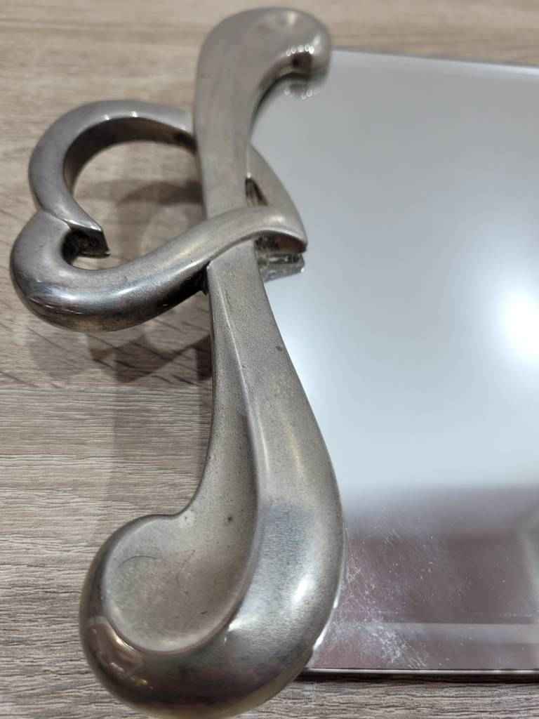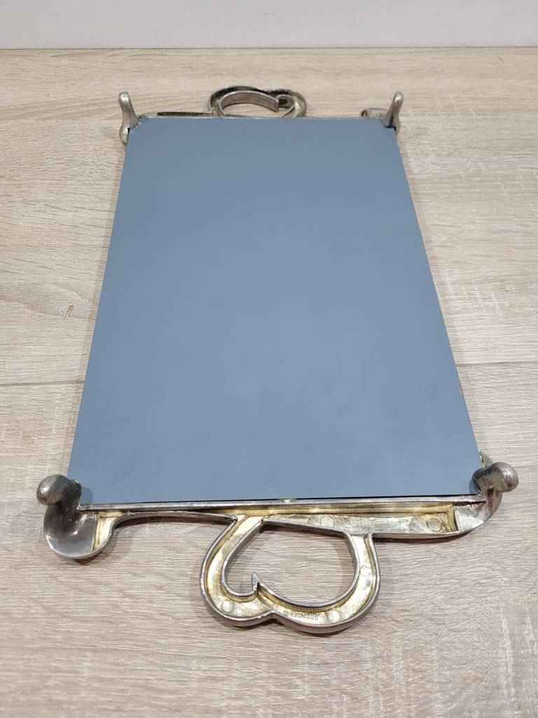 Bandeja para servir muy bonita y original con una parte central a modo de espejo ideal para transportar alimentos o bebidas. En los laterales tiene dos asas muy originales con forma de corazón que se unen a la parte central con una forma muy original. Es un objeto ideal para utilizar en fiestas o eventos. Como podemos observar en las fotografías se encuentra en buenas condiciones.