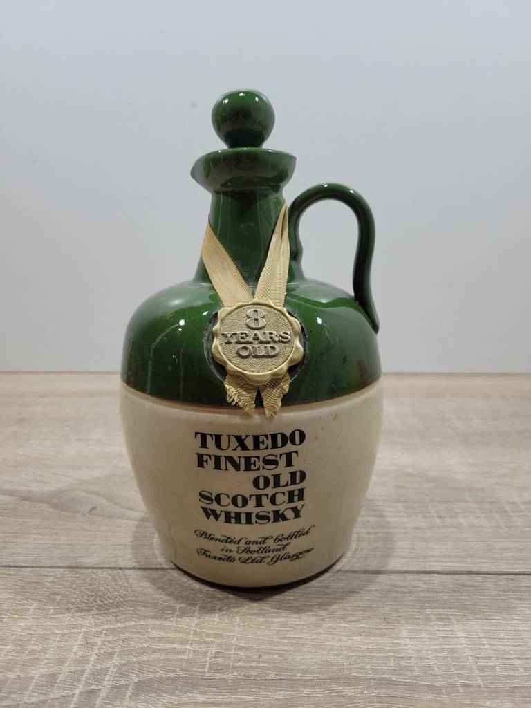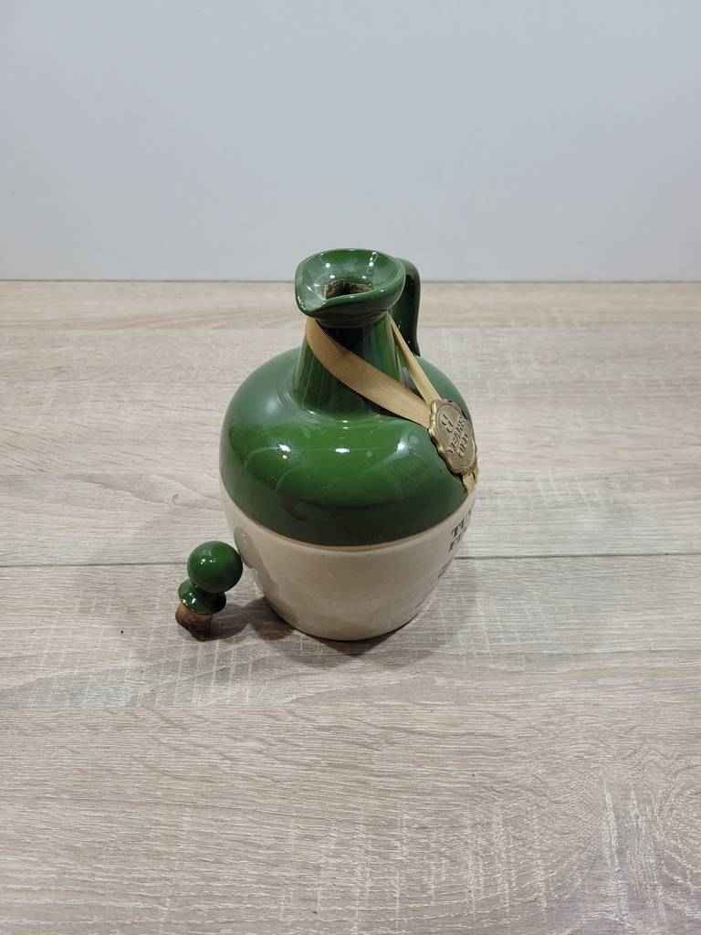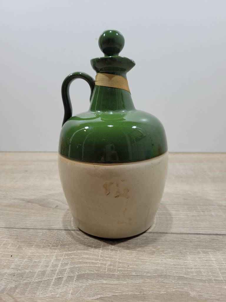 Botella de whisky de estilo clásico que dispone de un asa para agarrarla con facilidad y un tapón en la parte superior para facilitar su llenado. Se trata de una botella de color verde y blanco ideal para coleccionistas de este tipo de objetos o para colocarla encima de una estantería y decorar un salón comedor. Como se puede observar en las imágenes está en buenas condiciones.