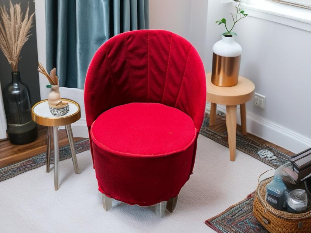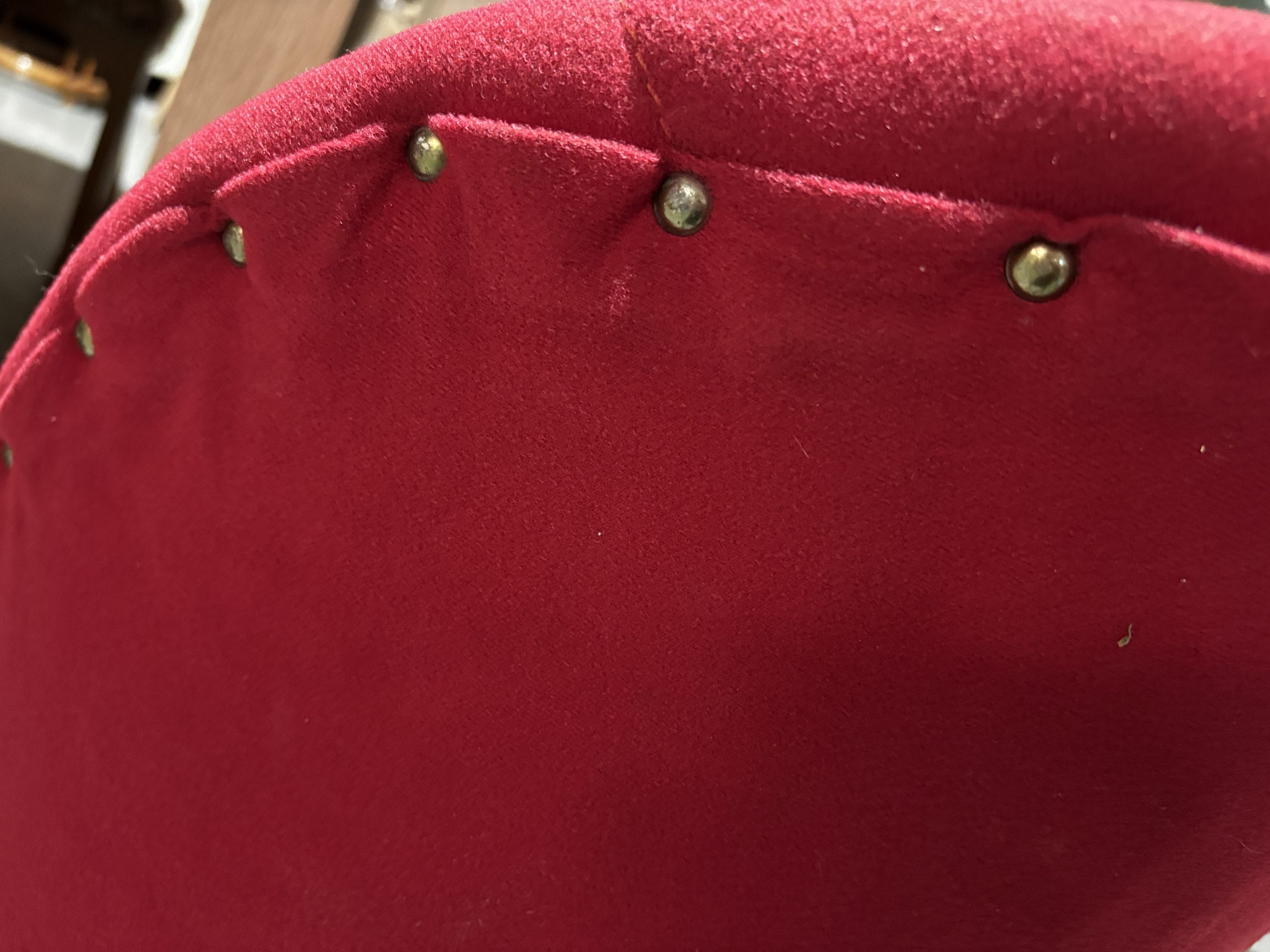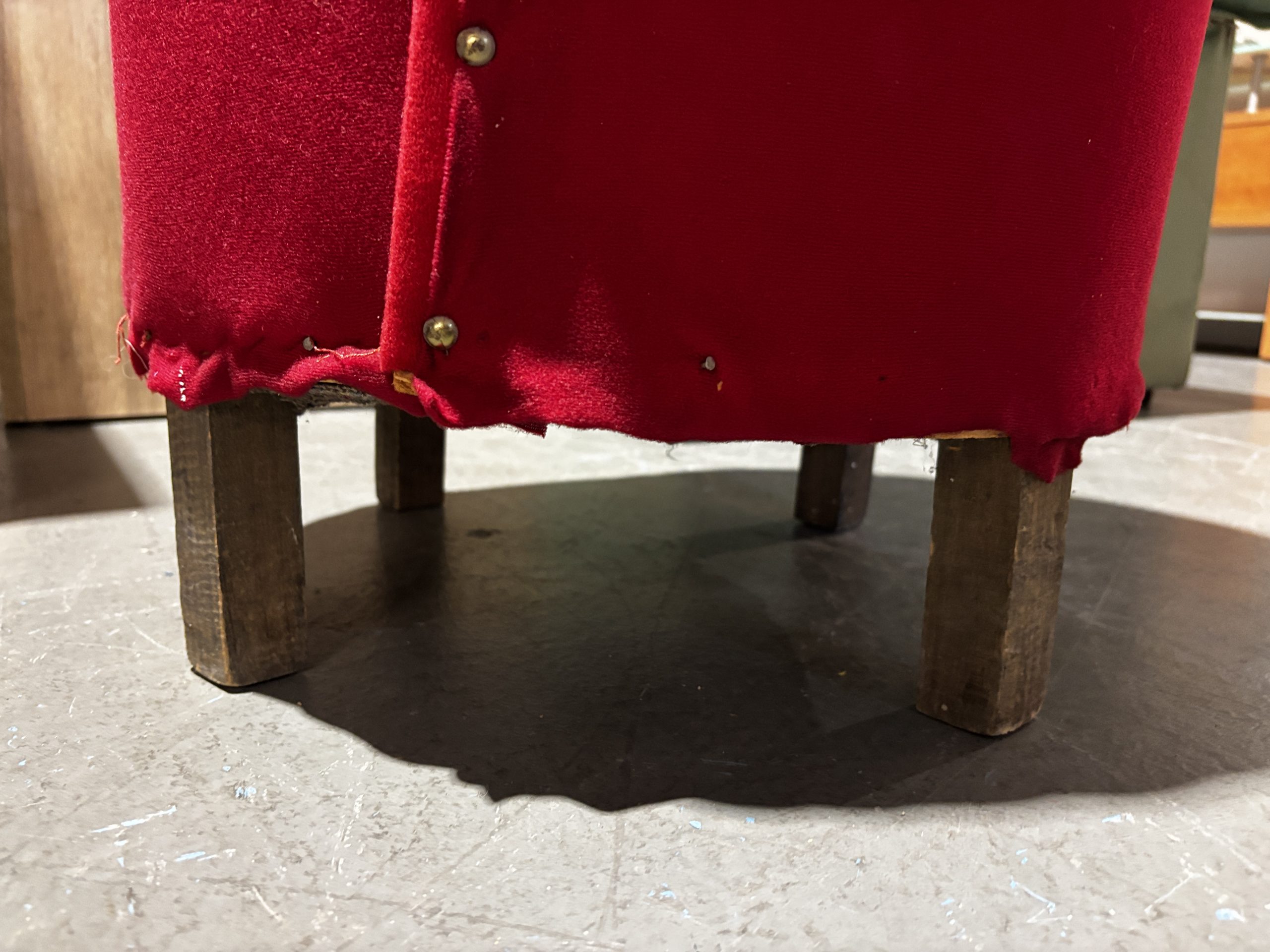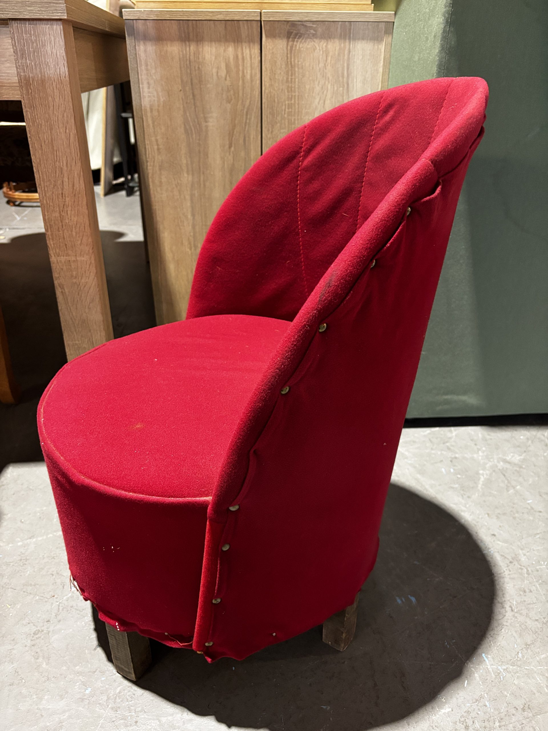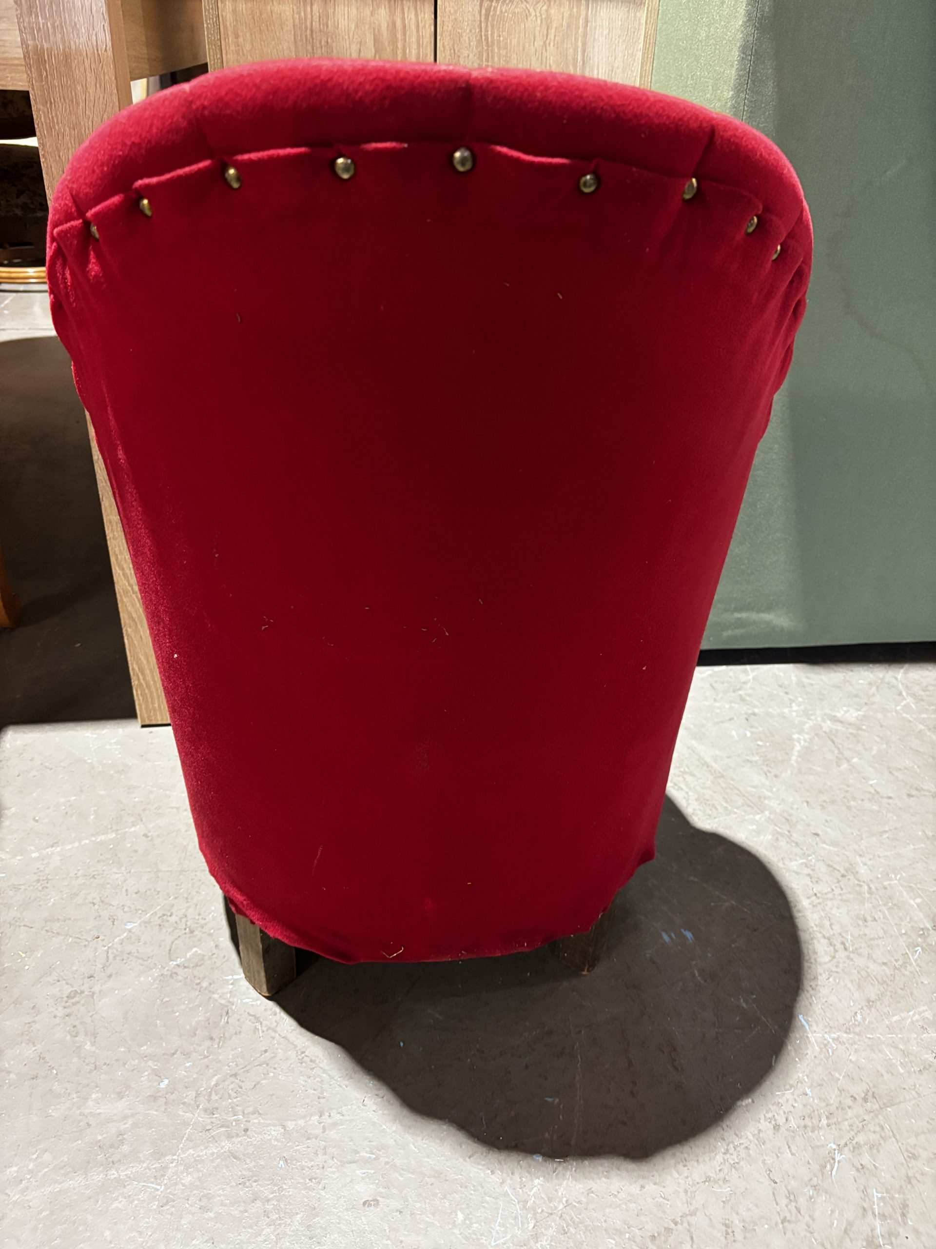 Ref. ✅ O8819 Se trata de un sillón o butaca auxiliar tapizado en terciopelo rojo. Su diseño combina un asiento redondo y profundo con un respaldo curvado y acolchado, a menudo descrito con un estilo moderno o retro bohemio. El tapizado es de terciopelo suave al tacto, lo que le confiere una apariencia lujosa y cómoda.  Presenta una forma de barril o concha, con líneas suaves y continuas que facilitan su integración en diversos espacios del hogar o la oficina. Listo para darle una segunda oportunidad.