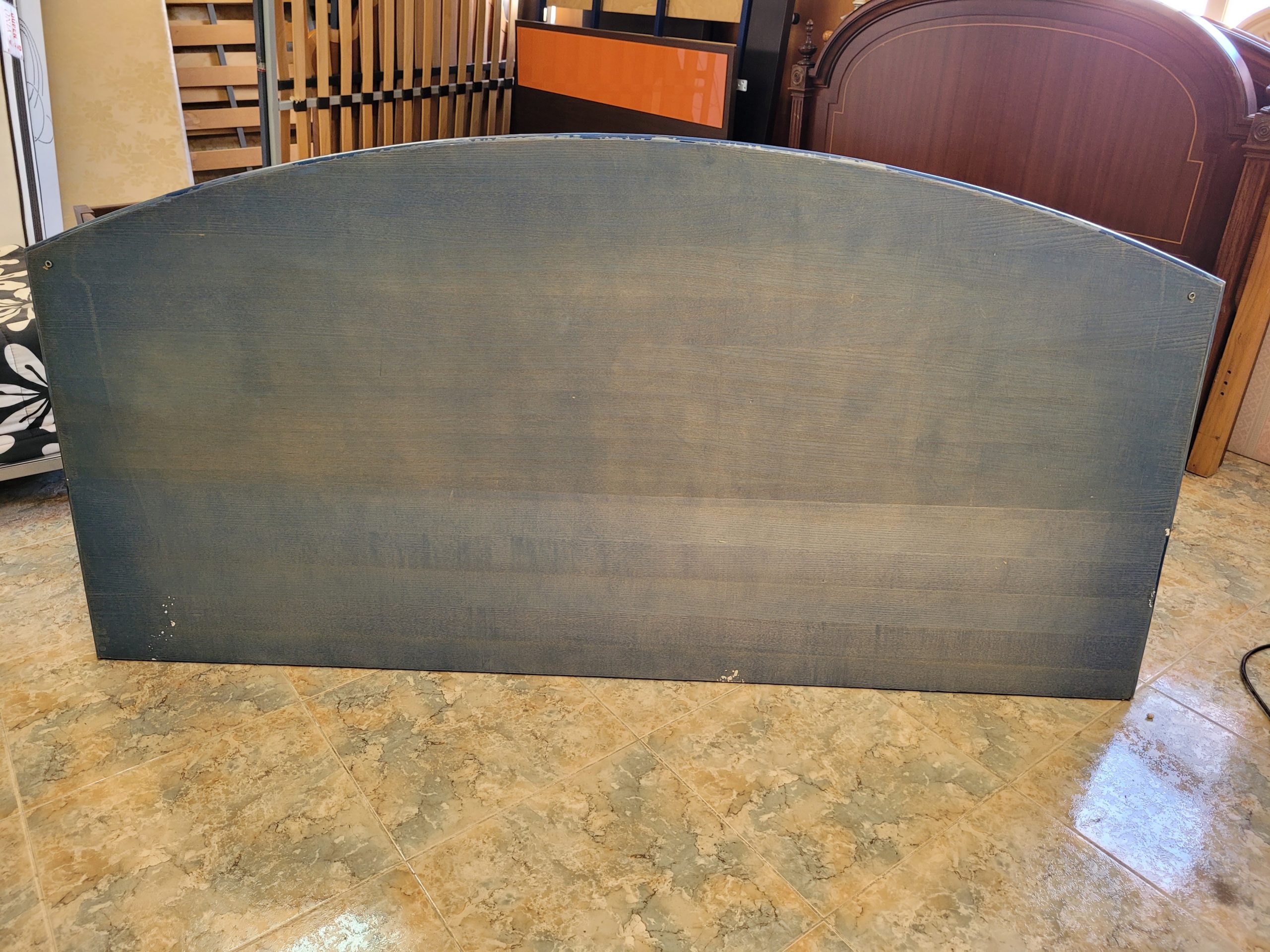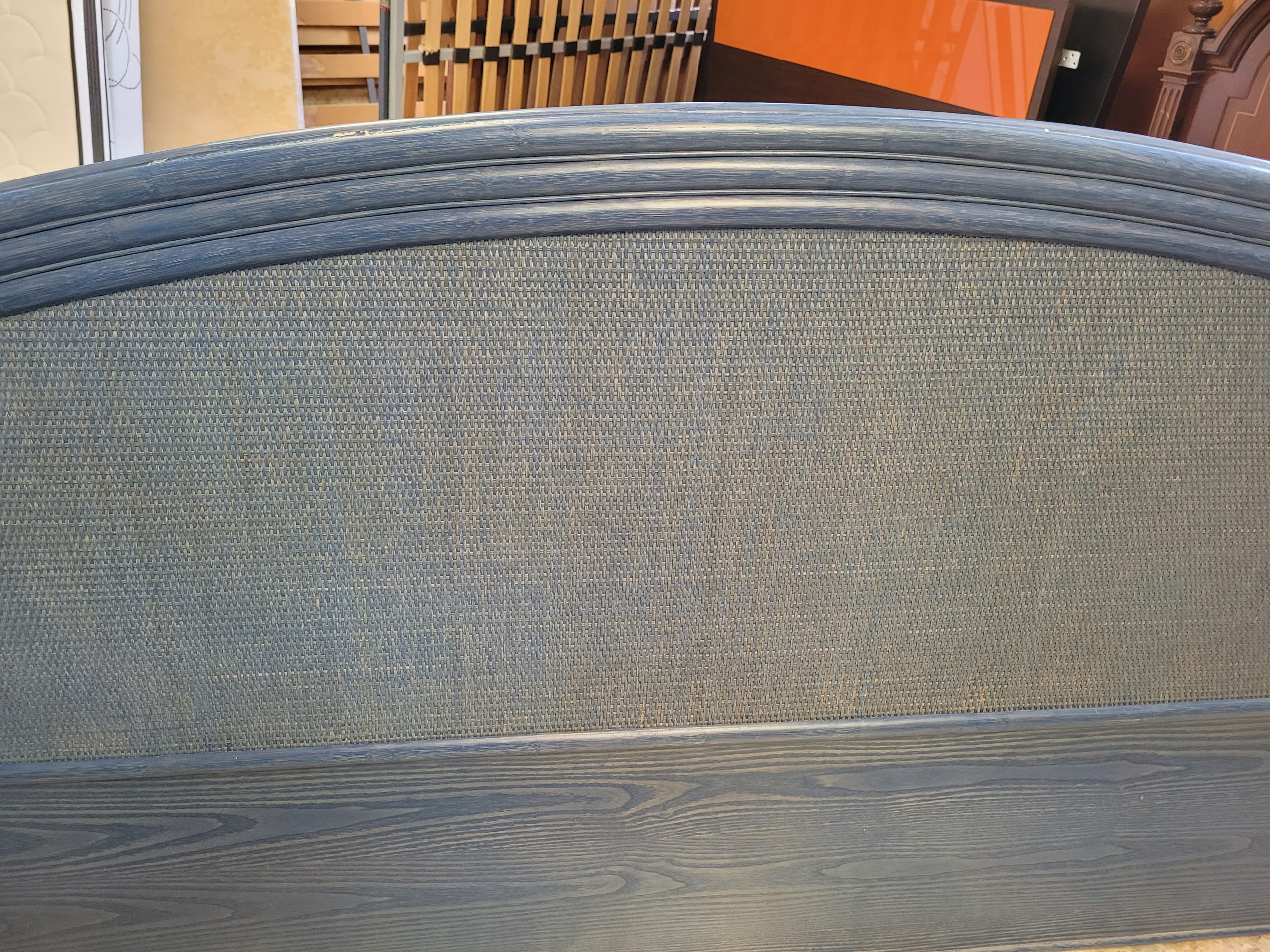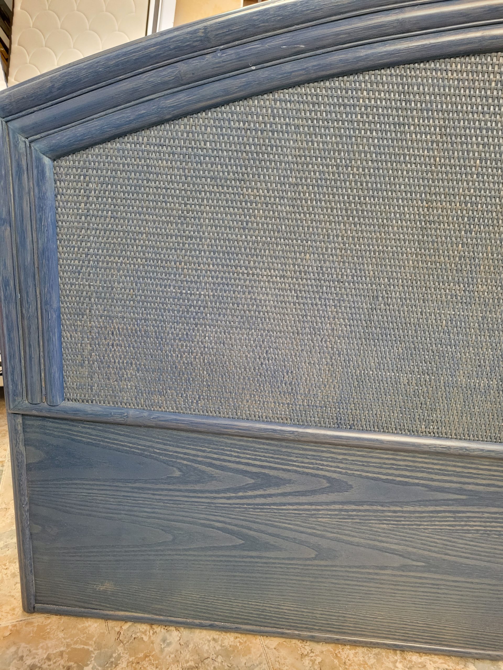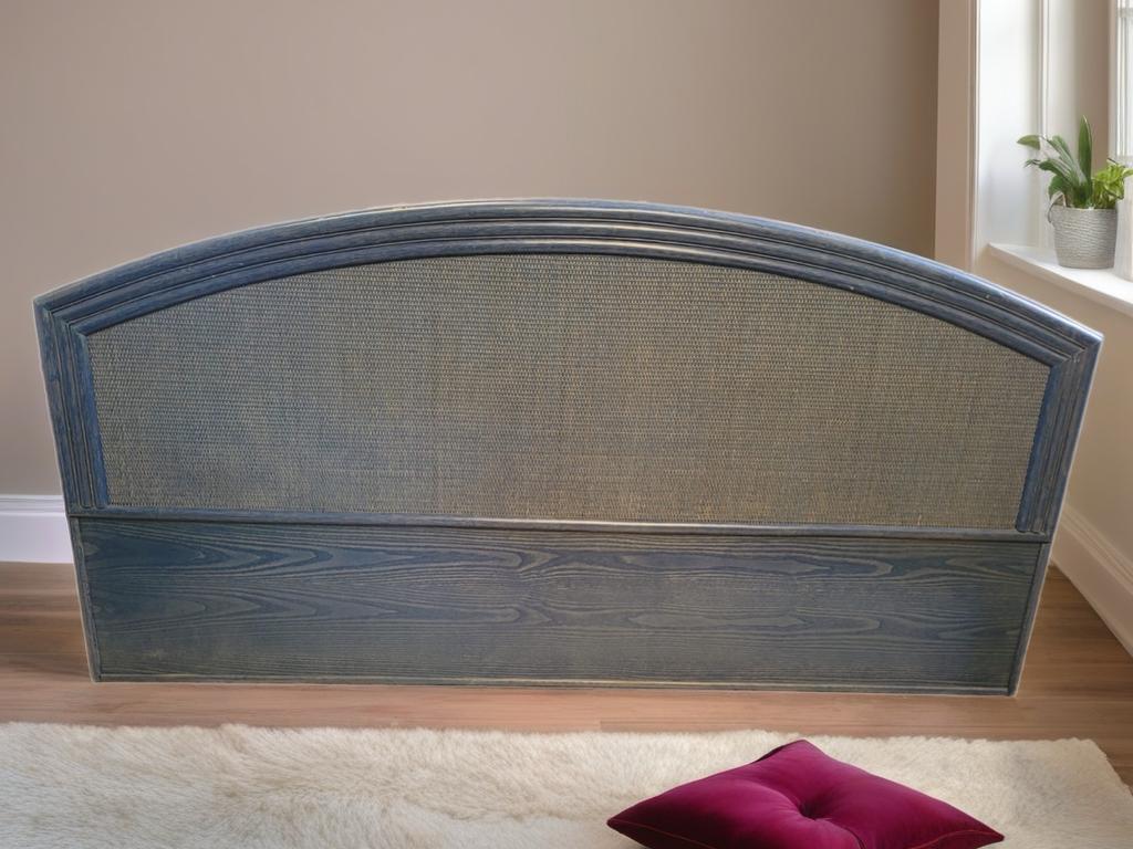 Ref. ✅ O9386 Precioso cabecero para cama de matrimonio con un diseño semicircular único. Fabricado en madera de alta calidad con un elegante panel central de mimbre tejido, ideal para crear un ambiente acogedor y con personalidad. Destaca su diseño curvo elegante y su combinación de materiales naturales que aportan un toque rústico y sofisticado a cualquier dormitorio. Su color azul oscuro con acabado decapado que deja ver la veta natural, de estilo mediterráneo. Muy bien conservado, listo para dar un cambio de estilo a tu habitación y una segunda oportunidad.
