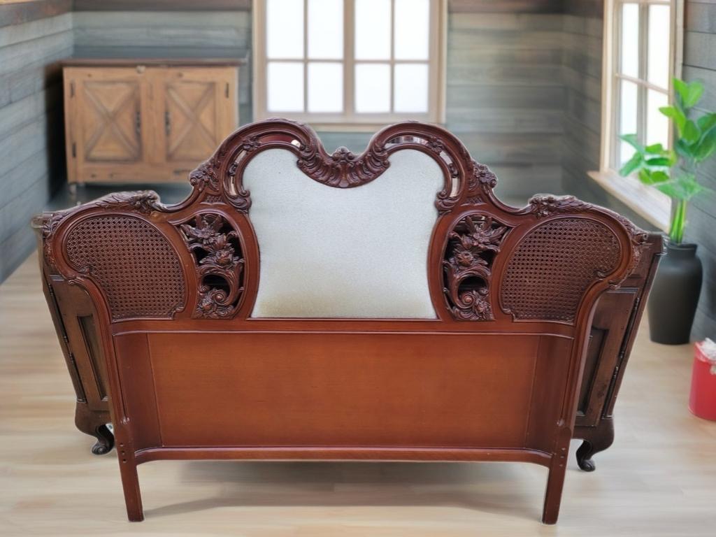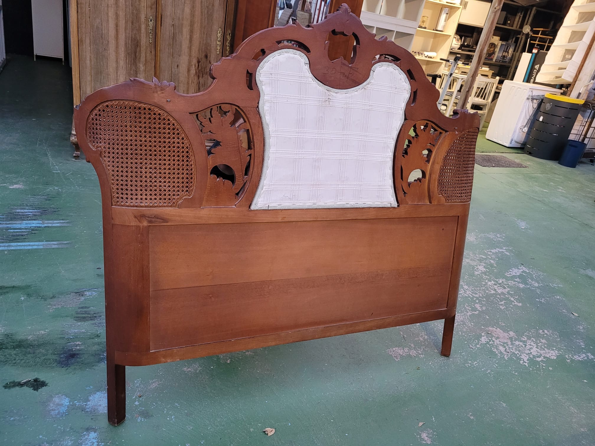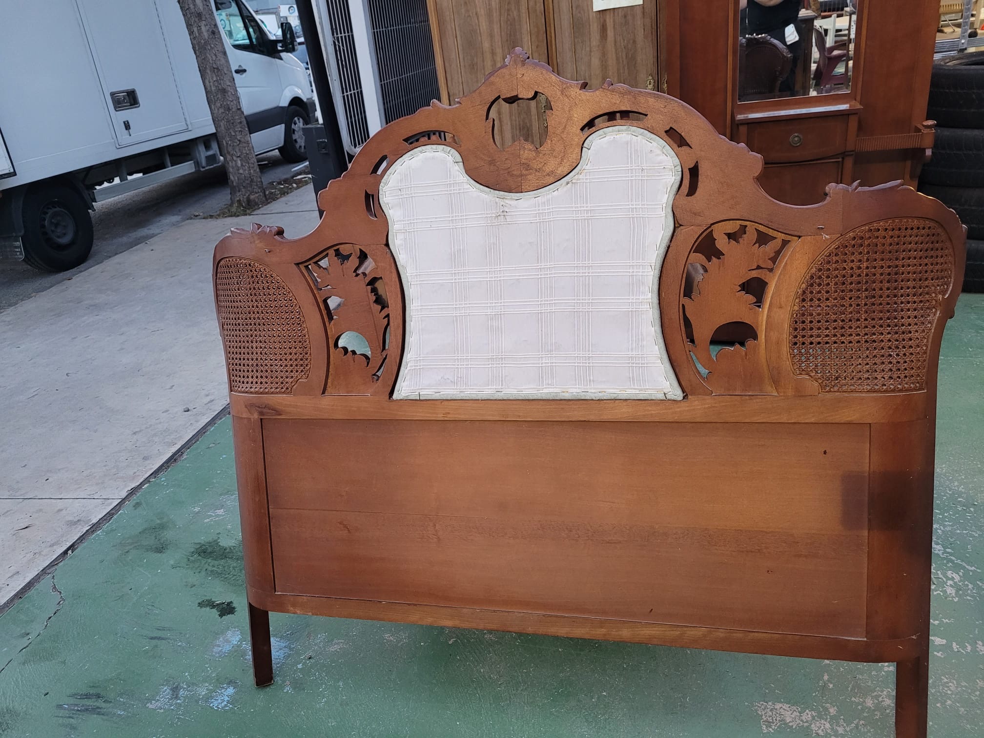 Ref. ✅ O8834 Este es un cabecero de cama antiguo de madera tallada y rejilla, probablemente de estilo Luis XV. Se caracteriza por un diseño clásico y ornamentado, con curvas elegantes y detalles florales tallados a mano en la madera. Los paneles laterales son de caña o mimbre tejido (rejilla), lo que le añade un toque vintage y artesanal. Fabricado en madera maciza. Se caracteriza por su tallado artesanal con motivos florales y curvos, rejilla de caña natural en buen estado en los paneles laterales, y un panel central tapizado en un tono claro.