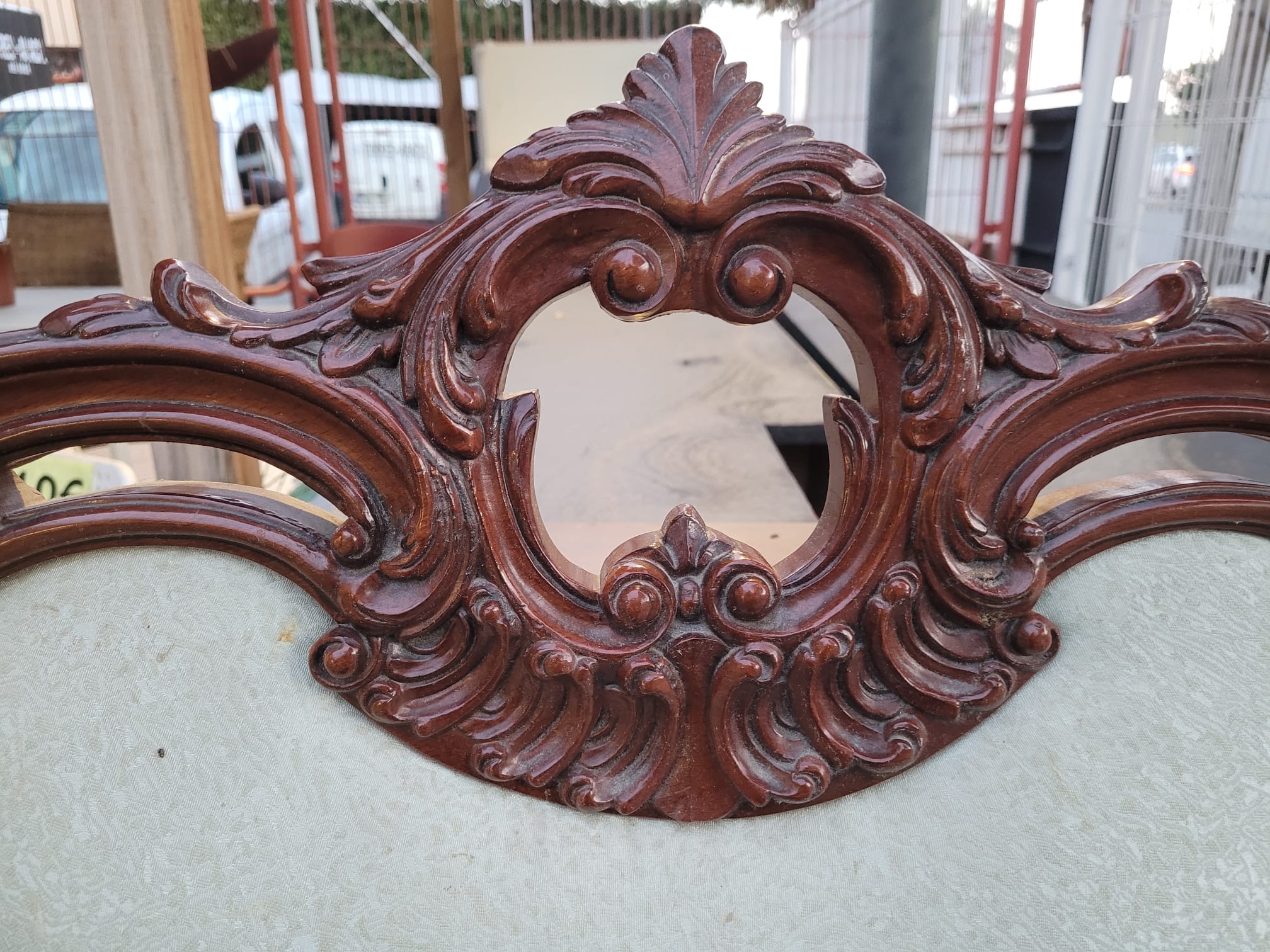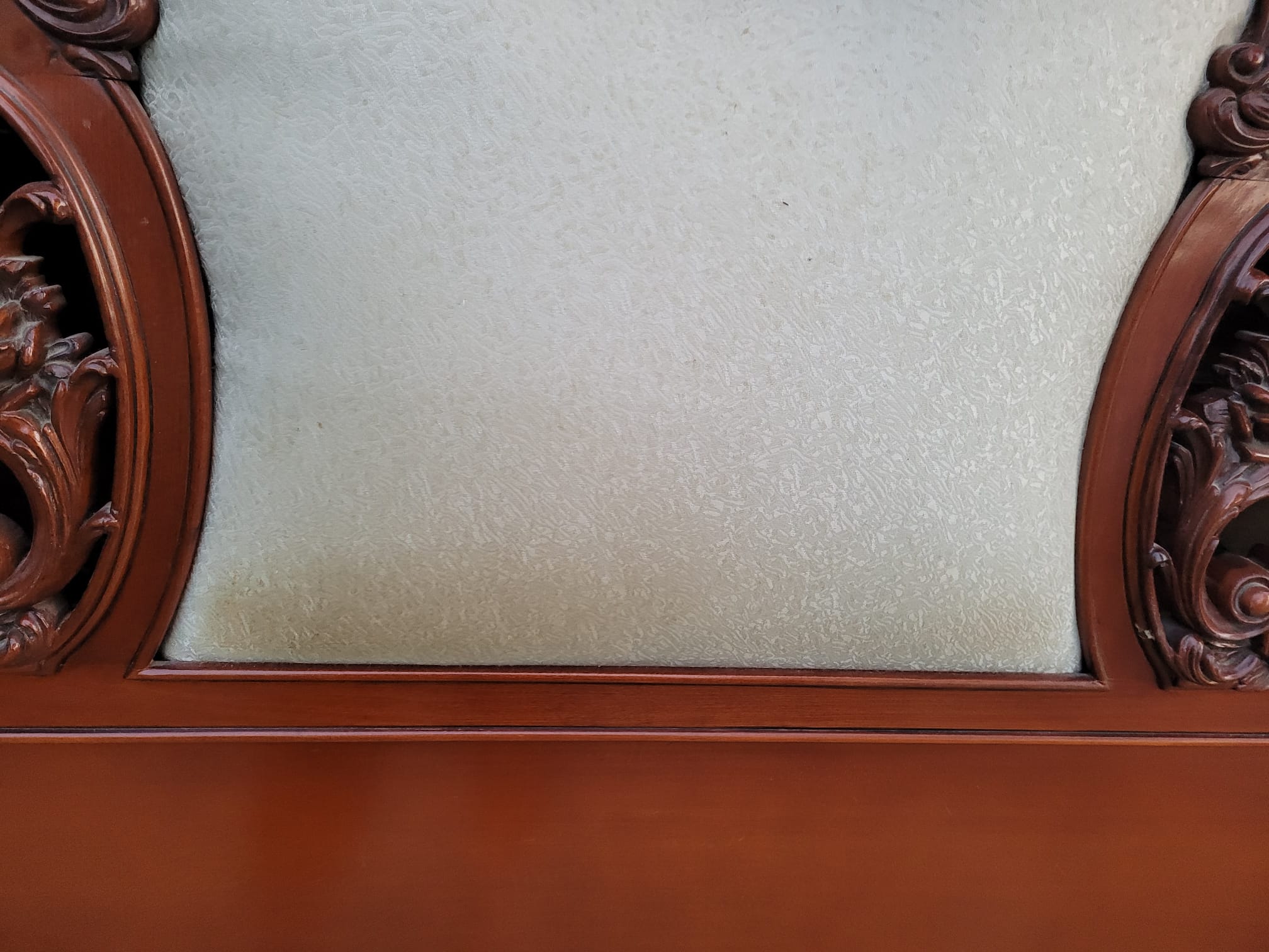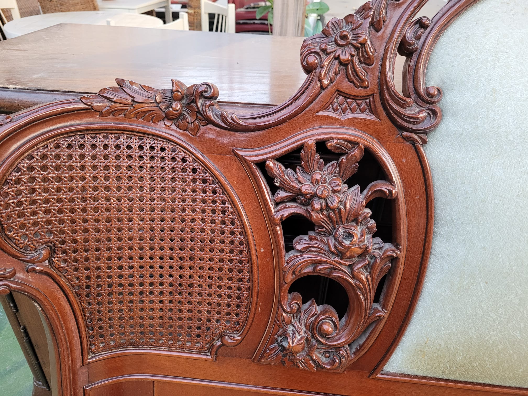 Ref. ✅ O8834 Este es un cabecero de cama antiguo de madera tallada y rejilla, probablemente de estilo Luis XV. Se caracteriza por un diseño clásico y ornamentado, con curvas elegantes y detalles florales tallados a mano en la madera. Los paneles laterales son de caña o mimbre tejido (rejilla), lo que le añade un toque vintage y artesanal. Fabricado en madera maciza. Se caracteriza por su tallado artesanal con motivos florales y curvos, rejilla de caña natural en buen estado en los paneles laterales, y un panel central tapizado en un tono claro.