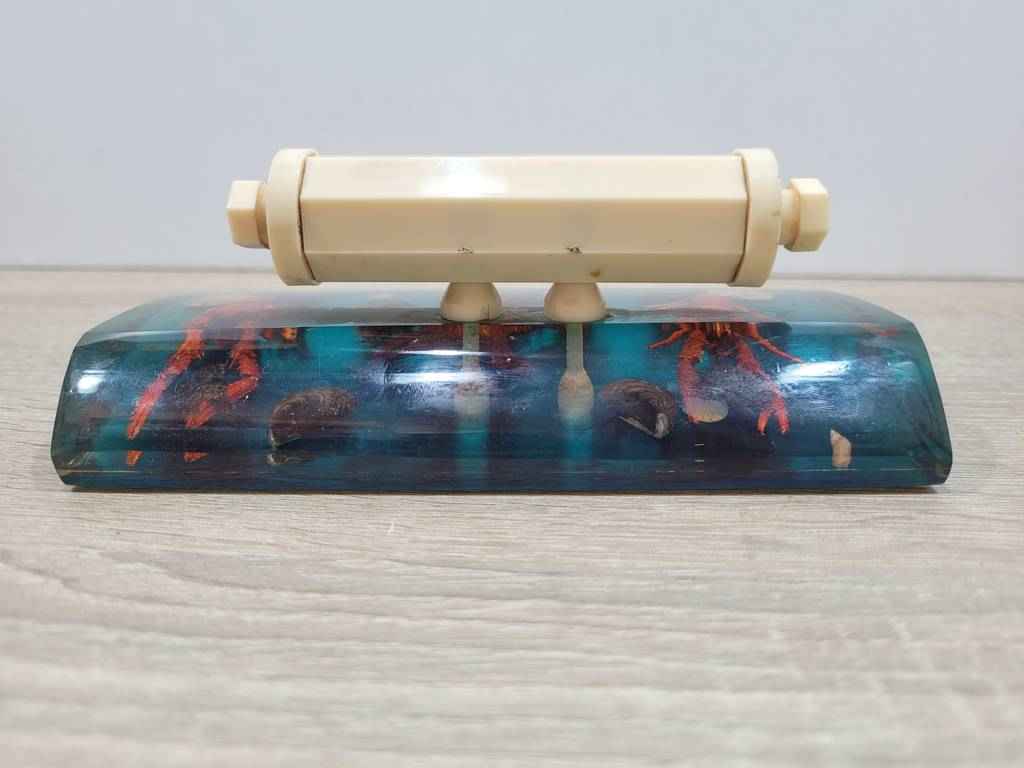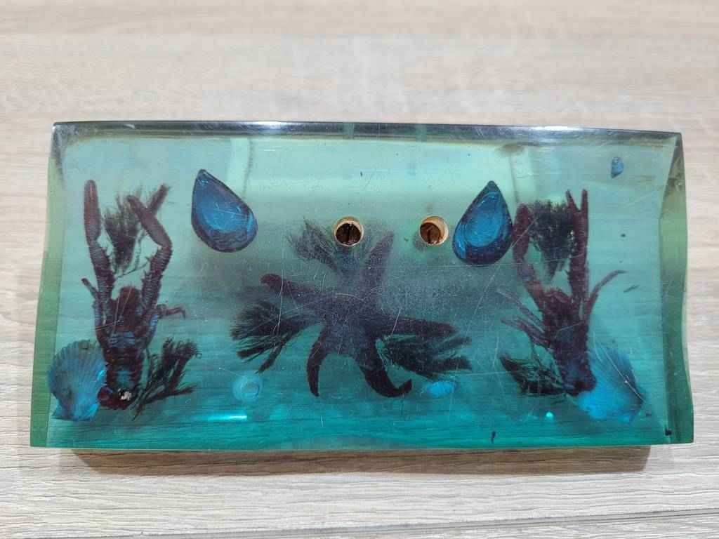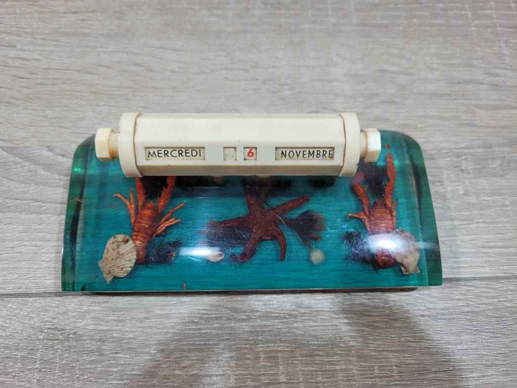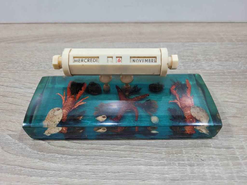 Calendario fabricado en resina que lleva en su interior elementos relacionados con el mundo marino, como una estrella de mar, conchas, un par de langostas y algunas algas. Se trata de un objeto muy práctico para disponer de él en el estudio de un hogar. Como se puede observar en las fotografías se encuentra en buen estado y funciona correctamente por lo que puede ser utilizado en cualquier momento.