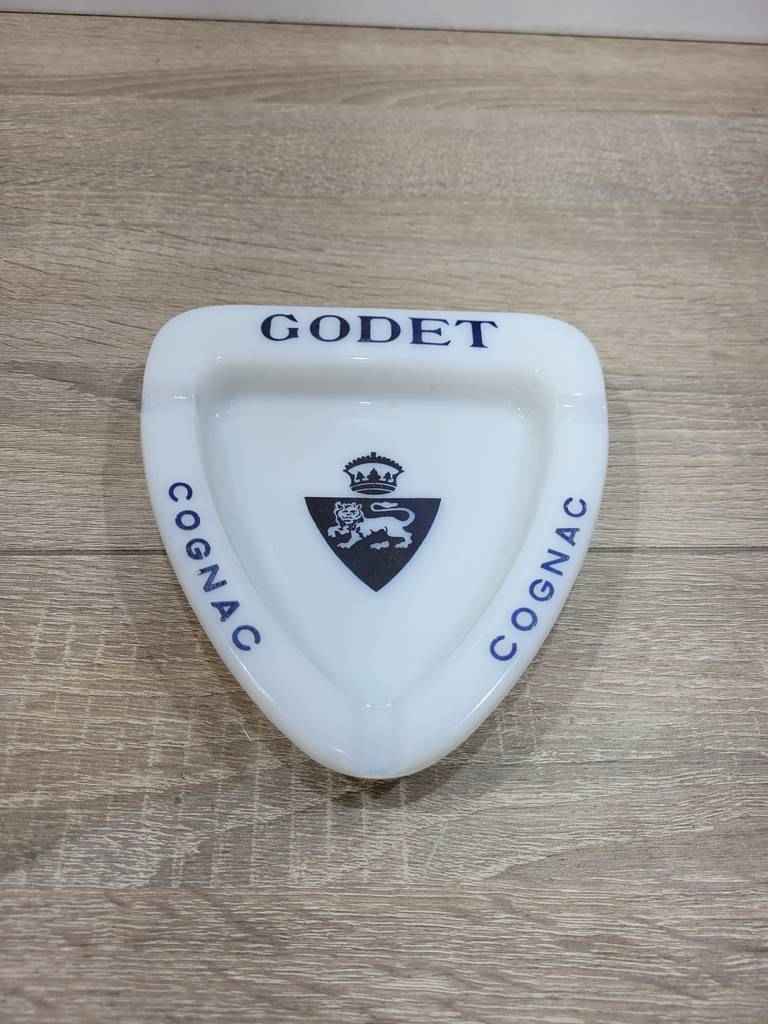 Cenicero de forma triangular de la marca de bebidas Godet de color blanco. Se trata de un objeto perfecto para disponer de él si eres una persona fumadora pero también es ideal como elemento decorativo. Como se puede observar en las fotografías se encuentra en buen estado de conservación y en perfectas condiciones para ser utilizado.