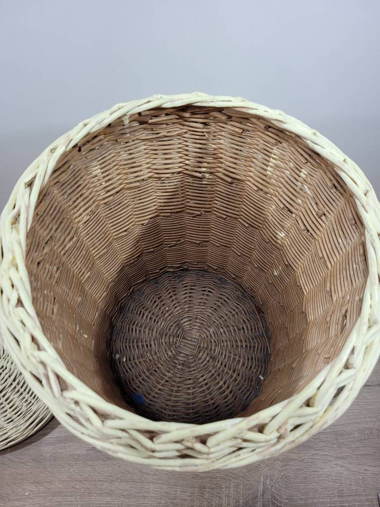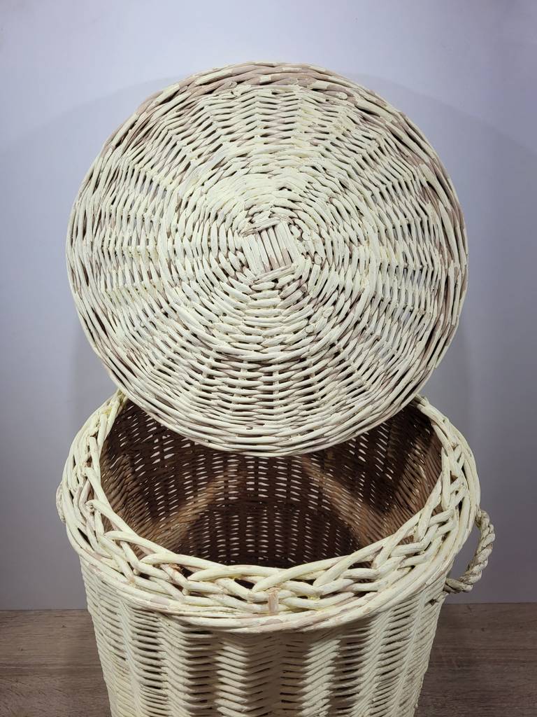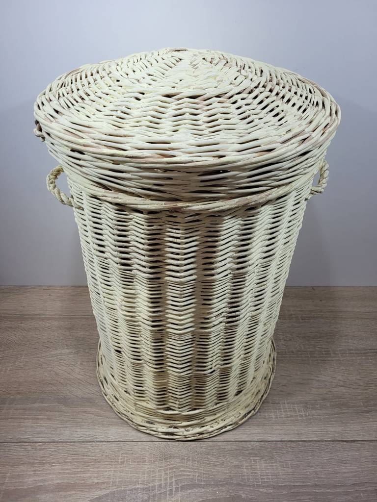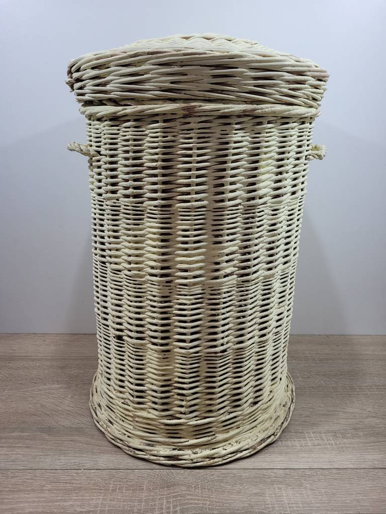 Cesto de mimbre con una forma cilíndrica y de alta estatura de color crema. Se trata de un cesto fabricado en mimbre de buena calidad que cuenta con dos asas en los laterales y dispone de una tapa en la parte superior. Es un cesto ideal para tenerlo en el hogar y utilizarlo para guardar objetos o prendas de ropa. Como se puede observar en las fotografías se encuentra en buenas condiciones.