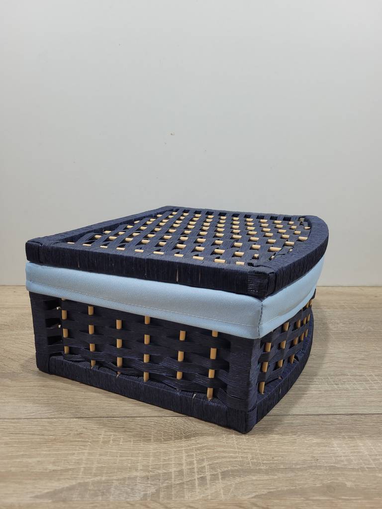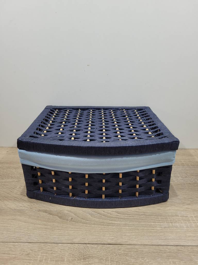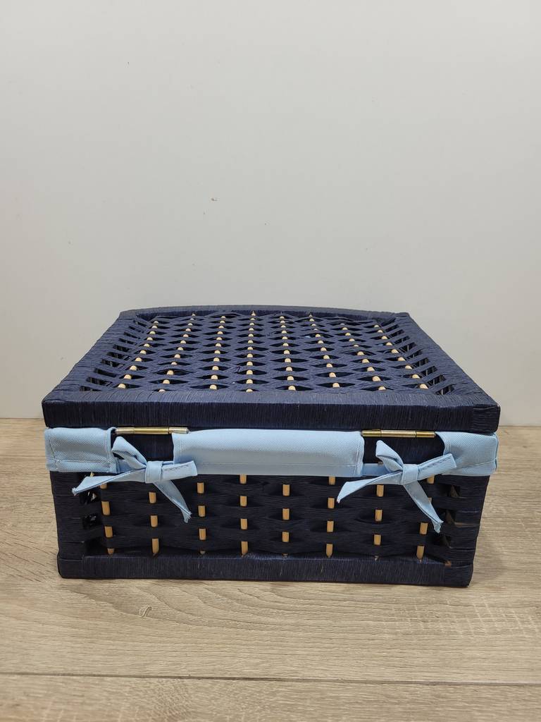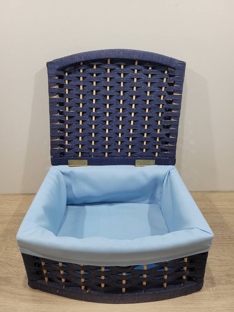 Cesto en color azul de tamaño pequeño que ha sido realizado con mimbre de buena calidad. Se compone de una tapa abatible y el interior está forrado con tela suave y agradable al tacto. Es ideal para guardar pequeños enseres como joyas, accesorios de maquillaje o de costura. Como podemos observar en las fotografías se encuentra en buenas condiciones.