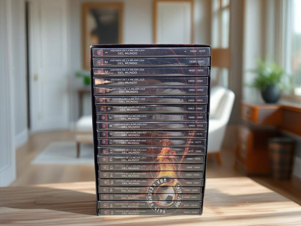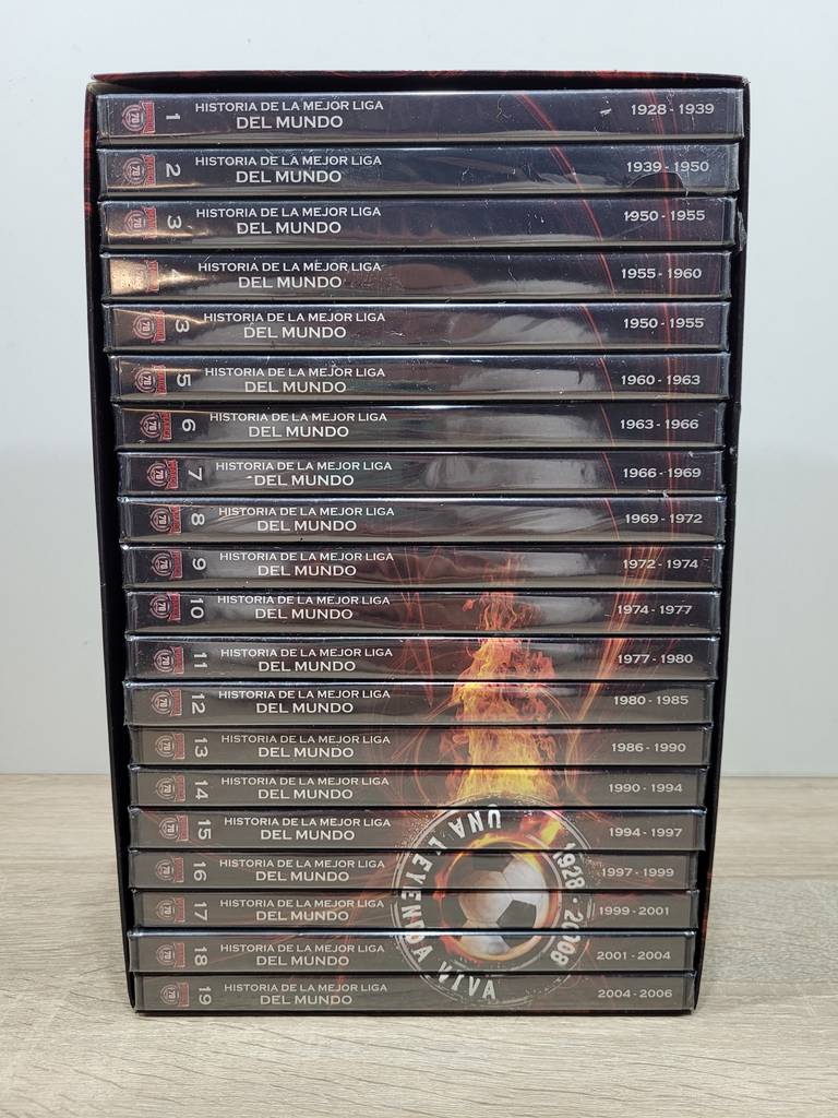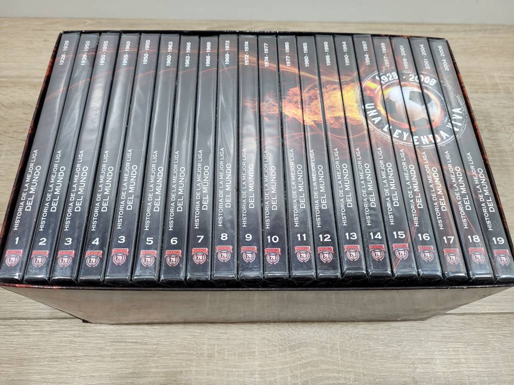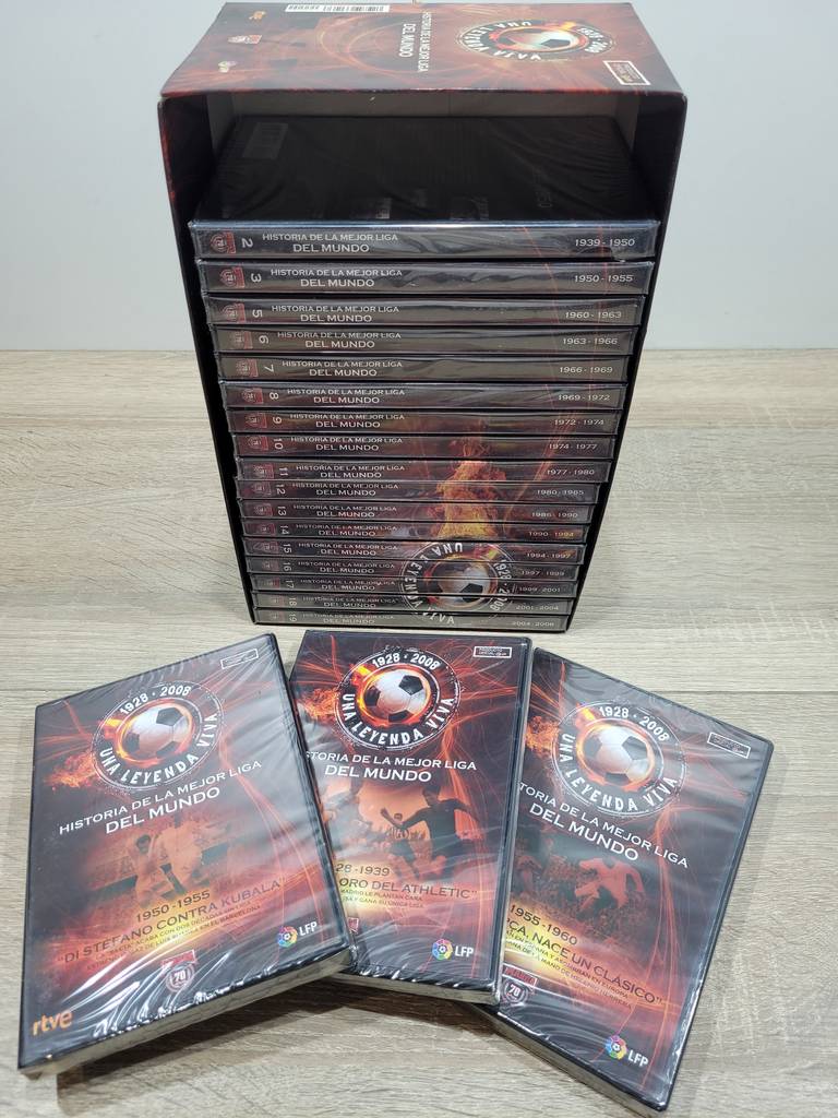 Ref. ✅ O8908 Esta es una colección completa de 20 DVDs titulada “Historia de la Mejor Liga del Mundo”. La colección es un documental deportivo que repasa los campeonatos nacionales de la Liga Española de fútbol (LaLiga) desde sus inicios en 1928 hasta el año 2008. Los DVDs están en sus cajas originales y la imagen muestra que algunos aún conservan el precinto de fábrica, lo que indica un estado nuevo o como nuevo.Fue una edición realizada por el diario deportivo español Marca, en colaboración con RTVE y la LFP (Liga de Fútbol Profesional).