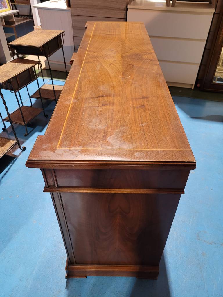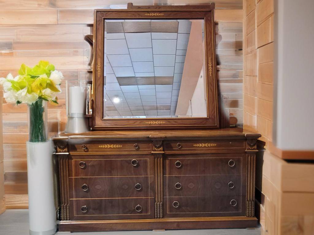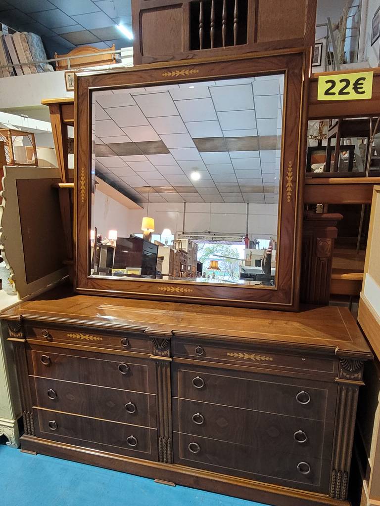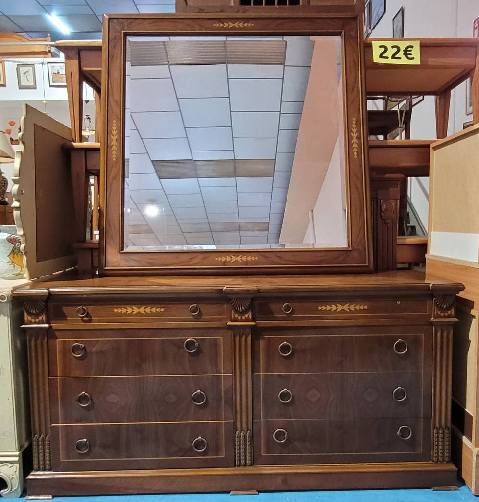 Ref. ✅ O9214 Esta es una cómoda y espejo de gran formato en madera de alta calidad. Estilo clásico con elegantes incrustaciones decorativas tanto en los cajones como en el marco del espejo. Cuenta con 8 cajones de diferentes tamaños (2 superiores estrechos y 6 amplios inferiores), ideales para organizar ropa y accesorios. Tiradores de anilla metálica de estilo antiguo y columnas laterales talladas. Es una pieza robusta, con acabados artesanales y detalles decorativos que aportan un toque de distinción a cualquier dormitorio. Muy bien conservado, con la madera y el cristal del espejo en excelentes condiciones.