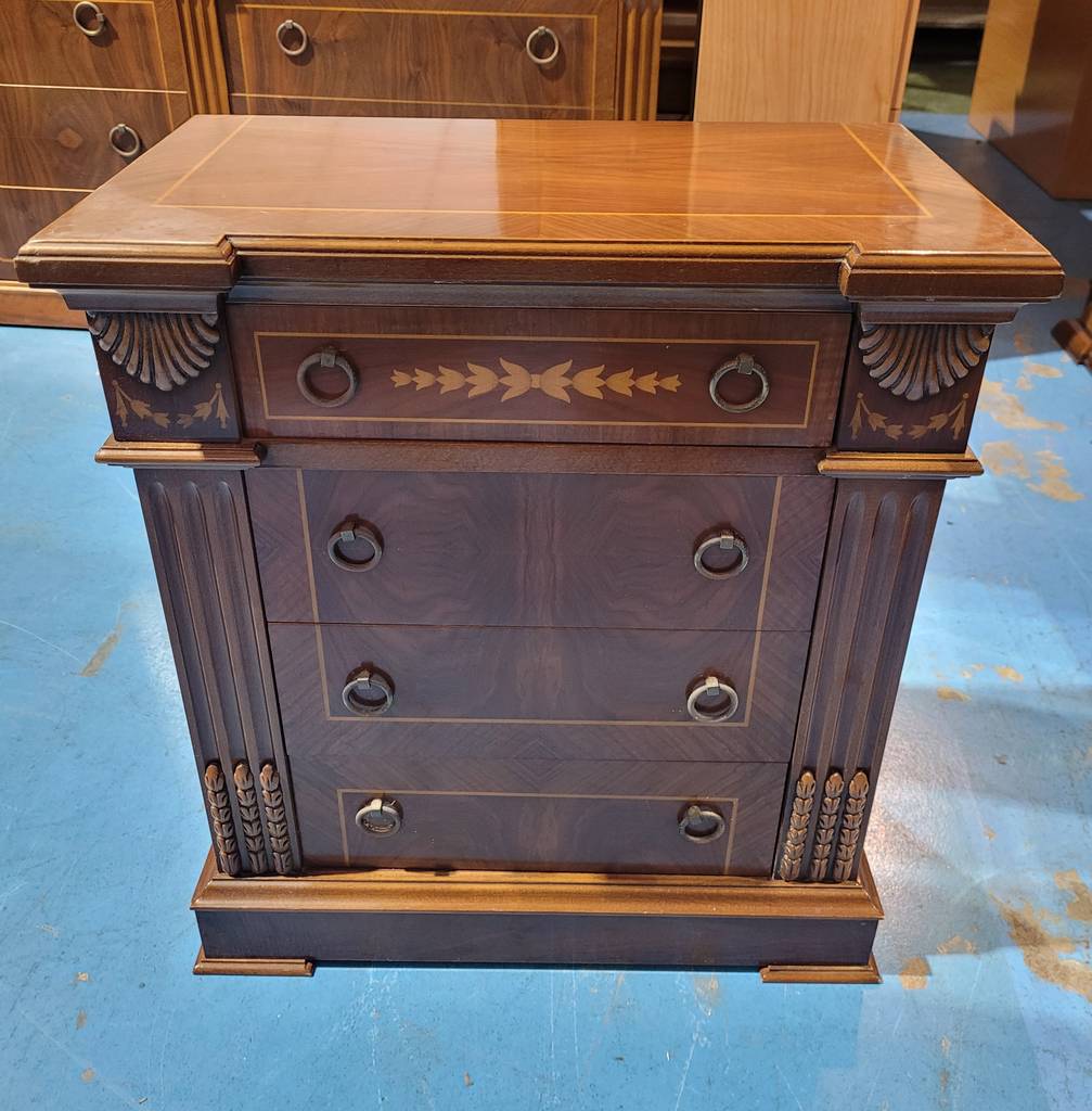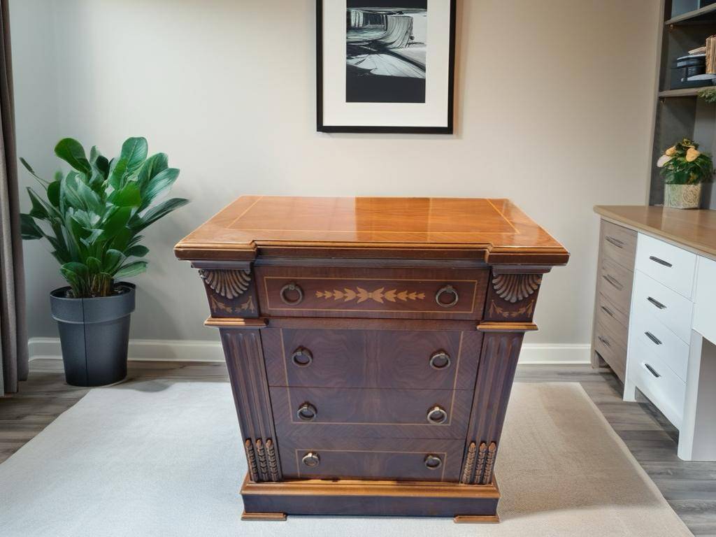 Ref. ✅ O9216  Esta es una magnífica cómoda de diseño clásico, ideal para aportar un toque de distinción y elegancia a cualquier estancia. Esta pieza destaca por su exquisito trabajo de marquetería en el frontal de los cajones y el tablero superior. Presenta columnas laterales acanaladas rematadas y talladas a mano. El frontal incluye un cajón superior decorado con motivos vegetales incrustados y tres amplios cajones inferiores con tiradores metálicos circulares de diseño sobrio. Construida en maderas nobles con acabados en varios tonos que realzan la veta natural y el contraste de la marquetería. Se encuentra en excelente estado de conservación, conservando toda su estructura original y herrajes.