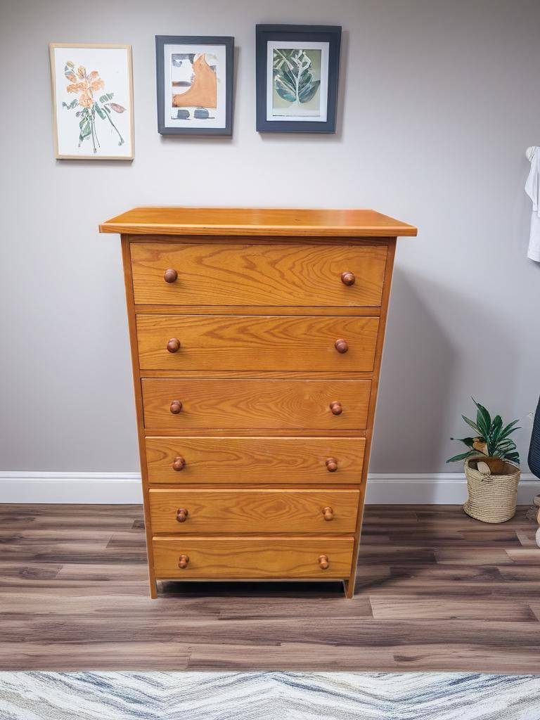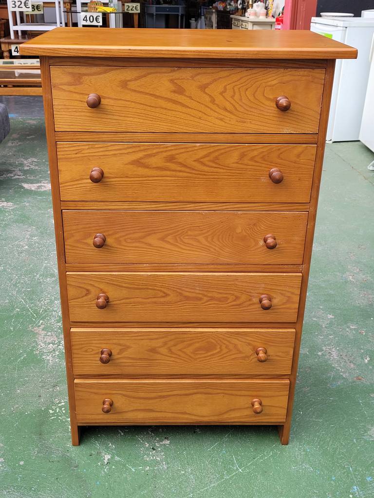 Ref. ✅ O9492 Esta es una cómoda de madera con un diseño provenzal. Dispone de 6 cajones frontales que ofrecen una mayor superficie de guardado, ideal para prendas voluminosas. Madera con un acabado de veta natural en tono cálido, muy fácil de combinar con cualquier decoración. Aunque es ideal para un dormitorio principal, su diseño arquitectónico la hace perfecta como mueble de entrada (recibidor) o incluso como un aparador alto en un salón o estudio. El mueble se encuentra en excelentes condiciones, con un mantenimiento impecable.