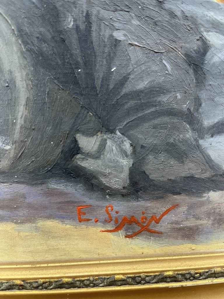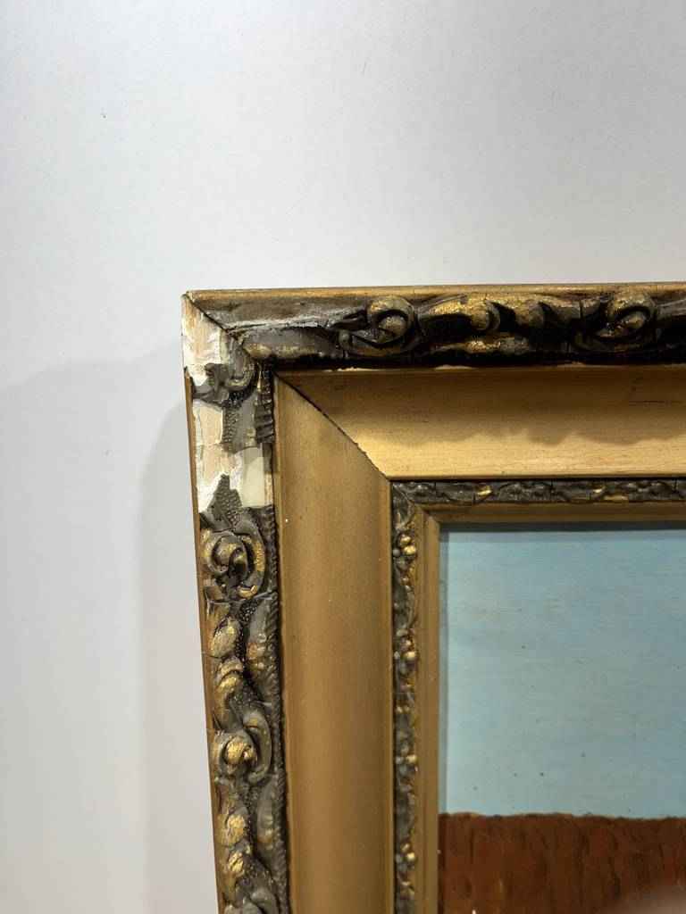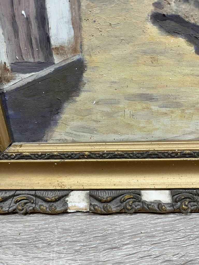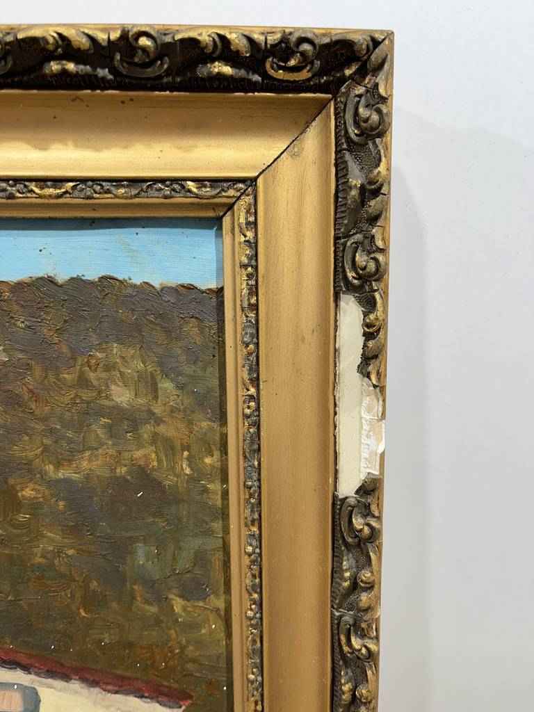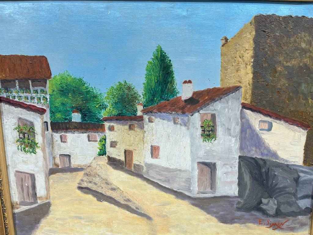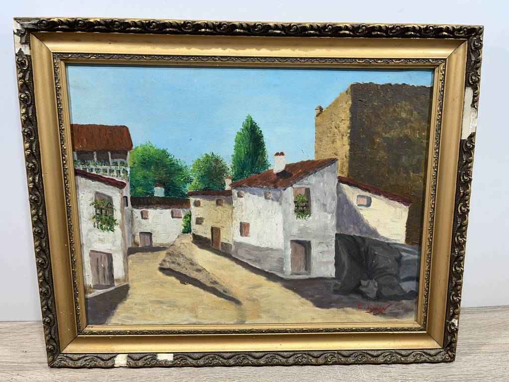 Cuadro elegante pintado al óleo y firmado por su autor E.Simon. Se trata de un cuadro muy bonito y original en el que podemos observar pueblo de época con unos árboles al fondo. Está rodeado por un elegante marco con detalles dorados. Es ideal para un recibidor o para un salón comedor. Como podemos observar en las fotografías el marco presenta algunos desperfectos pero la pintura se encuentra en buenas condiciones.