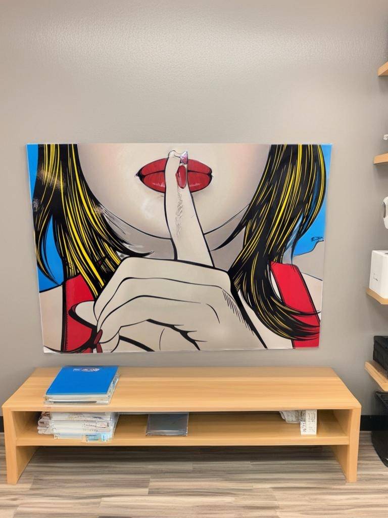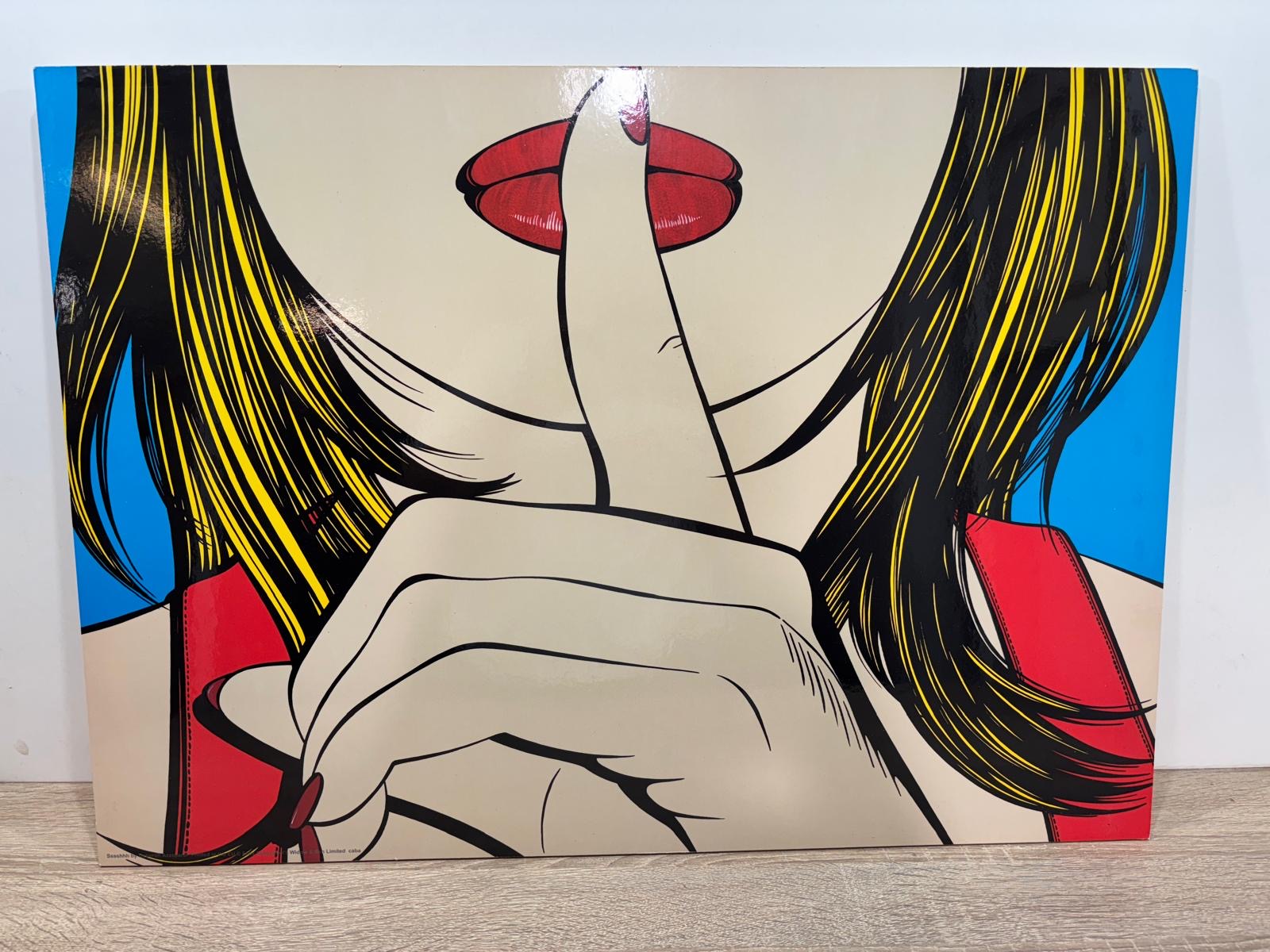 Ref. ✅ O8804 Este cuadro de Arte pop, es ideal como una “statement piece” (pieza que capta la atención) para añadir un toque moderno, retro o de arte urbano a cualquier habitación, desde el salón hasta el dormitorio u oficina. Estilo pop art de cómic con colores vivos y llamativos (rojo, azul y amarillo), que representa a una mujer con un dedo sobre los labios haciendo el gesto de silencio. El estado general es bueno, pero como artículo vintage, puede presentar signos menores de desgaste o pequeños arañazos en los bordes o la superficie, lo cual es común en estas piezas.