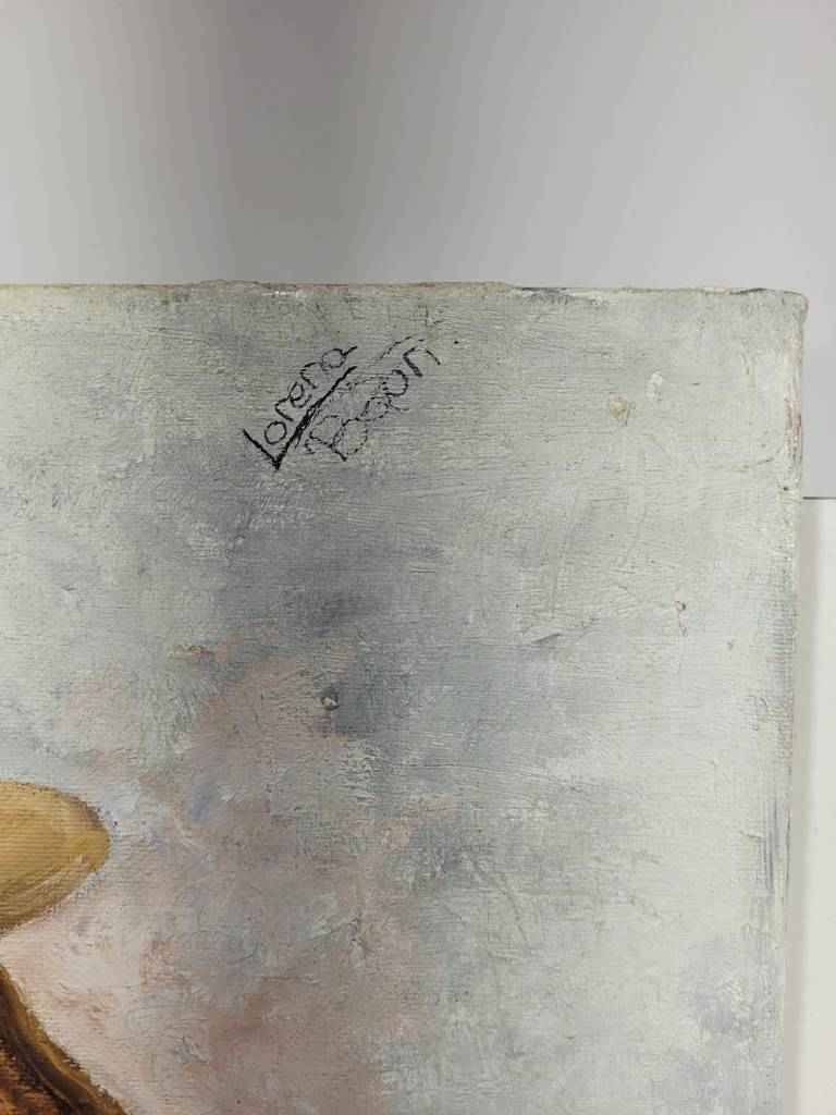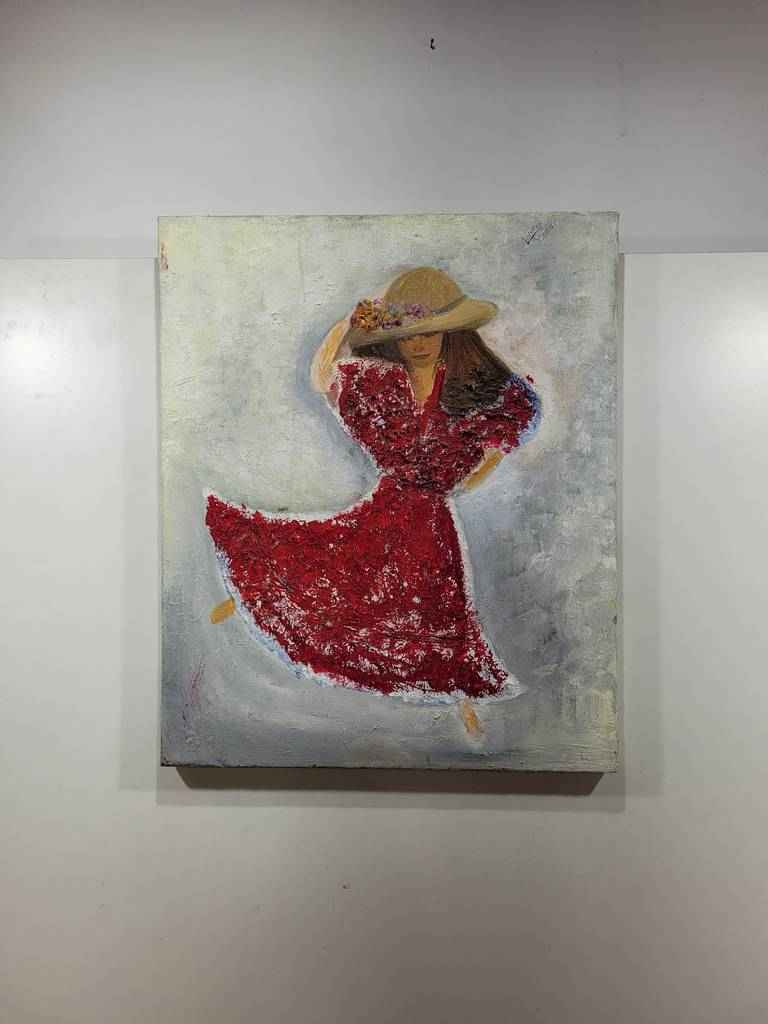 Cuadro con forma rectangular muy bonito y original en el que podemos observar a una niña o mujer en posición de baile. Porta un vestido rojo y un bonito sombrero con flores el cual está sujetando con una mano. Está firmado por su autora. Es un cuadro ideal para colocar en un salón comedor o recibidor y darle, con ello, un toque bonito a nuestra estancia. Como podemos observar en las fotografías se encuentra en buen estado.