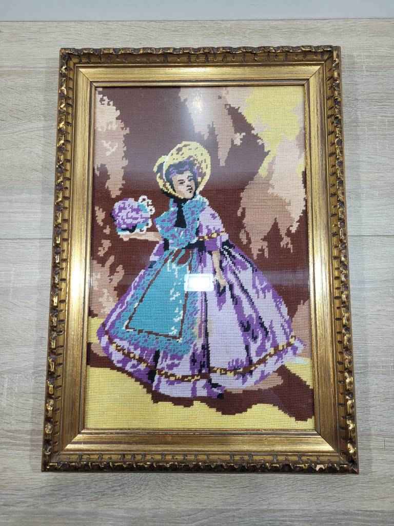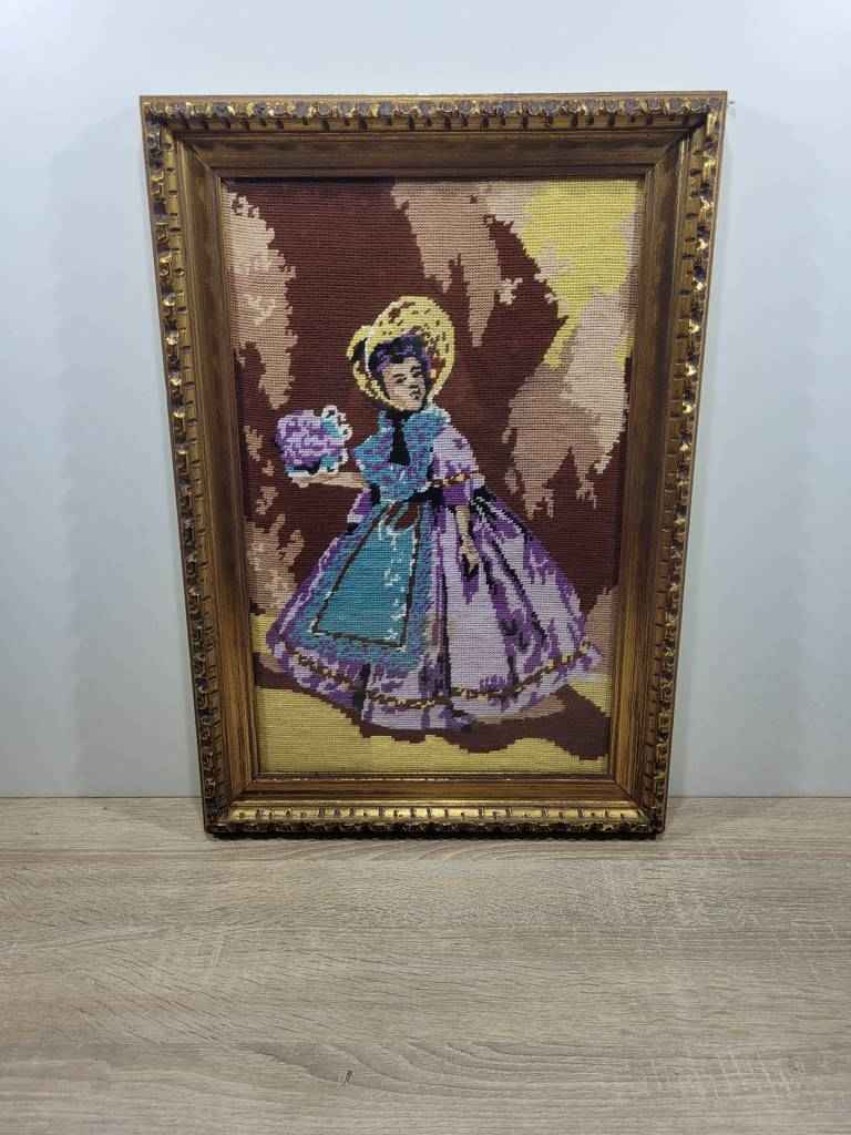 Cuadro de estilo clásico muy bonito y original que ha sido realizado con tela. En el cuadro podemos observar a una niña vestida de época con un traje y en su mano derecha porta un ramo de flores. Está enmarcado con un marco muy elegante con múltiples formas que lo hacen resaltar. Es ideal para colocar en un recibidor o salón comedor. Como podemos observar en las fotografías se encuentra en buenas condiciones.