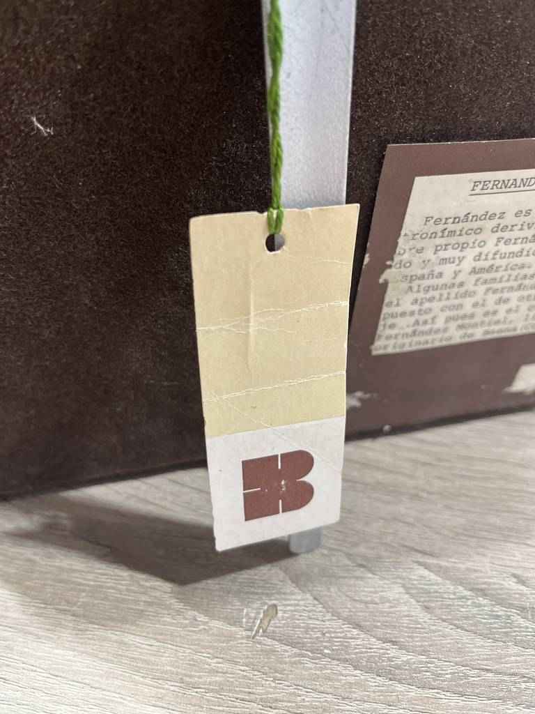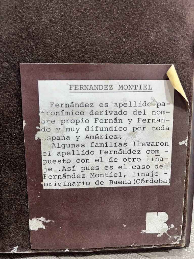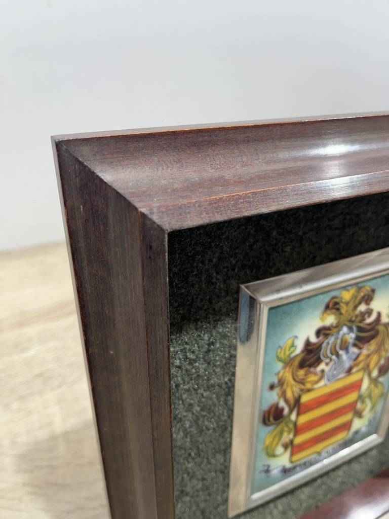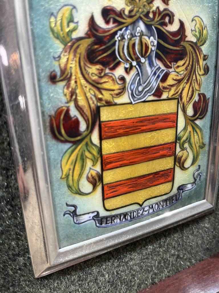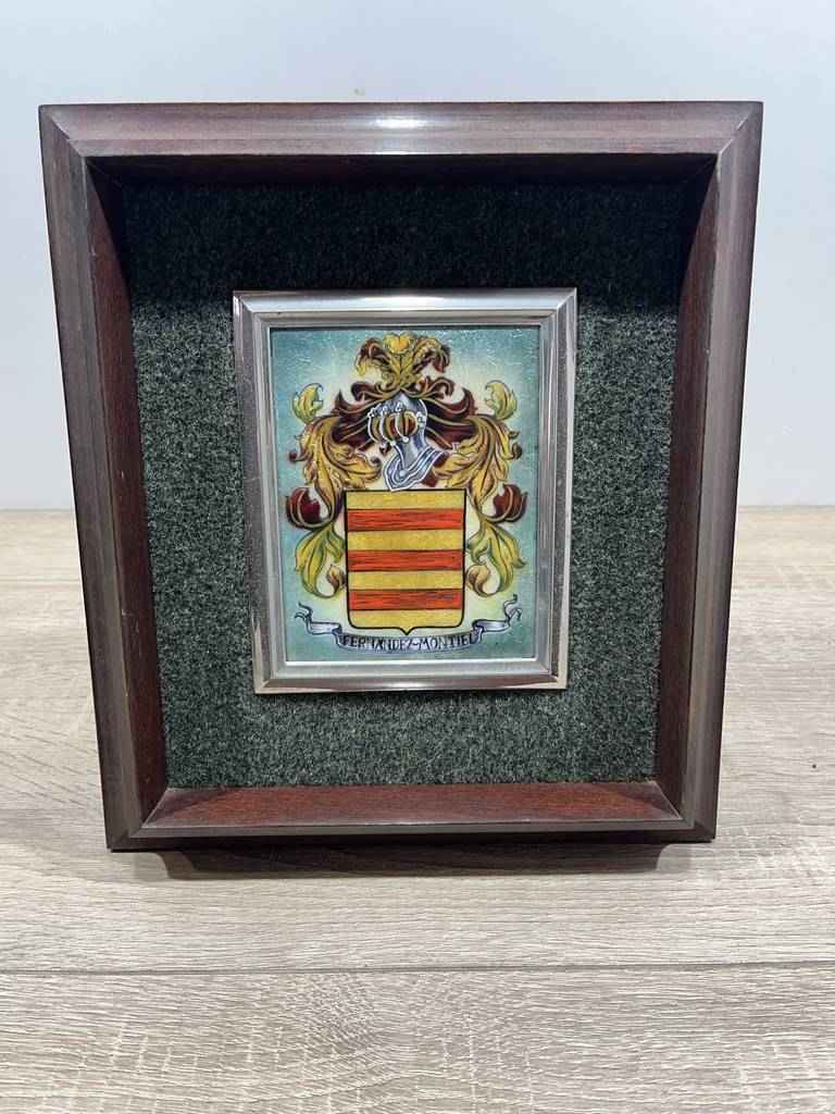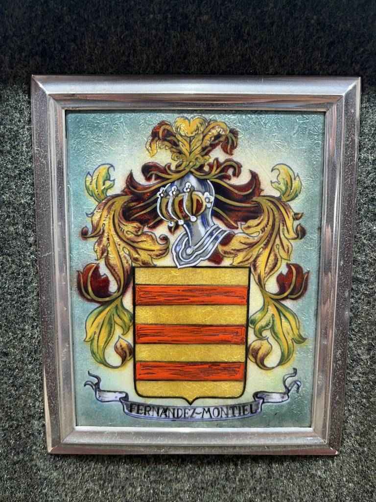 Cuadro en esmalte con un marco de madera de buena calidad. En el cuadro podemos observar en la parte central un dibujo que se compone de un escudo de la casa Fernández Montiel. Está rodeado por unas hojas y en la parte superior un casco de caballero de la edad media. Como podemos observar en las fotografías se encuentra en buen estado.