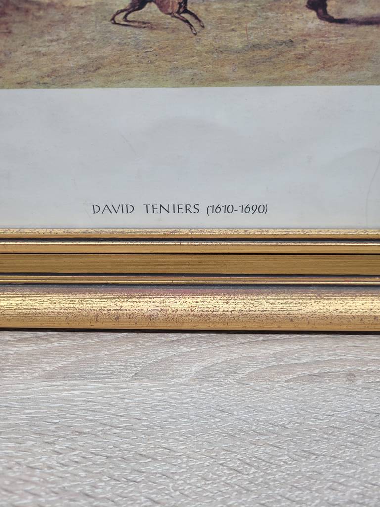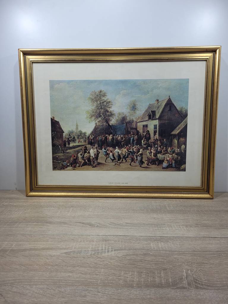 Cuadro lámina con un marco dorado muy elegante. Se trata de un cuadro único con una pieza en la parte central en la que podemos observar un pueblo antiguo con gentes en sus calles reunidos con varios danzando en la parte central. Es un cuadro lámina ideal para decorar un recibidor o un salón comedor. Como podemos observar en las fotografías se encuentra en buenas condiciones.