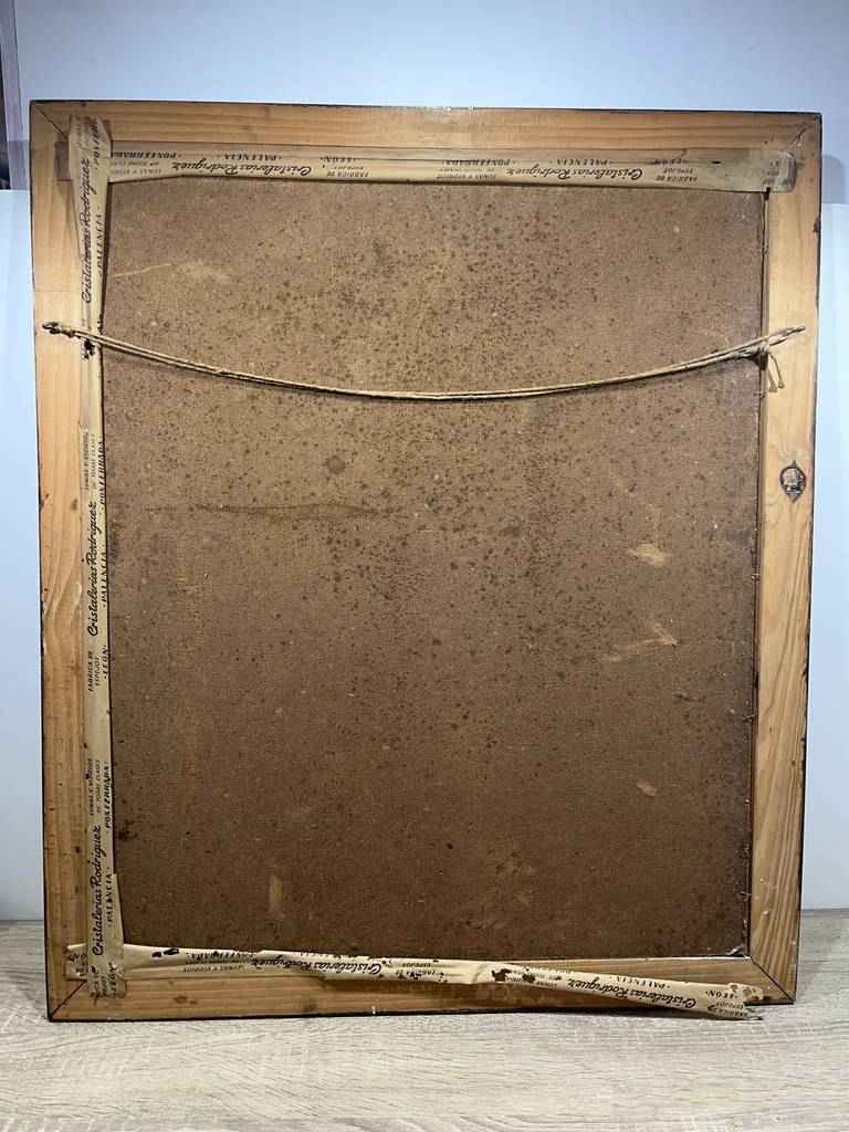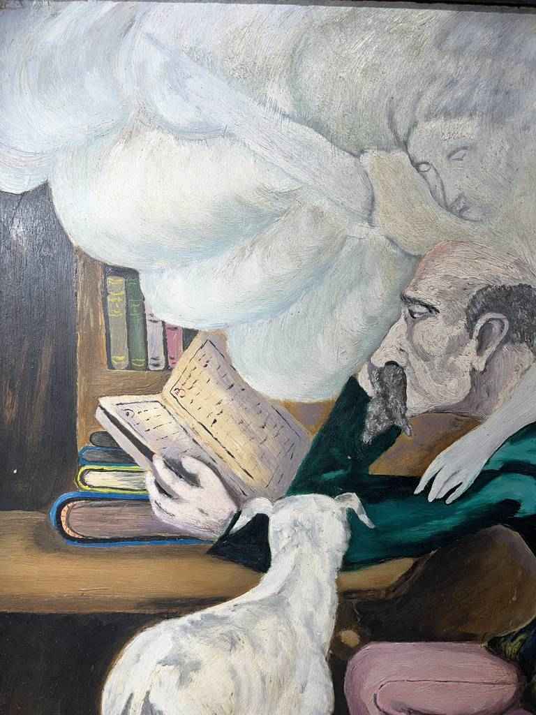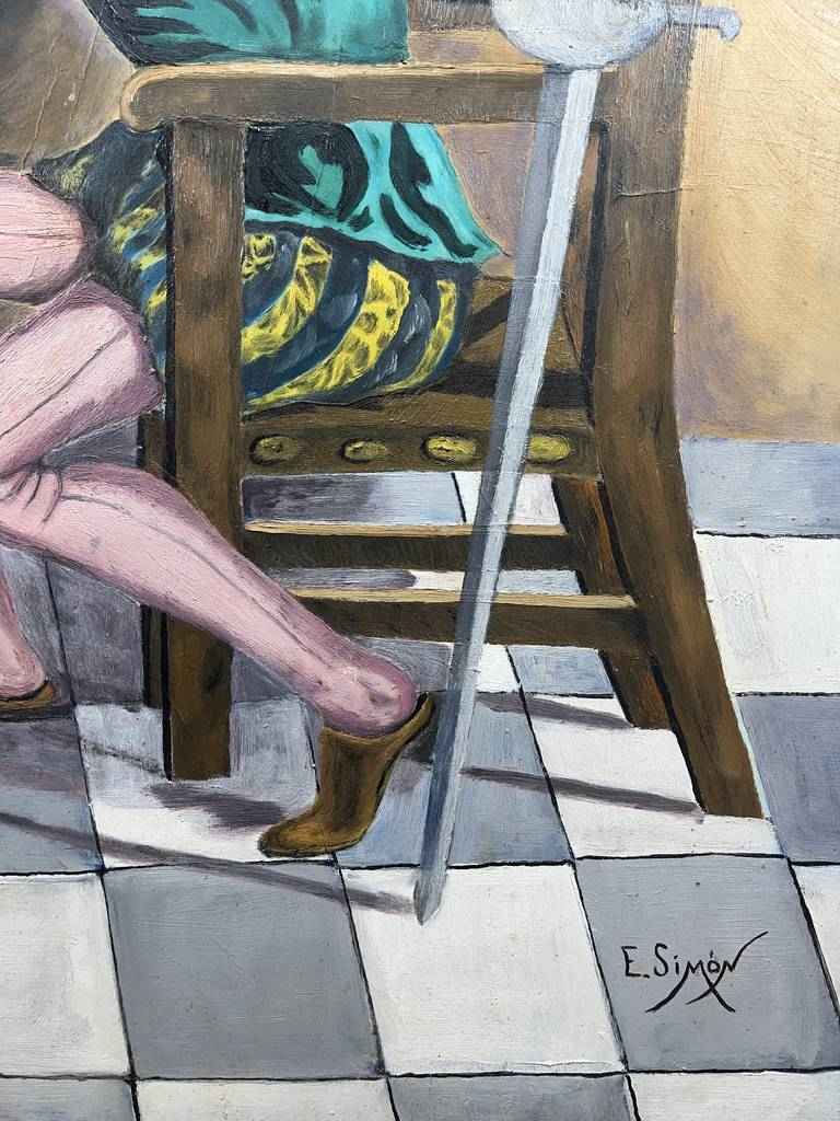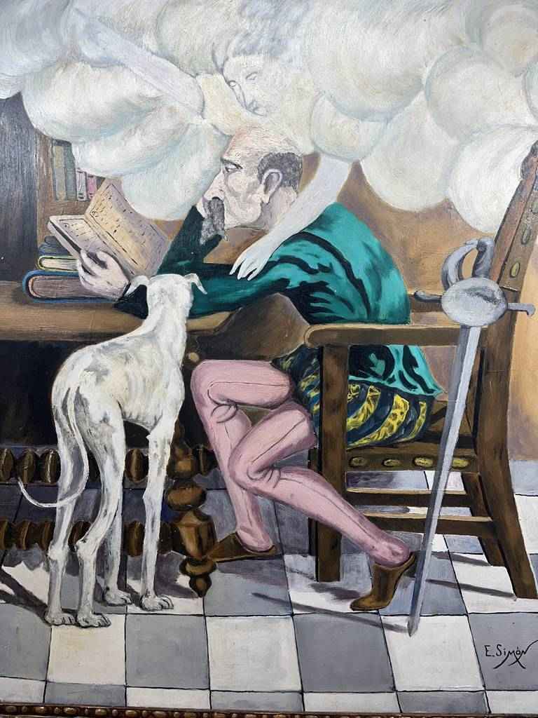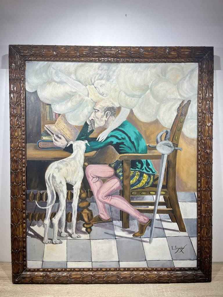 Cuadro pintado al óleo y firmado por su autor E.Simon. Se trata de un cuadro muy original y único en el que podemos observar a un hombre de época leyendo en un estudio y con un perro al lado. Lo rodea un bonito marco realizado en madera de muy buena calidad y con detalles realizados con gran precisión. Como podemos observar las fotografías presenta desgaste en la parte posterior.