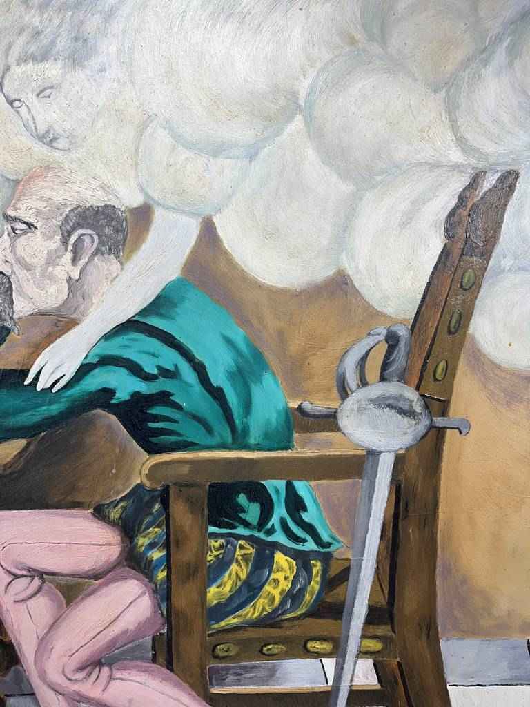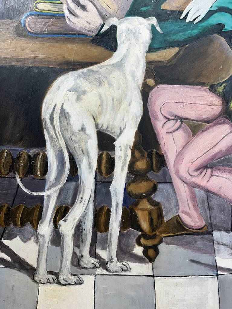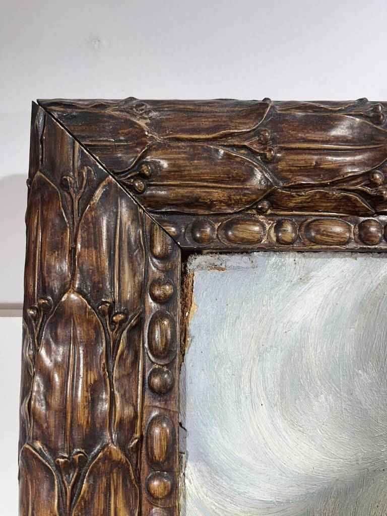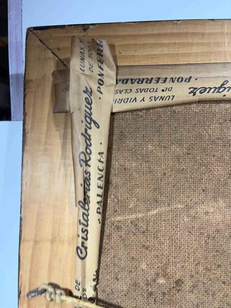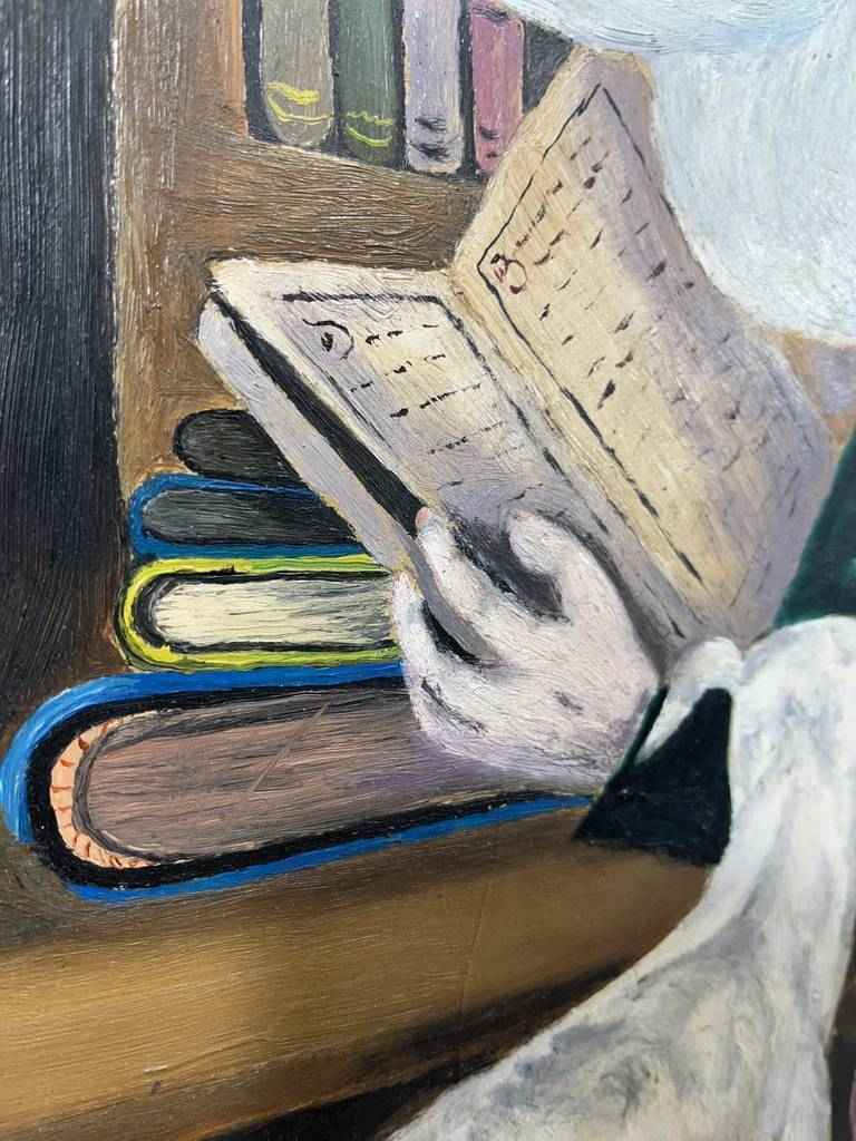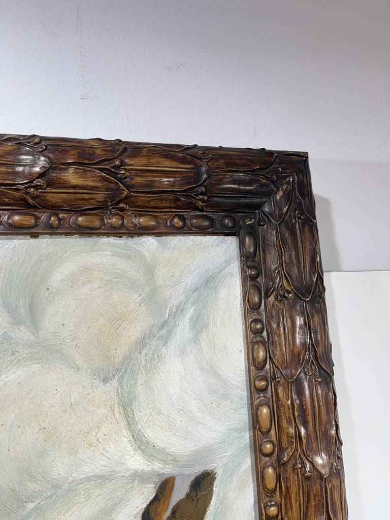 Cuadro pintado al óleo y firmado por su autor E.Simon. Se trata de un cuadro muy original y único en el que podemos observar a un hombre de época leyendo en un estudio y con un perro al lado. Lo rodea un bonito marco realizado en madera de muy buena calidad y con detalles realizados con gran precisión. Como podemos observar las fotografías presenta desgaste en la parte posterior.