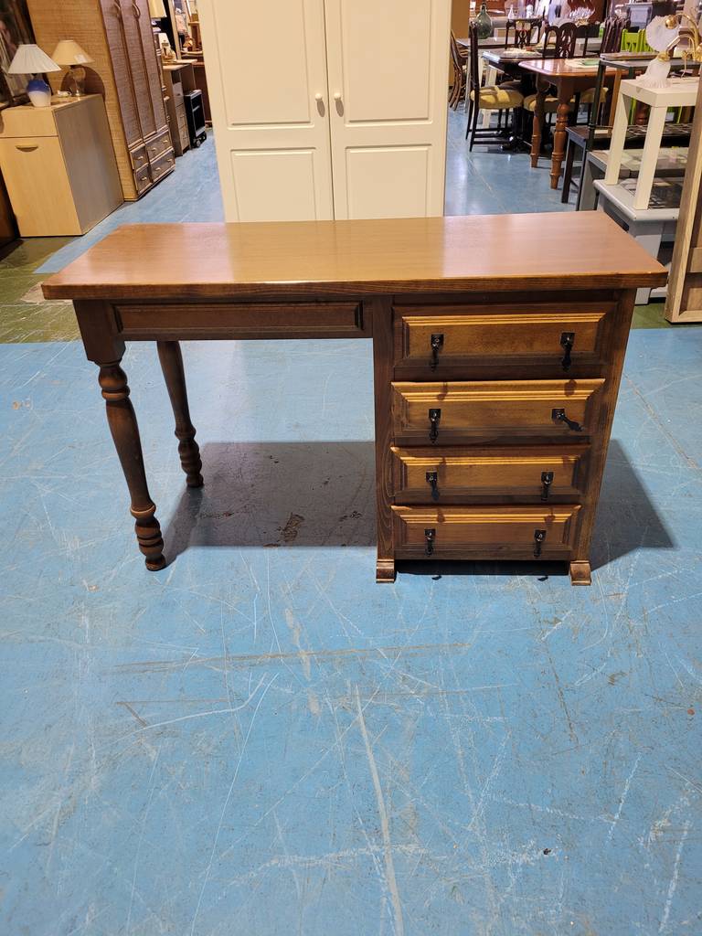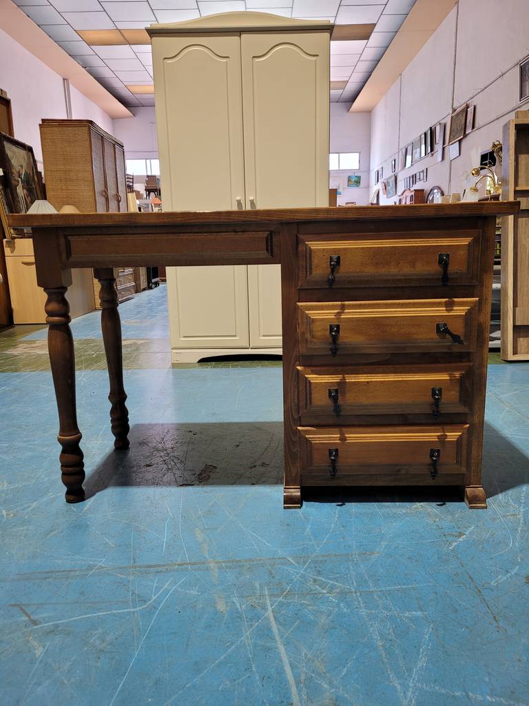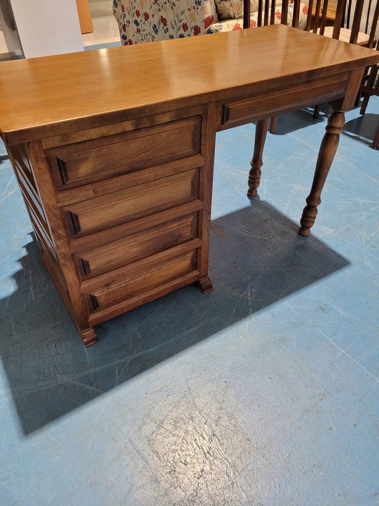 Escritorio de estilo castellano que ha sido fabricado con madera de buena calidad y robusta. Se trata de un elegante escritorio compuesto por una parte frontal con cuatro cajones en un lateral y un espacio con un cajón corredizo. Es un escritorio ideal para un despacho o estudio. Como podemos observar en las fotografías se encuentra en buenas condiciones.