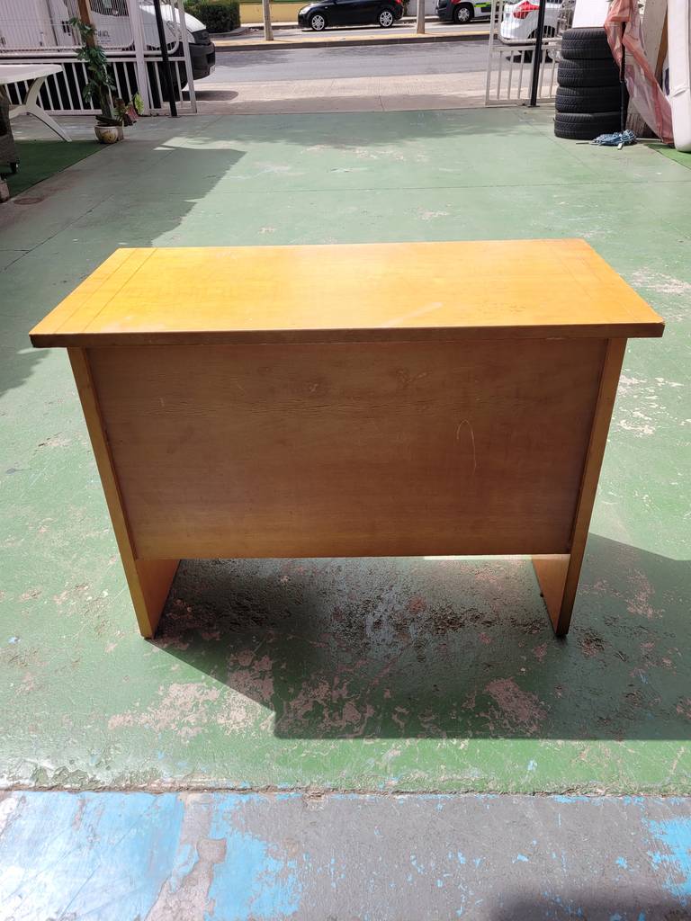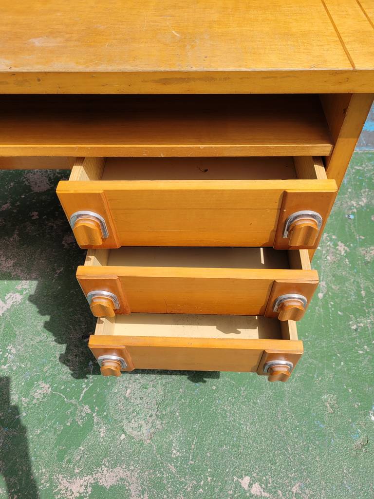 Escritorio de madera de buena calidad de color marrón claro. Se trata de un escritorio de tamaño mediano que cuenta con una superficie rectangular y tiene en un lateral una torre con tres cajones con dos tiradores cada uno que facilitan su apertura. Es un escritorio ideal para ponerlo en el estudio de un hogar. Como se puede observar en las fotografías se encuentra en buenas condiciones.