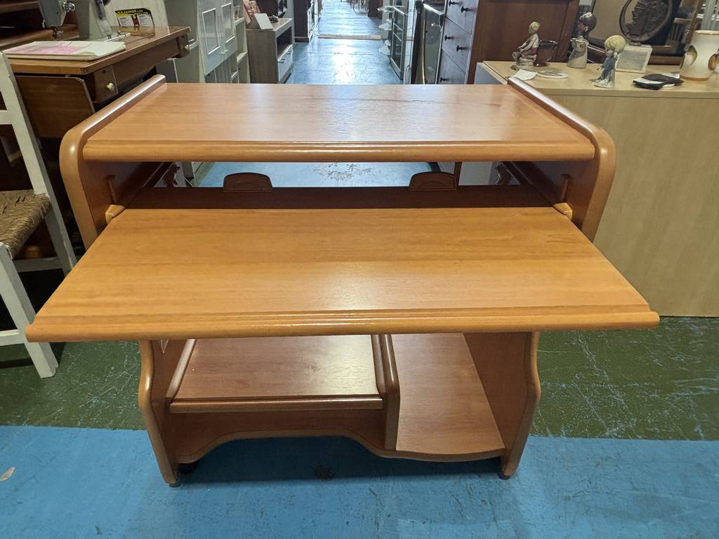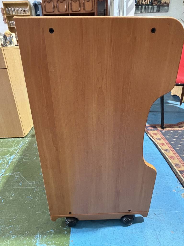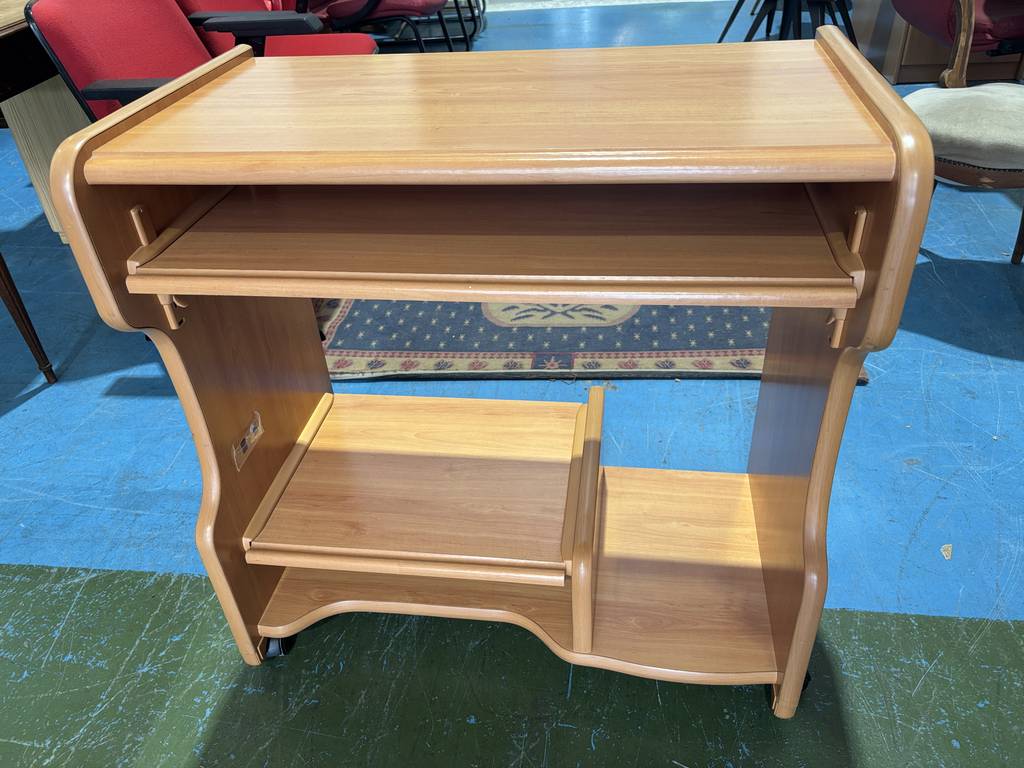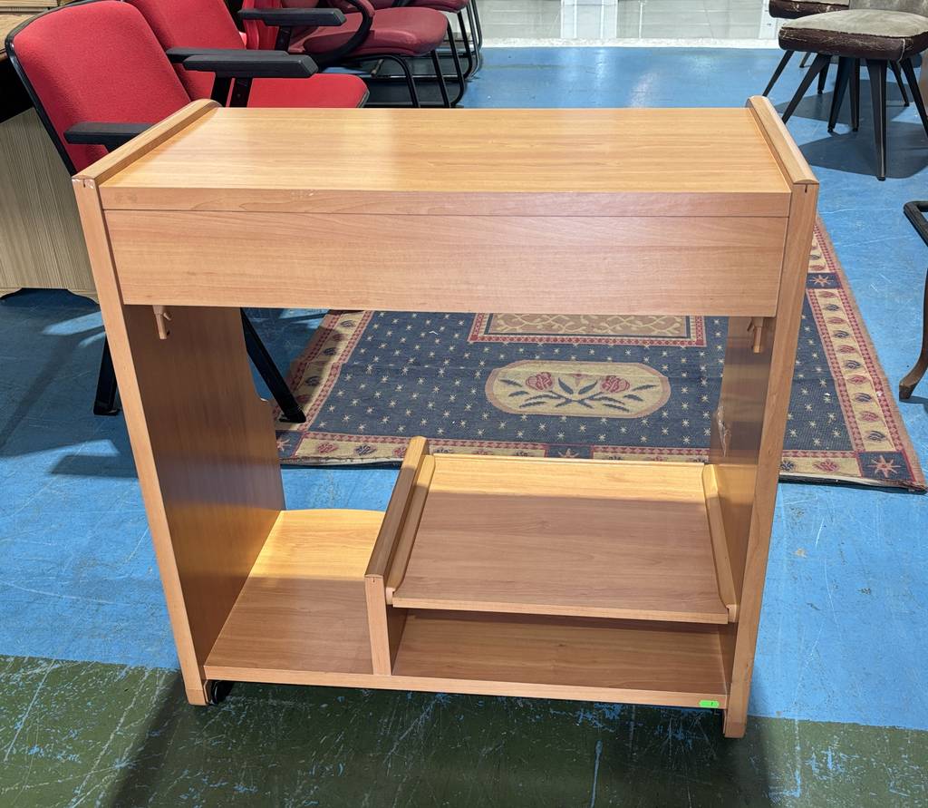 Ref. ✅ O8729 Este escritorio de madera, es perfecto para usar como carrito de servicio, mesa auxiliar o escritorio para ordenador portátil o mueble de almacenamiento adicional. Ideal para el hogar o la oficina, gracias a su diseño compacto y versátil. Cuenta con ruedas para un fácil desplazamiento, dispone de un cajón superior para guardar objetos pequeños y estantes abiertos para almacenamiento adicional. Se encuentra en buen estado, listo para darle una segunda oportunidad.