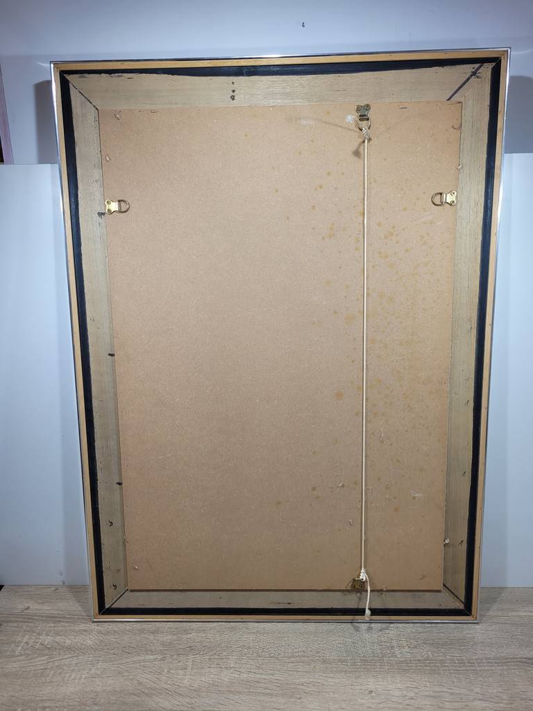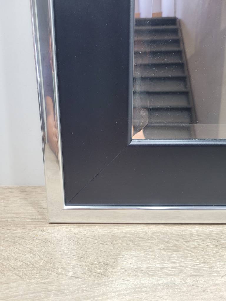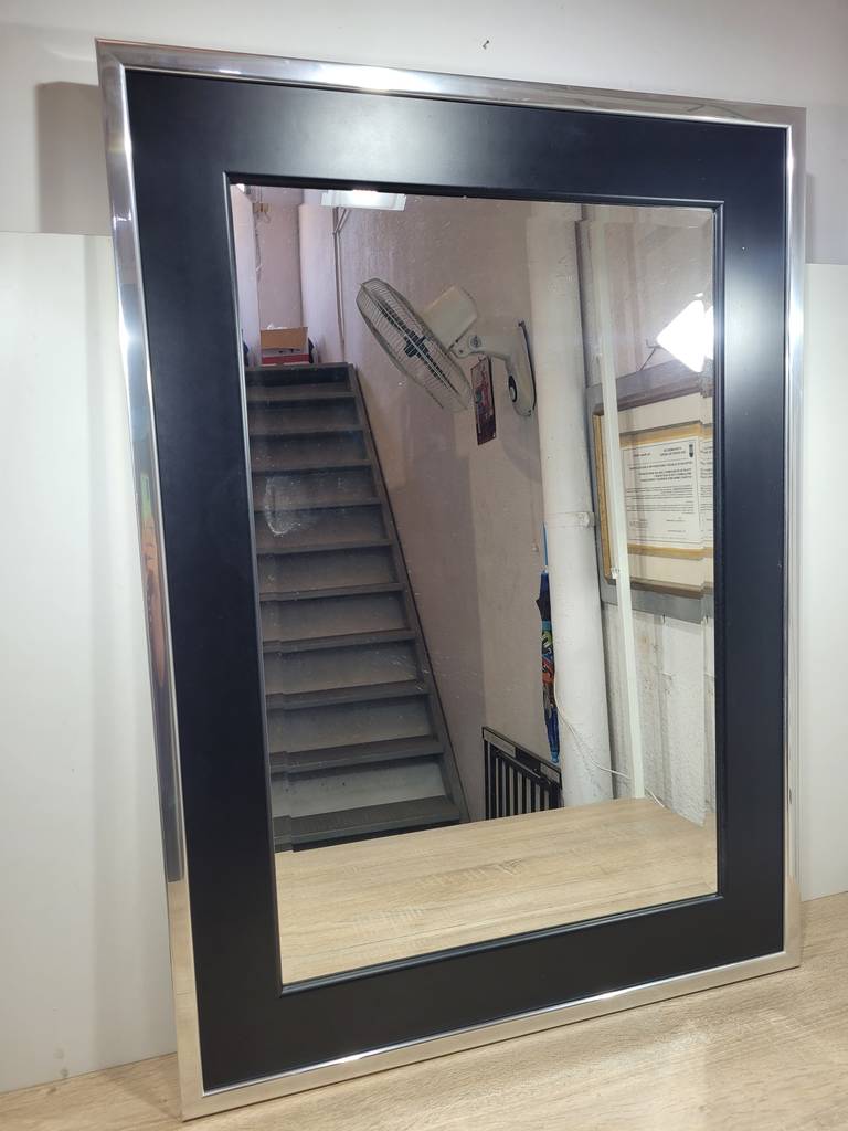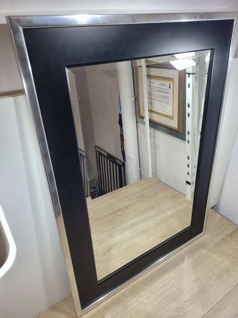 Espejo de tamaño medio y con forma rectangular con un diseño moderno y ecléctico. Su marco con listones de madera amplios en color negro y con un borde en gris metalizado brillante lo hará resaltar en cualquier estancia, en especial en un recibidor o en un salón comedor. Como podemos observar en las fotografías se encuentra en buenas condiciones.