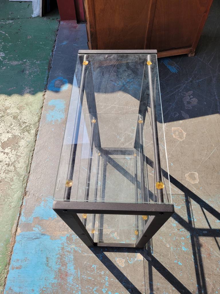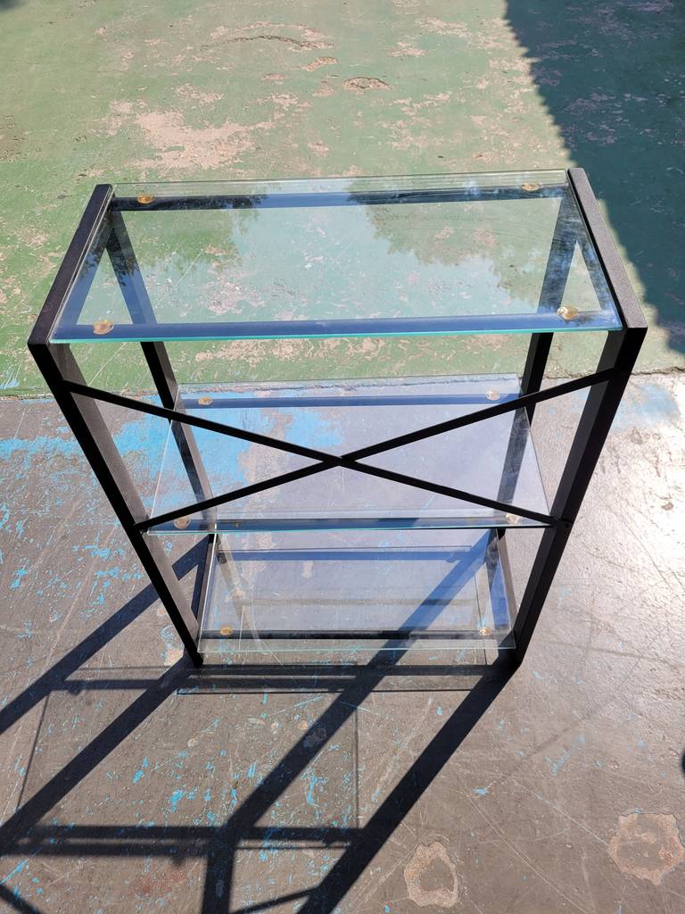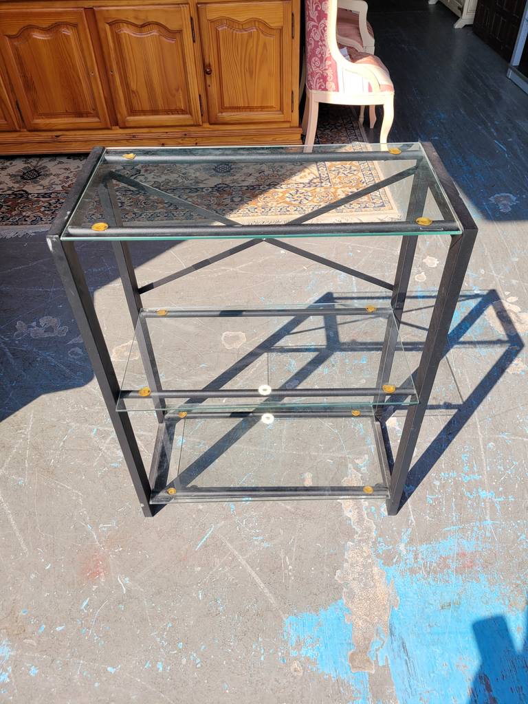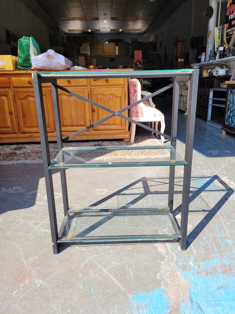 Estantería de tamaño pequeño que está compuesta de tres baldas rectangulares de cristal grueso que se asientan en una estructura de metal. Es un mueble ideal para colocar en un recibidor o en un salón comedor con unas bonitas figuras en cada leja. Como podemos observar en las fotografías se encuentra en buenas condiciones.