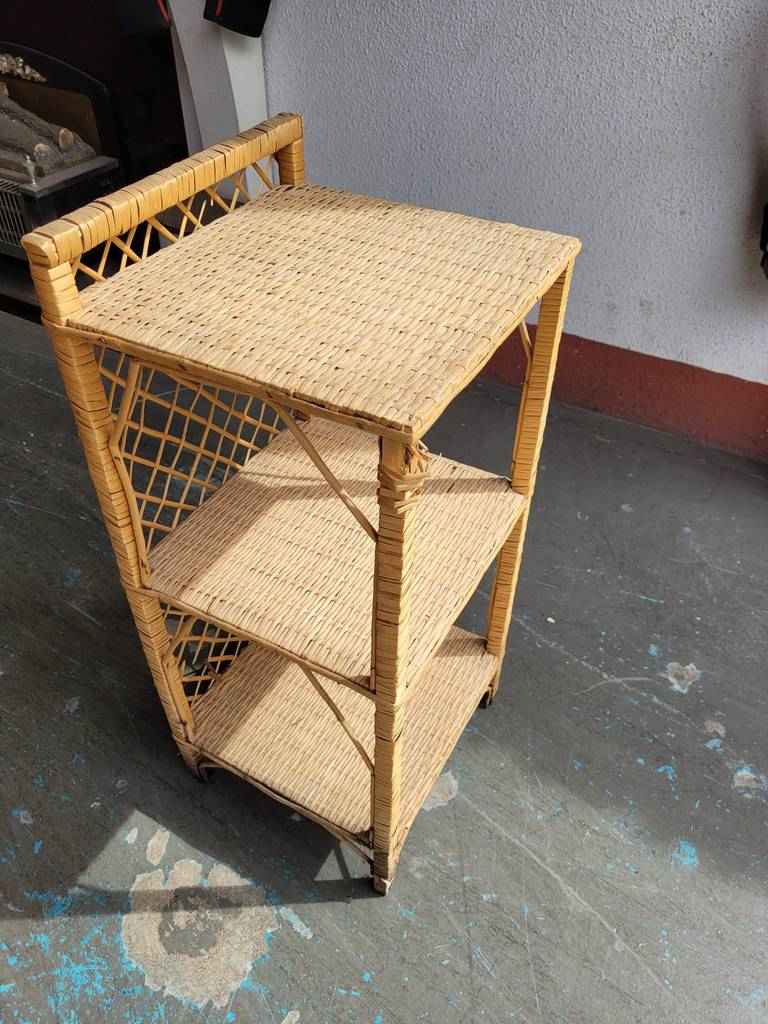 Estantería muy coqueta y bonita que ha sido realizada con mimbre de buena calidad y robusta. Se compone de múltiples baldas que son ideales para colocar múltiples enseres, tales como frutas, verduras o también libros o figuras. Es muy versátil puesto que queda perfecta tanto en un salón comedor como en una cocina. Como podemos observar en las fotografías presenta desperfectos.