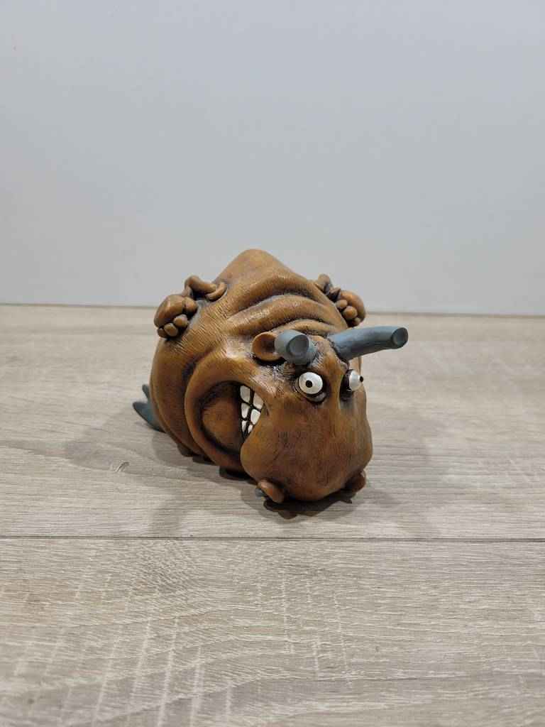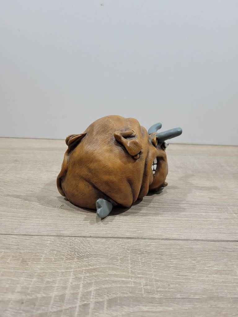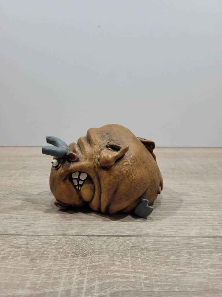Figura de resina de un toro con una expresión facial de cabreo. Se trata de una figura de pequeñas dimensiones de color marrón ideal para colocarla encima de una estantería o para lucirla en una vitrina en un salón comedor. También es perfecta para coleccionistas de este tipo de figuras. Como se observa en las fotografías se encuentra en buen estado.