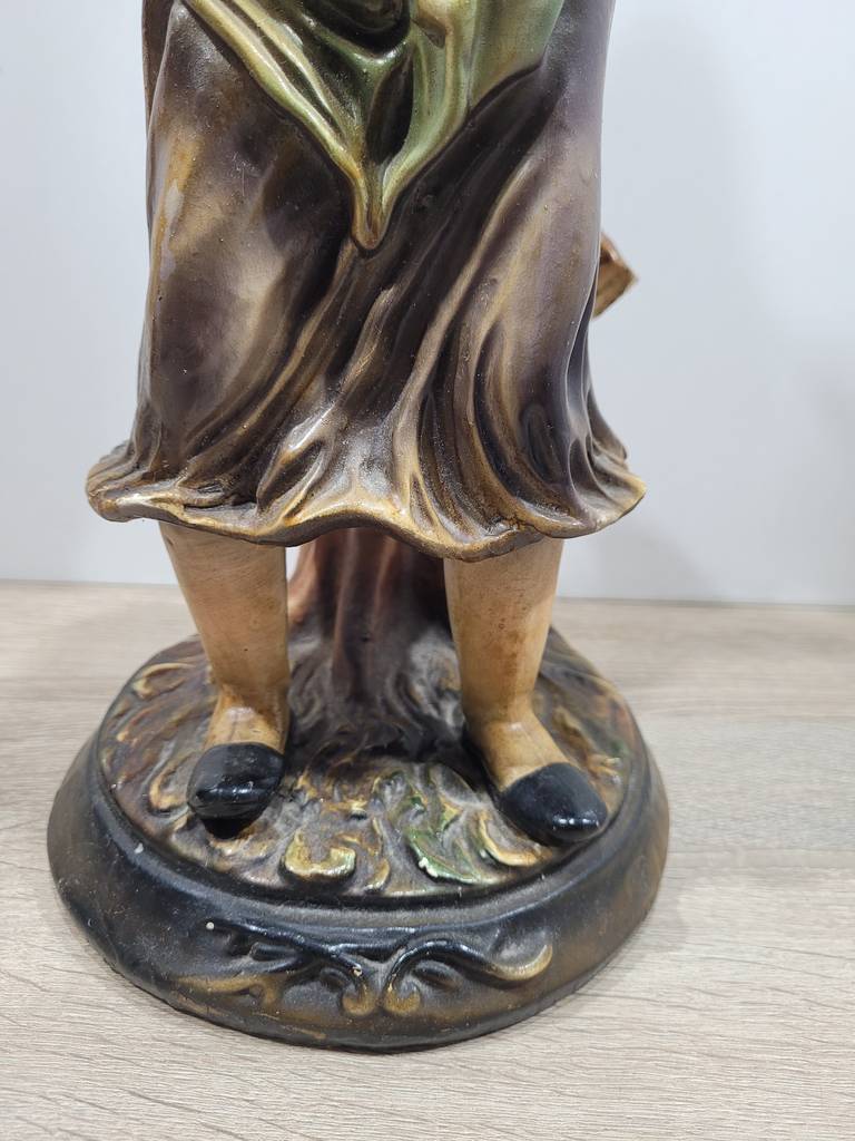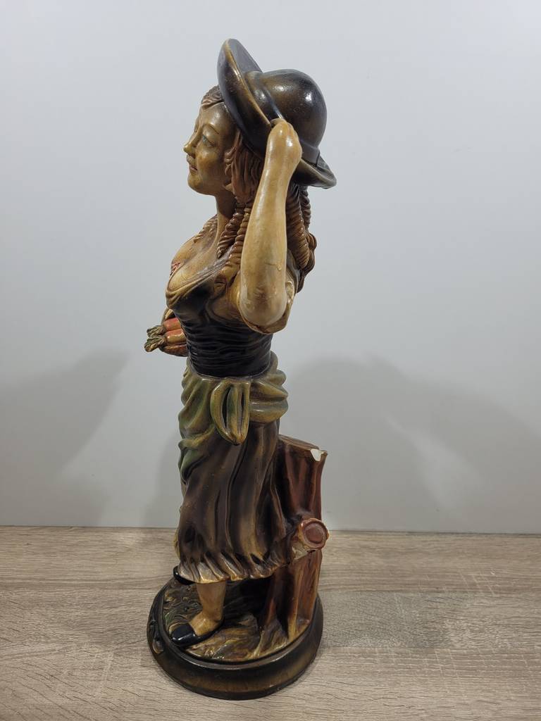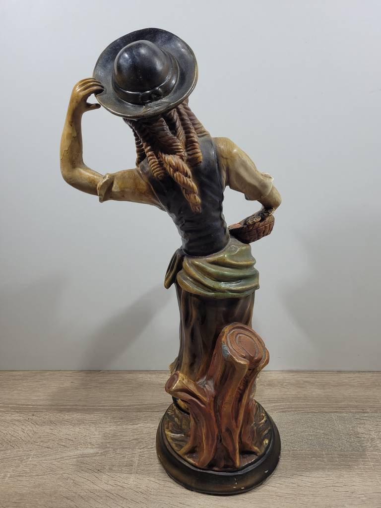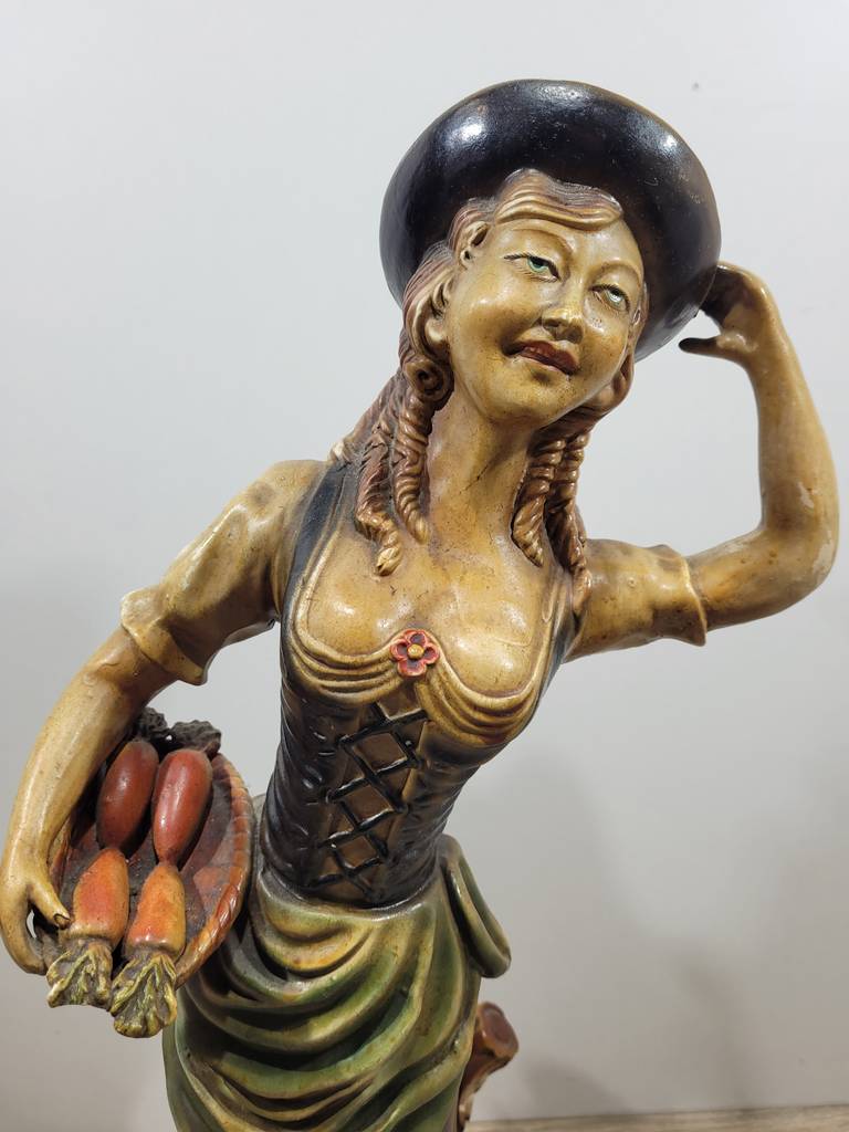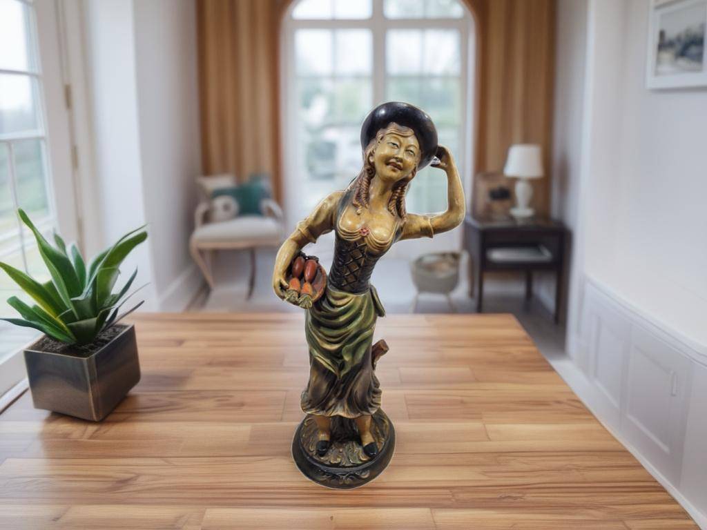 Ref. ✅ O9211 Esta es una figura decorativa vintage que representa a una mujer con atuendo tradicional o campesino, una pieza ideal para coleccionistas o amantes de la decoración retro. Añada un toque de encanto rústico y elegancia clásica a su hogar con esta hermosa figura decorativa. La pieza presenta a una mujer con un detallado traje tradicional, sosteniendo una cesta de frutas, capturada en una pose dinámica y expresiva. Pintada a mano con una rica paleta de colores (verdes, amarillos y ocres) que resaltan el relieve de la vestimenta y la expresión del rostro.