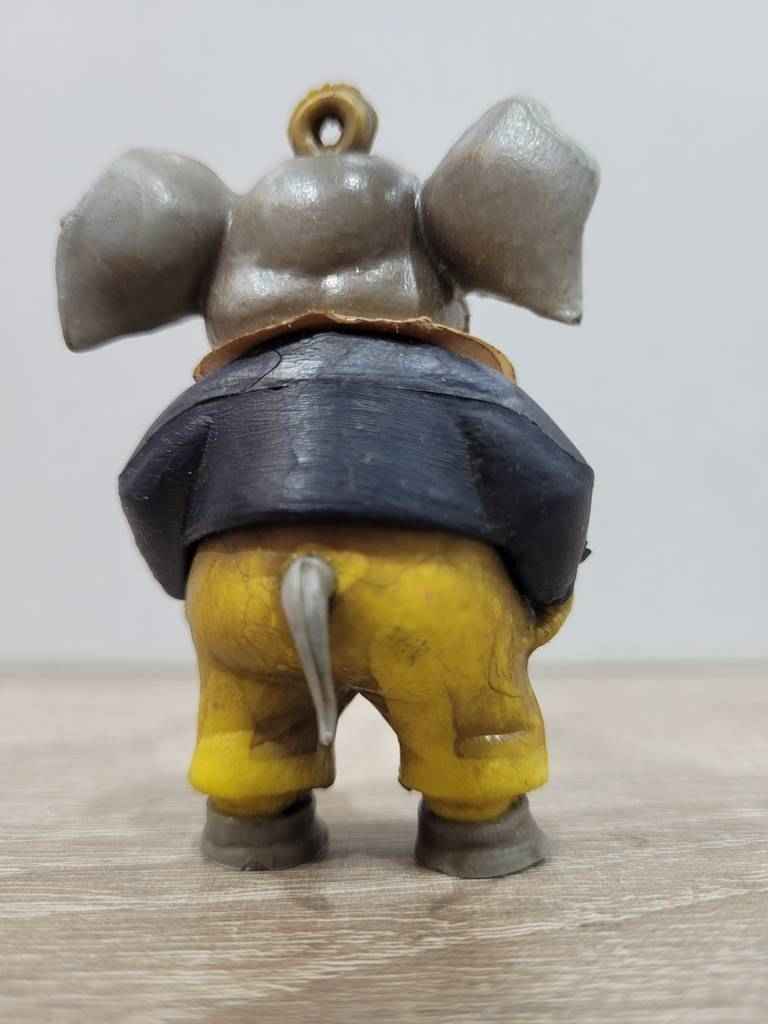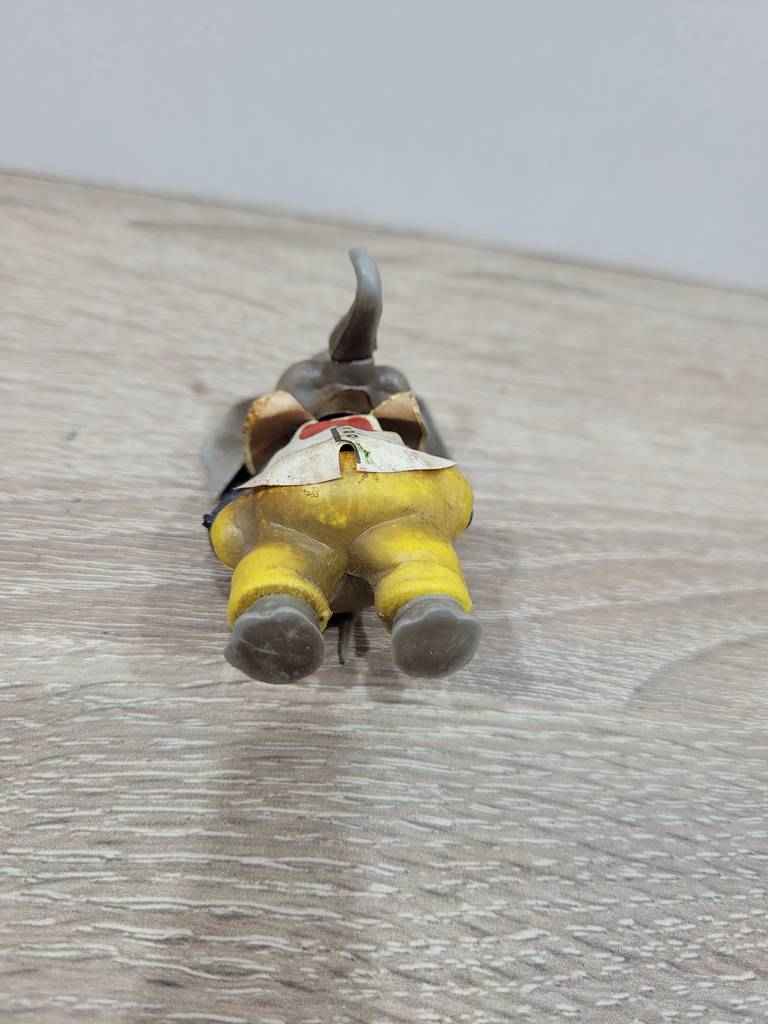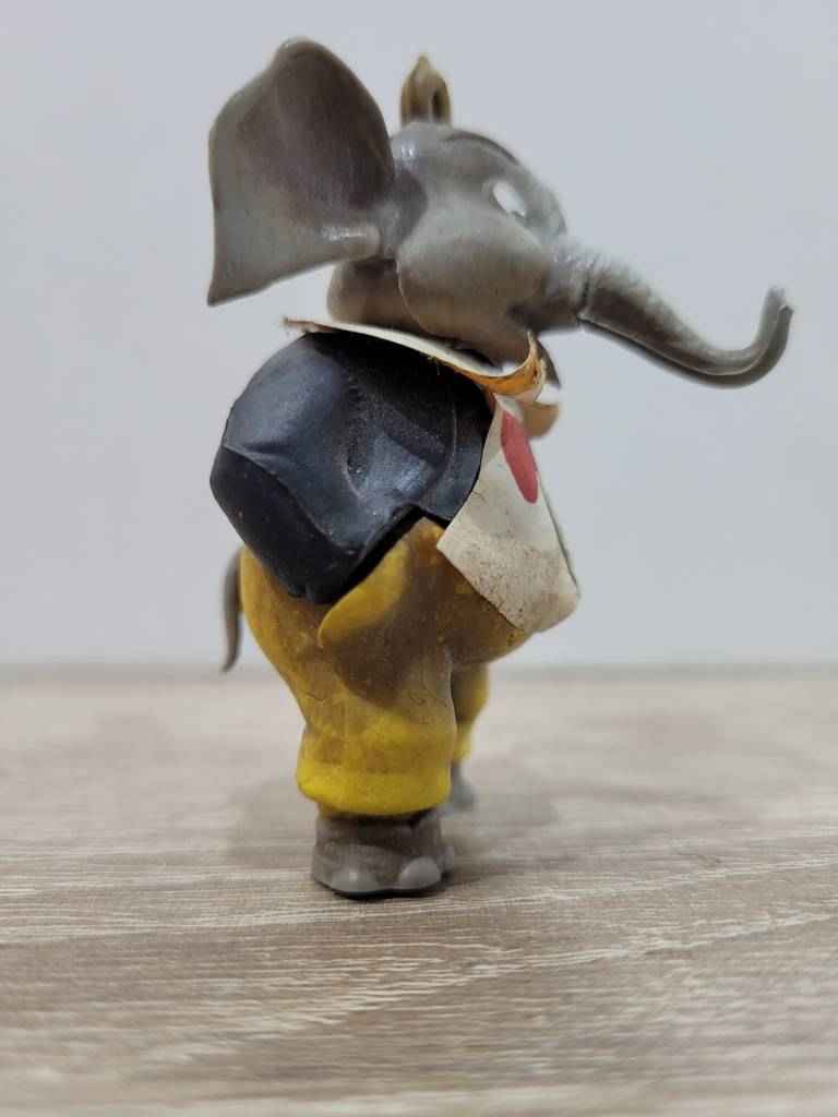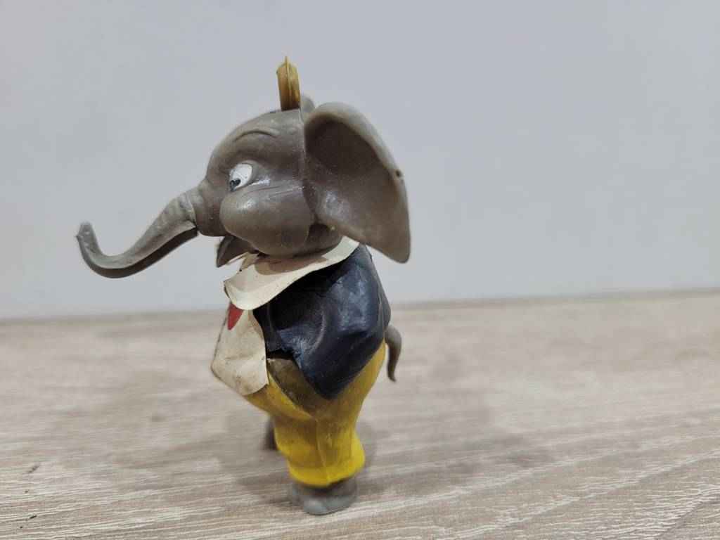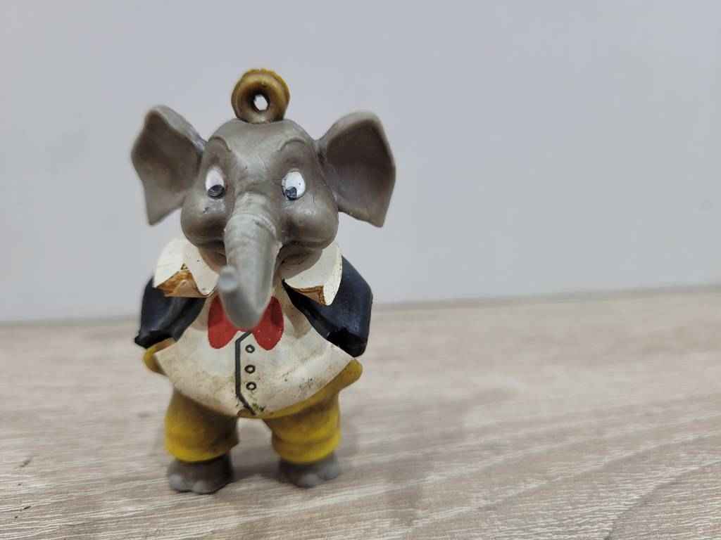 Figura de estilo vintage en la que podemos observar a un elefante vestido con ropajes de época a dos patas y con sus manos metidas en los bolsillos. Se trata de una pieza de colección única. En la parte superior dispone de un pequeño agujero ideal para colgarla en cualquier lugar. Como podemos observar en las fotografías la figura se encuentra algo desgastada.