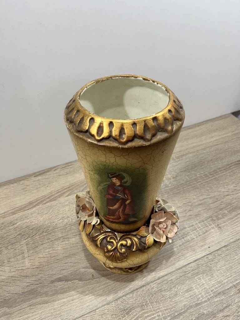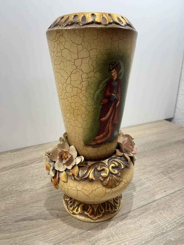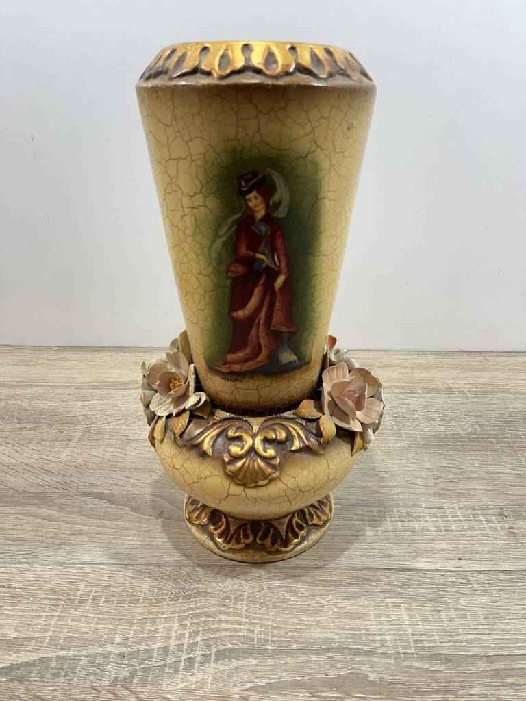 Jarrón hecho de cerámica de buena calidad y de época. Con un diseño único. Su parte superior con detalles en dorado. En el centro tenemos un precioso dibujo de una señora vestida con un vestido de época. La parte inferior con cuatro flores de color rosa claro y detalles dorado. Ideal para decoración del hogar, o colocar unas bonitas flores en él.