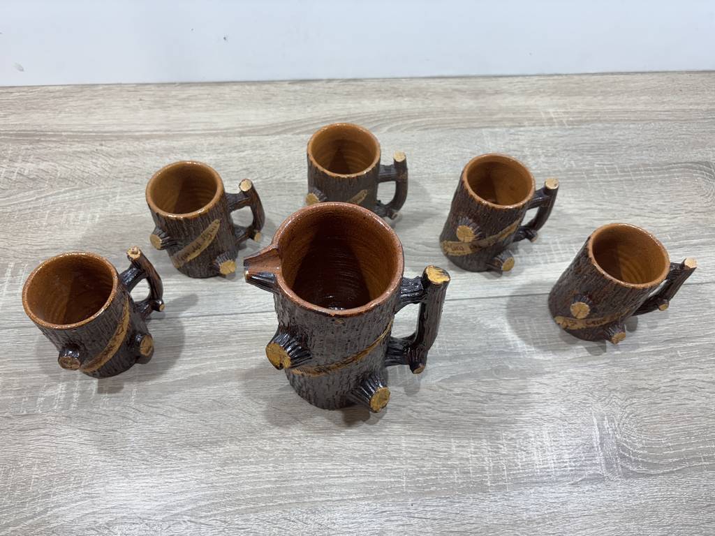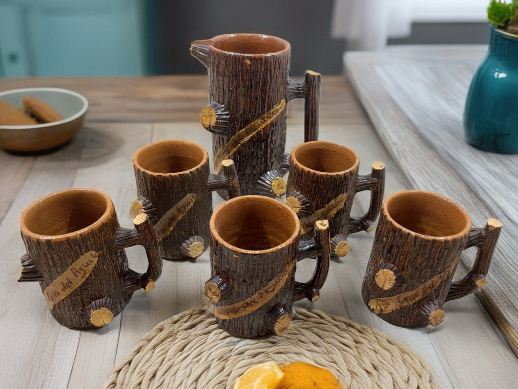 Ref. ✅ O8747 Este es un hermoso y rústico juego de jarras y tazas de cerámica, ideal para quienes aprecian la artesanía y los diseños inspirados en la naturaleza. Cada pieza está meticulosamente elaborada para imitar la corteza de un tronco de árbol, con detalles en relieve que simulan la textura de la madera y nudos en las ramas que sirven como asas. El juego se compone de una jarra y seis tazas, todas con un diseño detallado que imita un tronco de árbol. Hechas de cerámica, estas piezas son duraderas y funcionales. Son aptas para bebidas como café, té, leche o vino, y también pueden ser utilizadas como objetos decorativos.