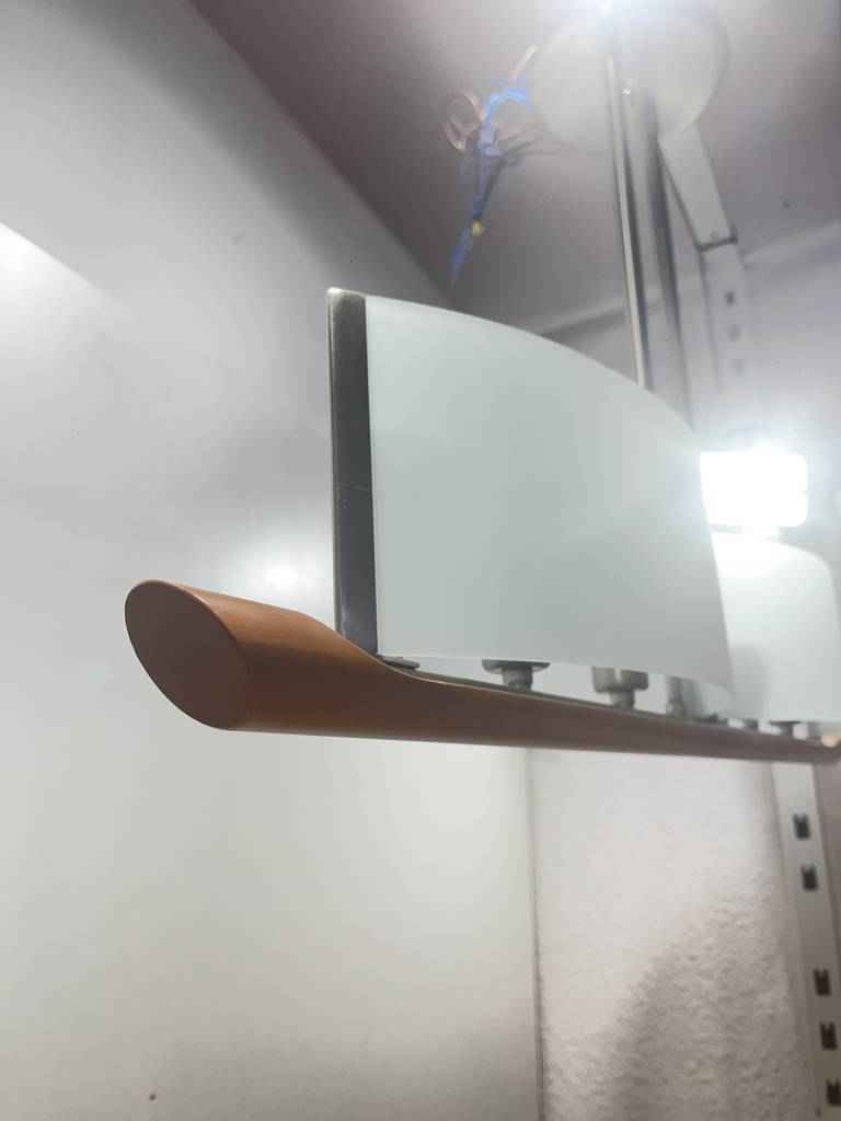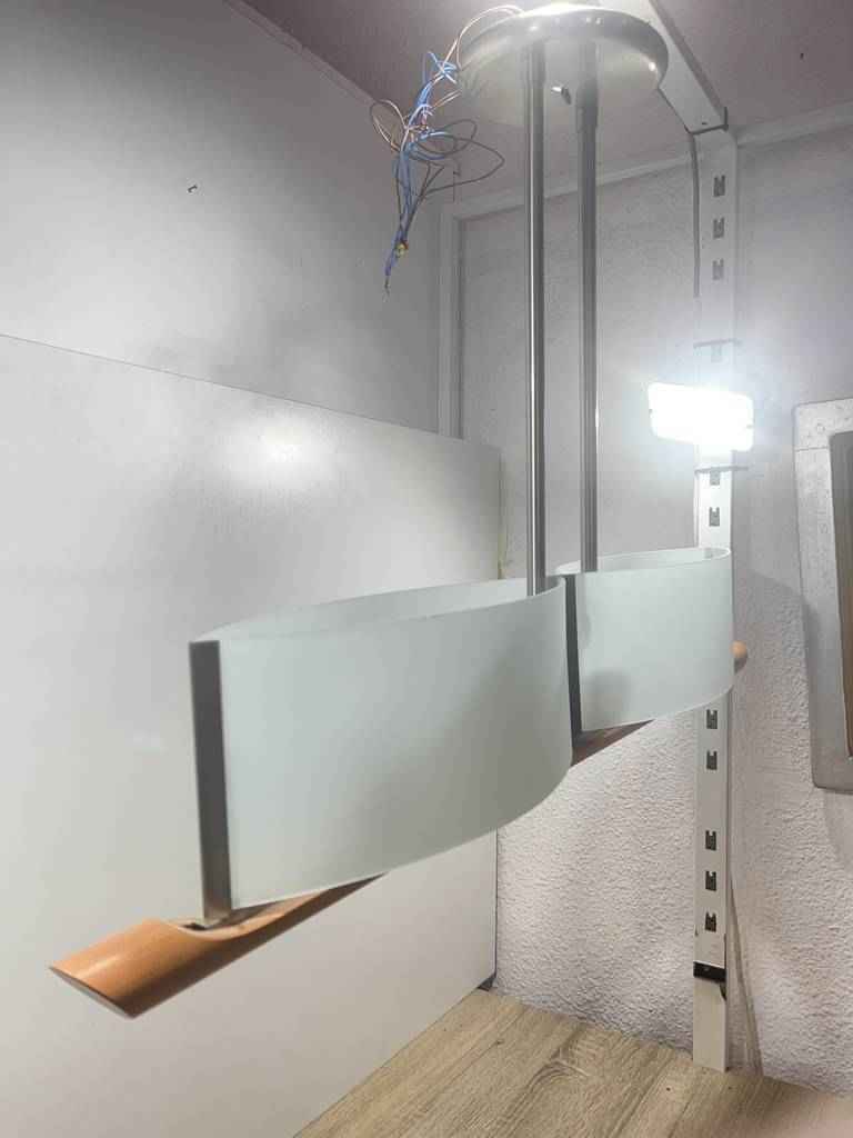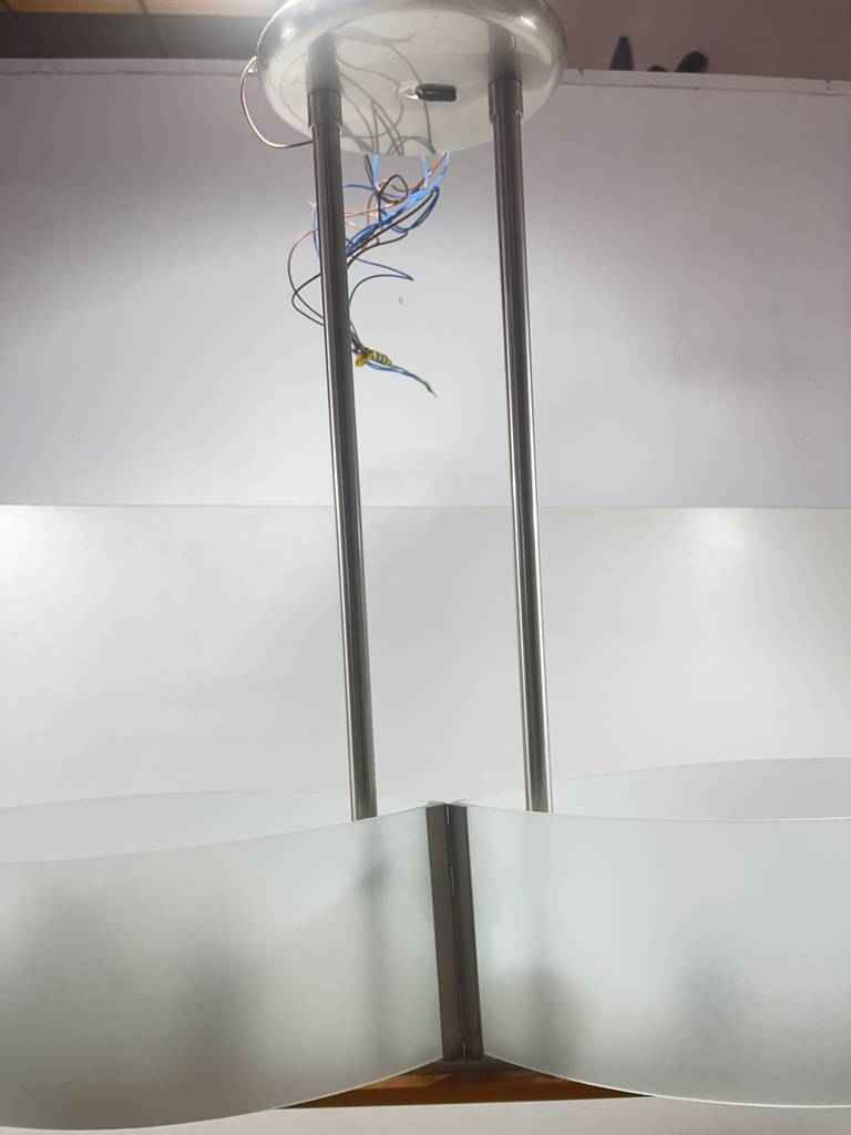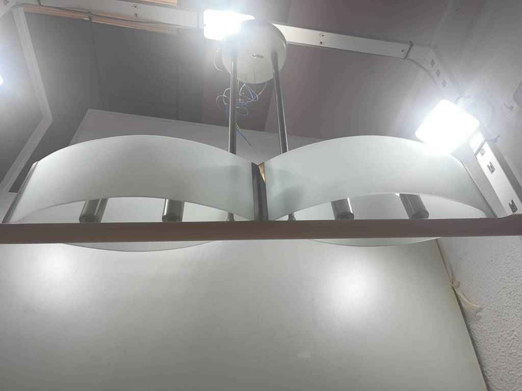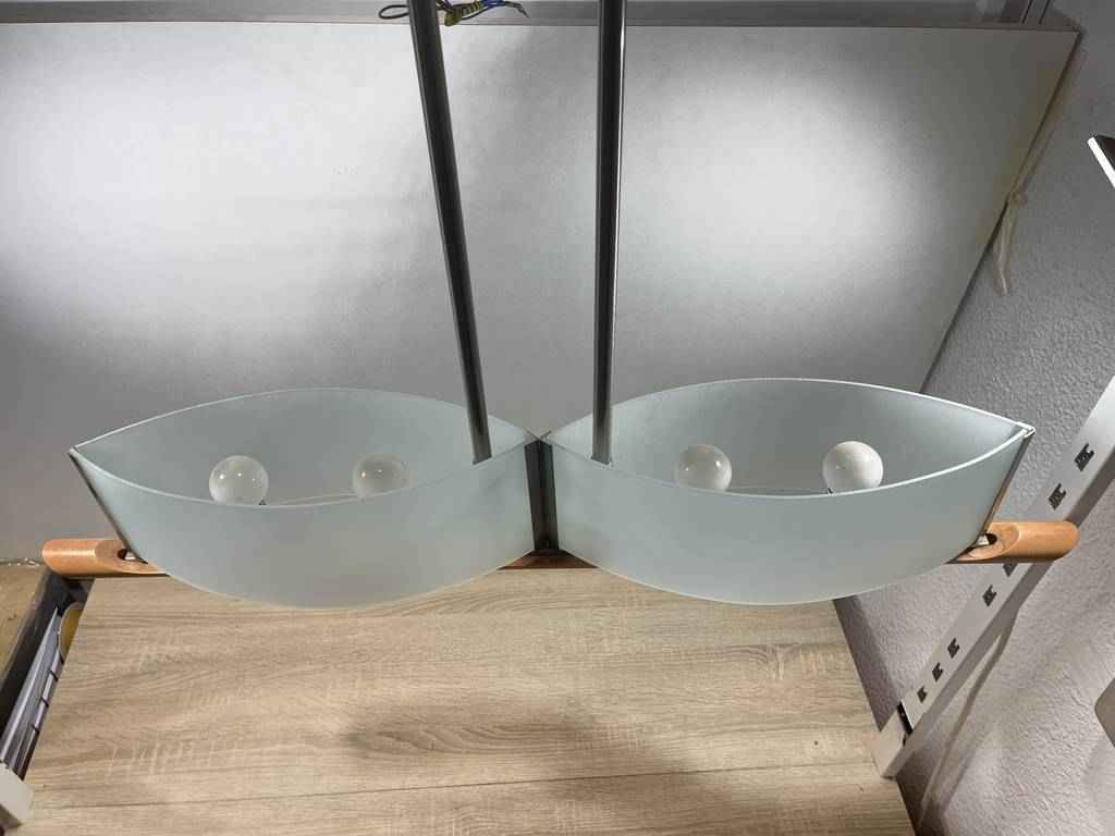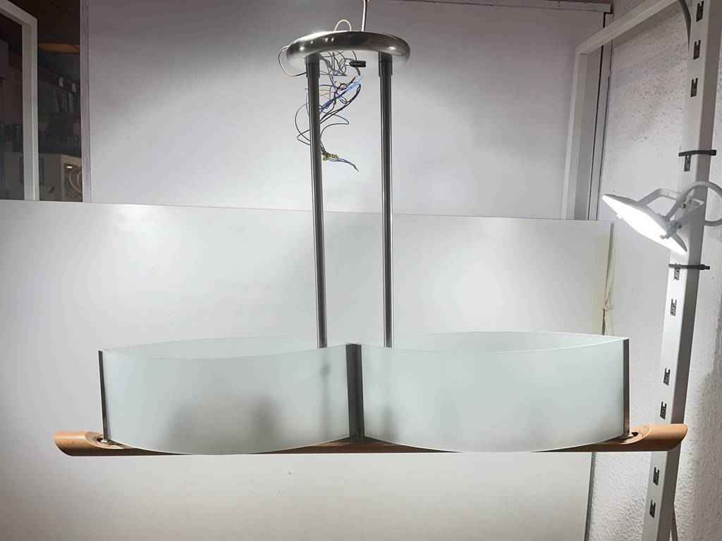 Lámpara colgante de estilo moderno. Dispone de una estructura de metal que en la parte central tiene cuatro puntos de luz rodeado por dos tulipas de cristal opaco en el que podemos colocar cuatro bombillas por tulipa. Sujeta una barra de madera de buena calidad. Es una lámpara ideal para colocar en un salón comedor y hacerlo resaltar.
