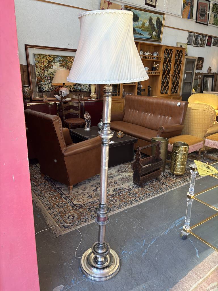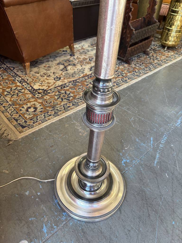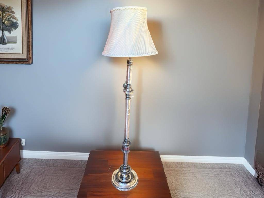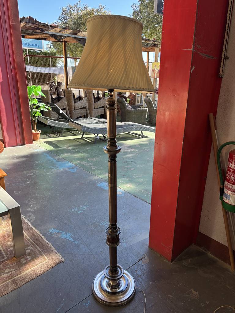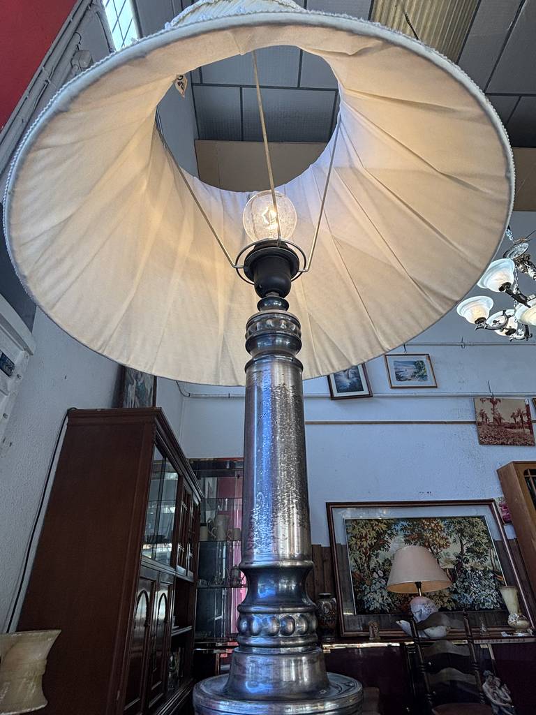 Ref. ✅ O8751 Elegante y atemporal lámpara de pie que añade un toque de sofisticación a cualquier espacio. Su diseño vintage, con una base y un cuerpo de metal plateado, presenta detalles torneados y una pantalla de tela plisada de color claro que difunde una luz cálida y acogedora. Es ideal para crear un ambiente cálido y suave en salones, dormitorios o rincones de lectura. Se encuentra en buen estado de conservación, mostrando pátina y ligero desgaste acorde a su antigüedad.