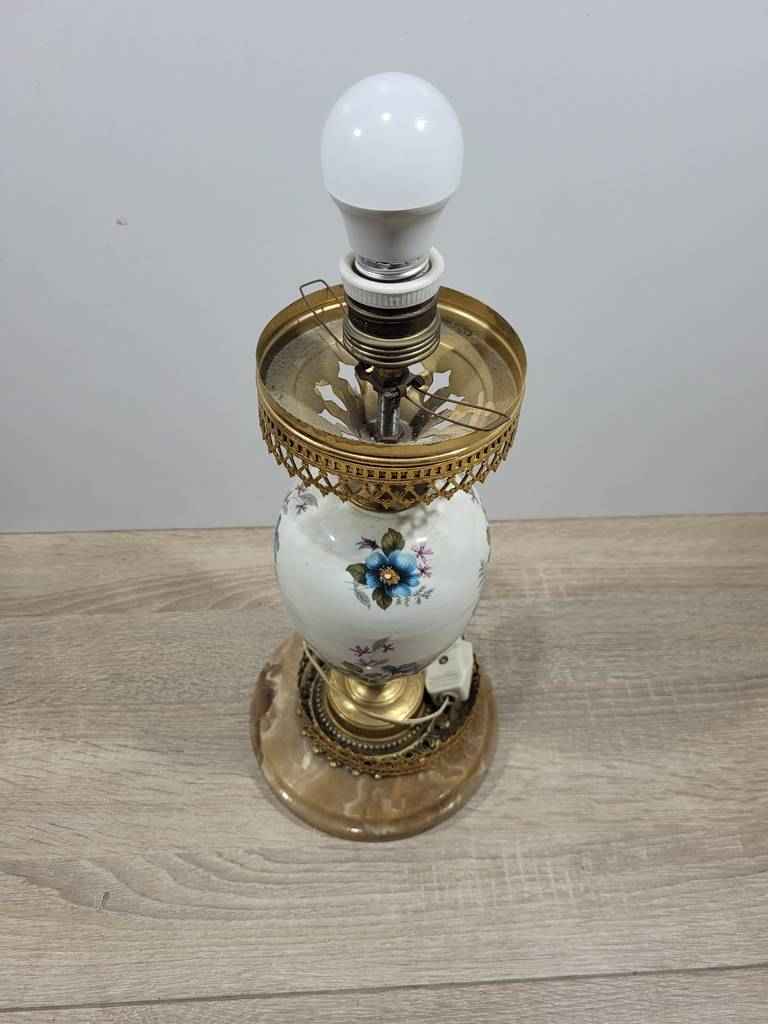 Lámpara de mesa de estilo vintage que dispone de una parte superior e inferior de bronce brillante que la hace muy elegante. Su parte media es de porcelana y tiene pintadas unas bonitas flores azules que están sobre fondo blanco. En la parte superior dispone del punto de luz. Es ideal para colocar en un dormitorio o un salón comedor. Se enciende y apaga fácilmente gracias a su interruptor adherido al cable.